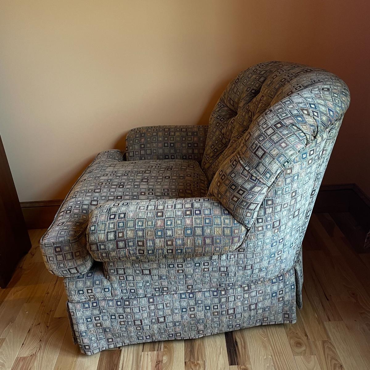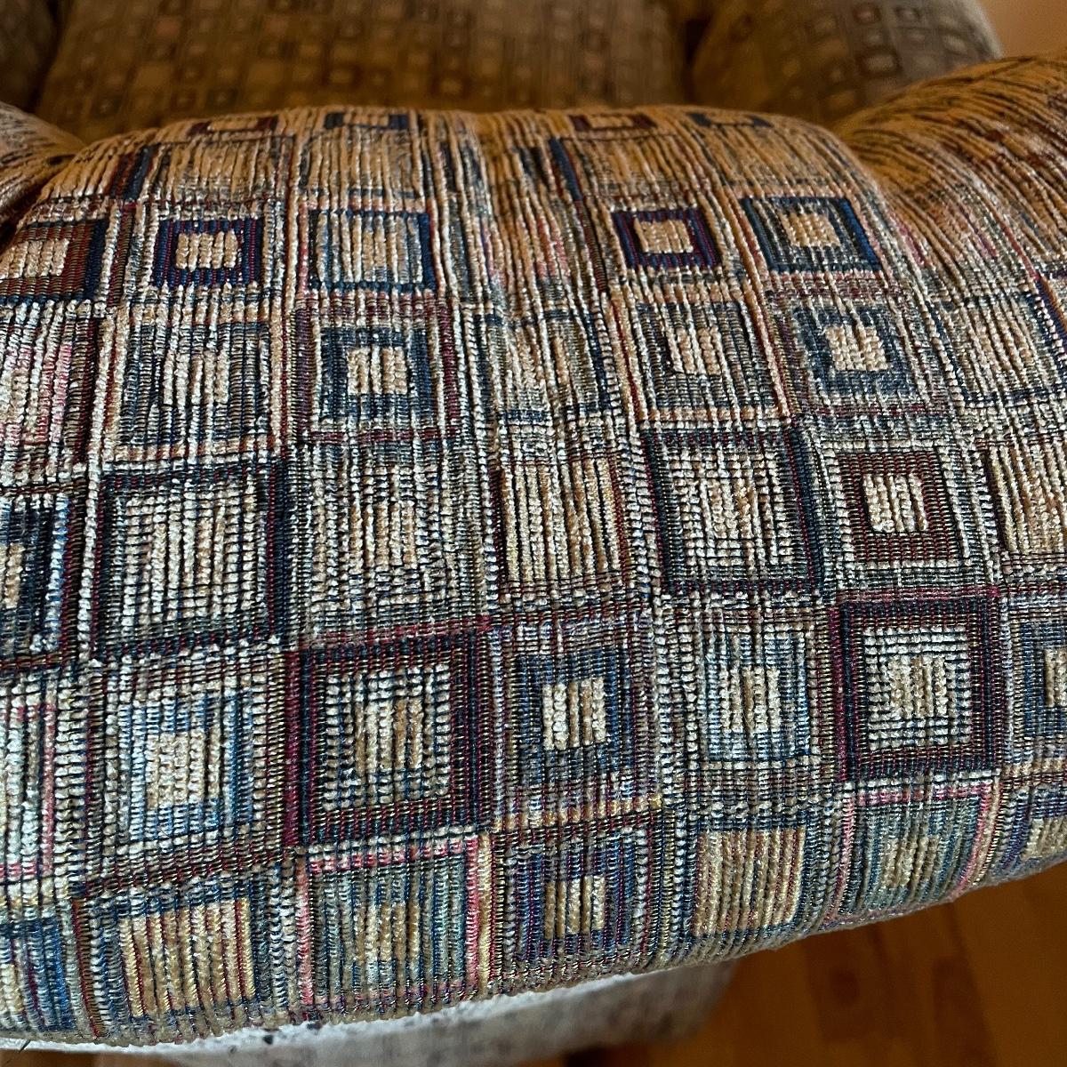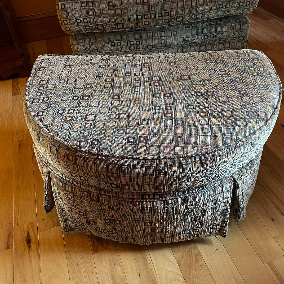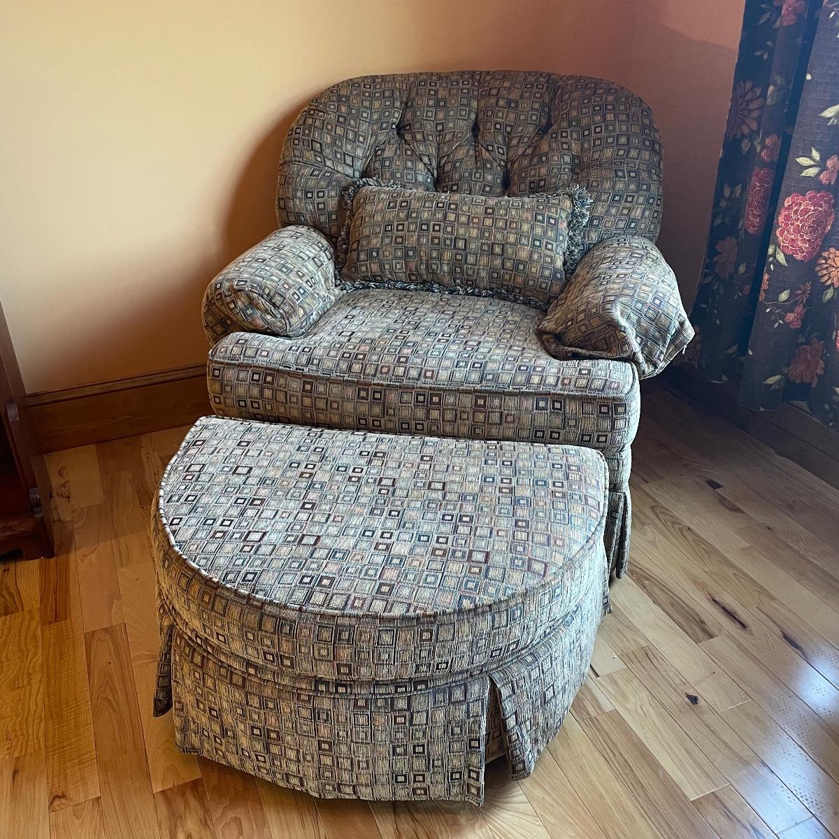 A cozy upholstered arm chair with rolling semi circular ottoman to keep you comfortable with your book or favorite show. The chair is equipped with a matching accessory pillow and arm covers. This piece shows sun bleaching and has darker browns found throughout the chair. Between the way this piece has aged and the style of upholstery, it carries that distressed look that is so popular right now. As for comfort and condition, this piece is great! The wheels on the ottoman roll smoothly and the chair is just so hard to get out of! Chair measures approximately 38” x 36” x 34” with a seat height at 18.5”. The ottoman measures 30” x 20.5” x 15”. Please come to the preview to check out this comfortable piece! Local pick up only. Please bring help to load, these items are located upstairs.