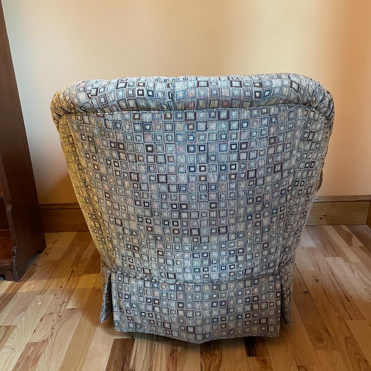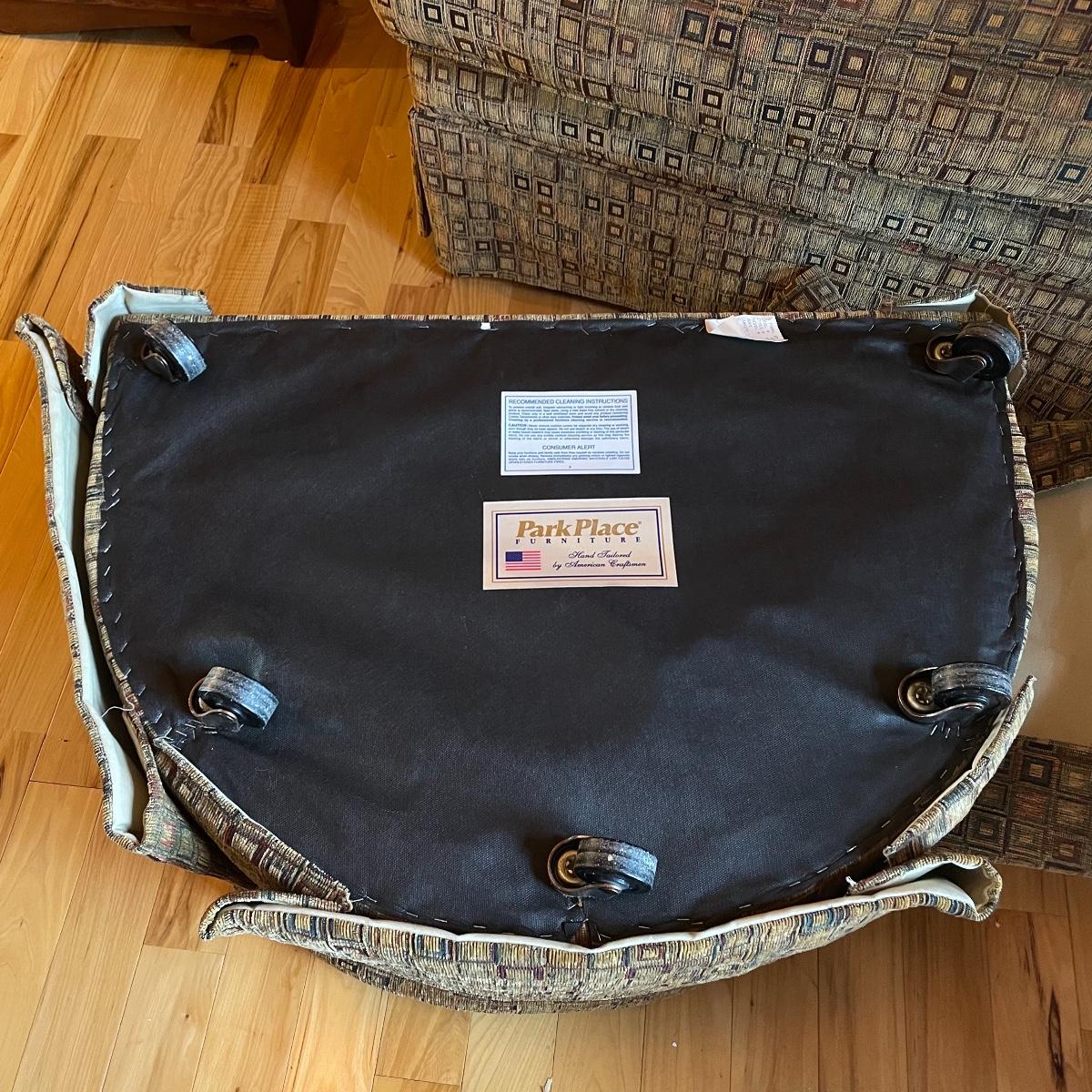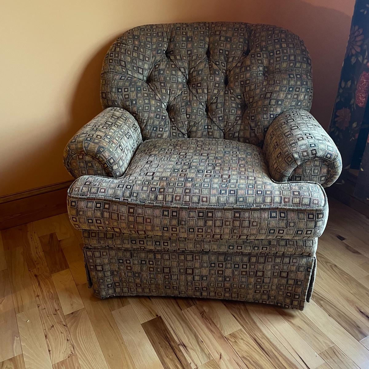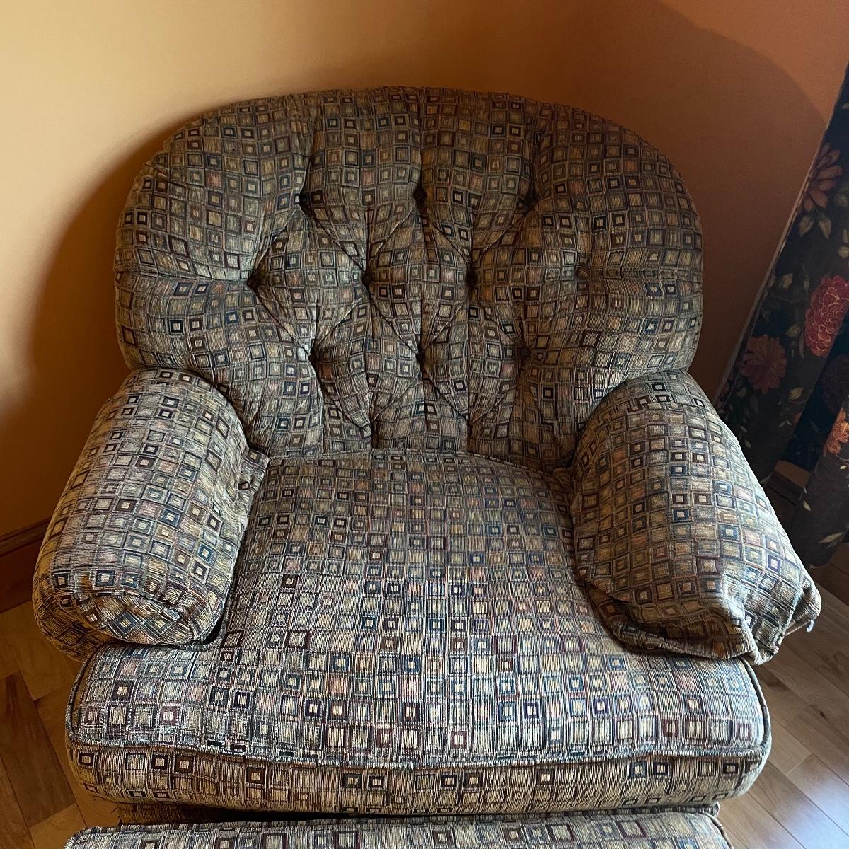 A cozy upholstered arm chair with rolling semi circular ottoman to keep you comfortable with your book or favorite show. The chair is equipped with a matching accessory pillow and arm covers. This piece shows sun bleaching and has darker browns found throughout the chair. Between the way this piece has aged and the style of upholstery, it carries that distressed look that is so popular right now. As for comfort and condition, this piece is great! The wheels on the ottoman roll smoothly and the chair is just so hard to get out of! Chair measures approximately 38” x 36” x 34” with a seat height at 18.5”. The ottoman measures 30” x 20.5” x 15”. Please come to the preview to check out this comfortable piece! Local pick up only. Please bring help to load, these items are located upstairs.