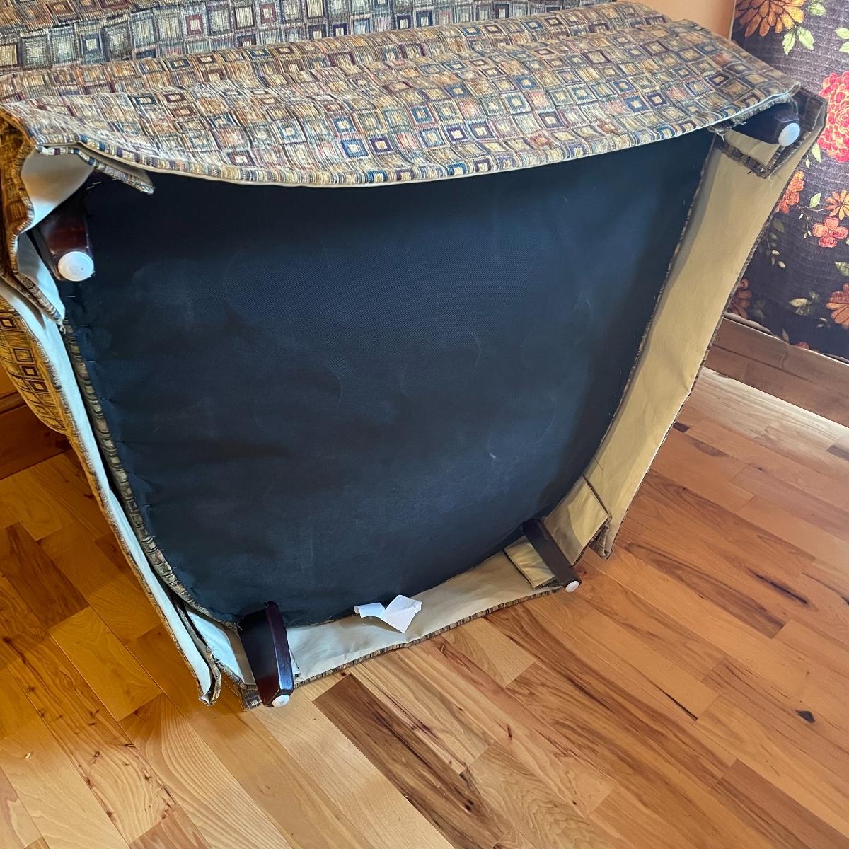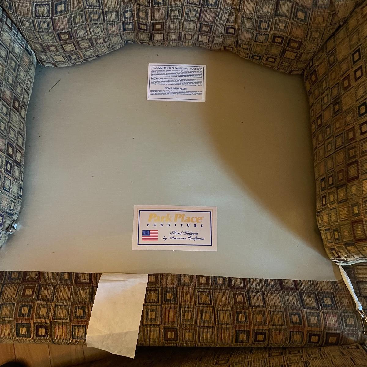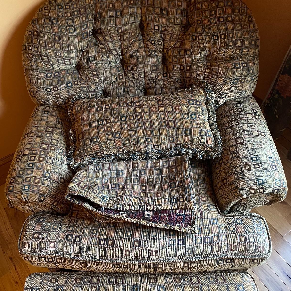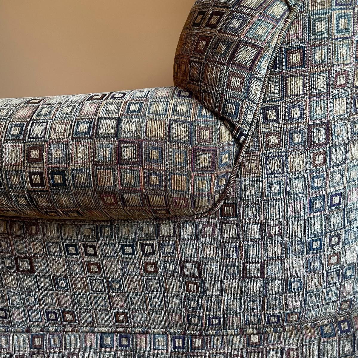 A cozy upholstered arm chair with rolling semi circular ottoman to keep you comfortable with your book or favorite show. The chair is equipped with a matching accessory pillow and arm covers. This piece shows sun bleaching and has darker browns found throughout the chair. Between the way this piece has aged and the style of upholstery, it carries that distressed look that is so popular right now. As for comfort and condition, this piece is great! The wheels on the ottoman roll smoothly and the chair is just so hard to get out of! Chair measures approximately 38” x 36” x 34” with a seat height at 18.5”. The ottoman measures 30” x 20.5” x 15”. Please come to the preview to check out this comfortable piece! Local pick up only. Please bring help to load, these items are located upstairs.