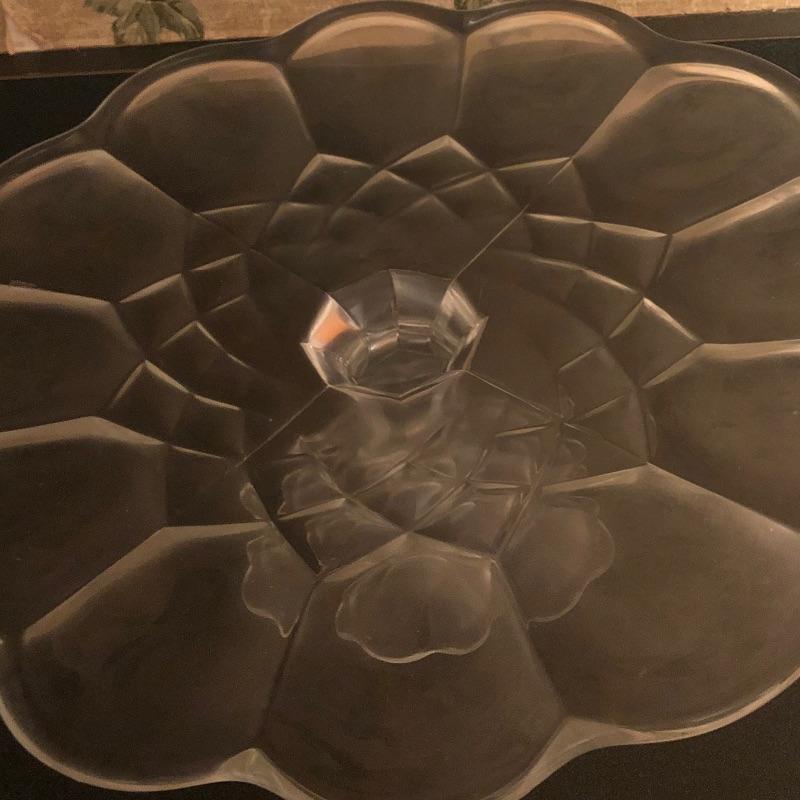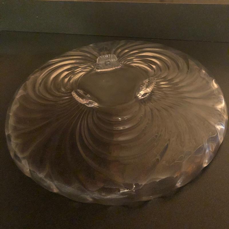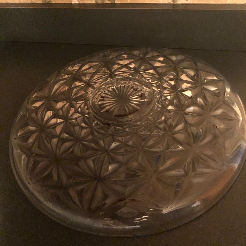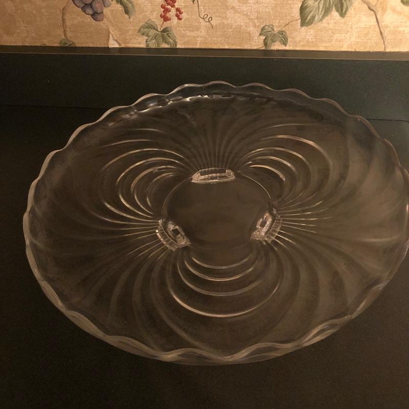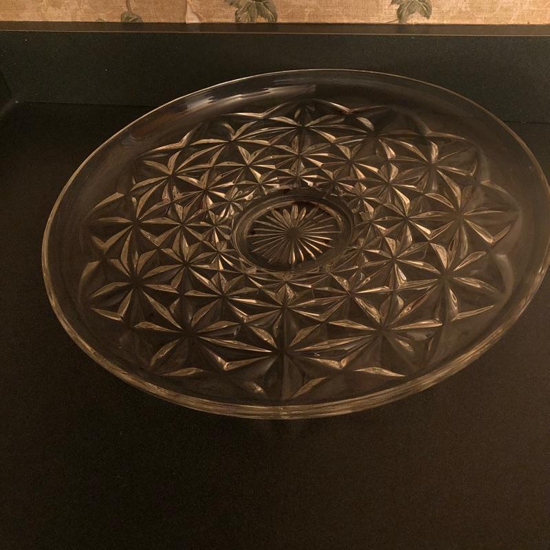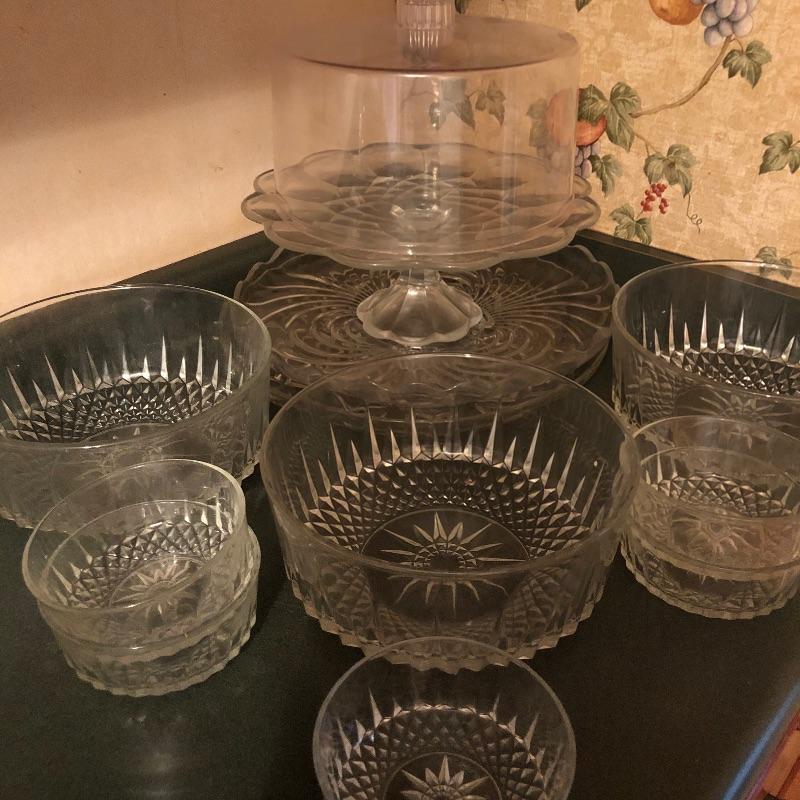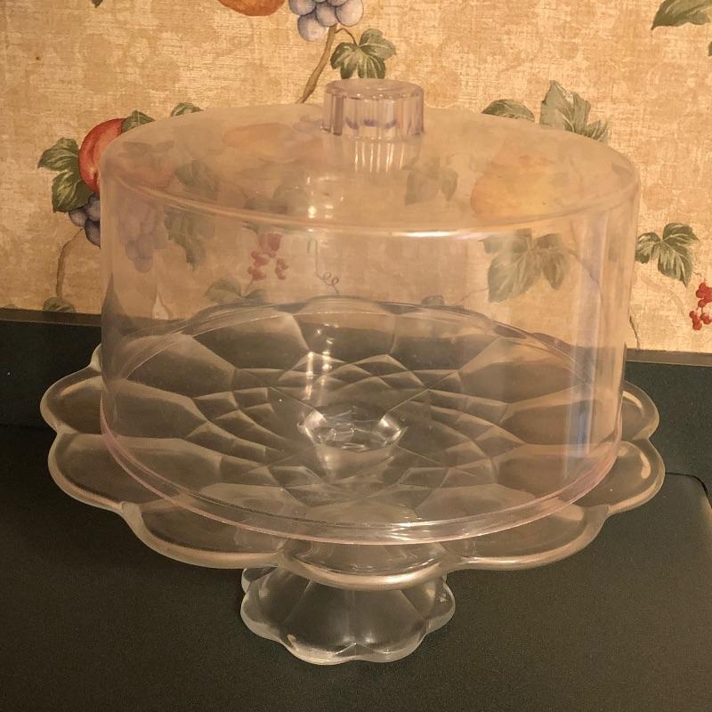 Sweet set of service ware for entertaining friends and family. Matching set of 3 large bowls and 5 small bowls will compliment the serving trays nicely. Cake stand with lid measures 11” D x 12” H. The lid shown covering the cake stand is plastic. Local pickup only.