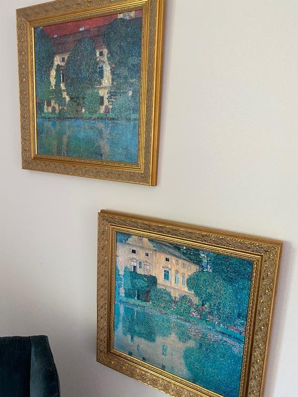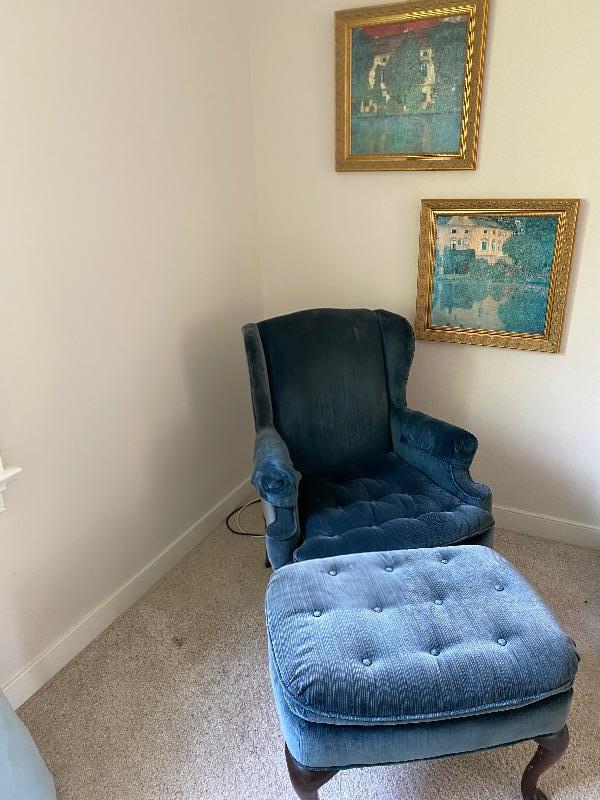 Upholster chair and ottoman with some fading with two pieces of wall art measuring 20 1/2” x 20 1/2”