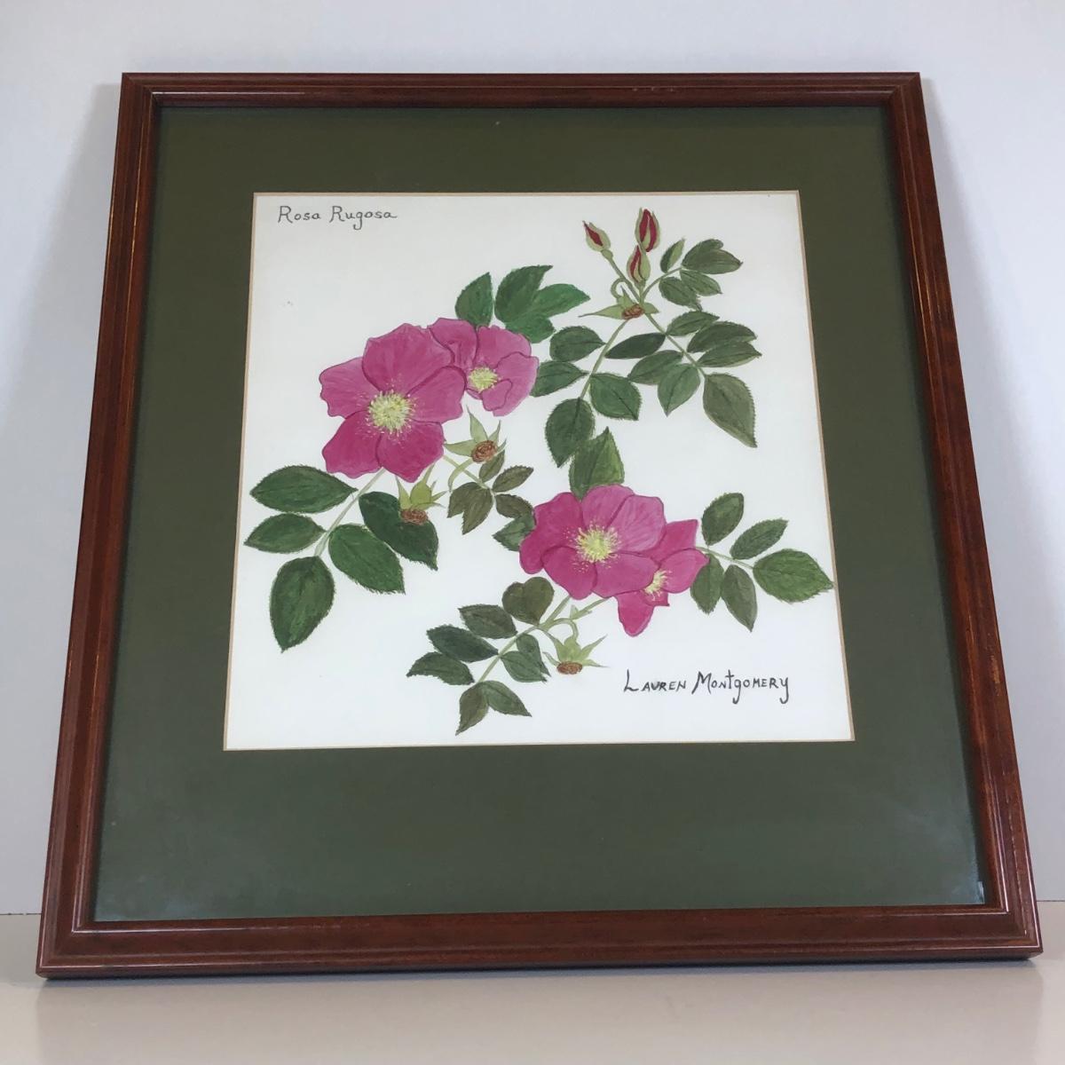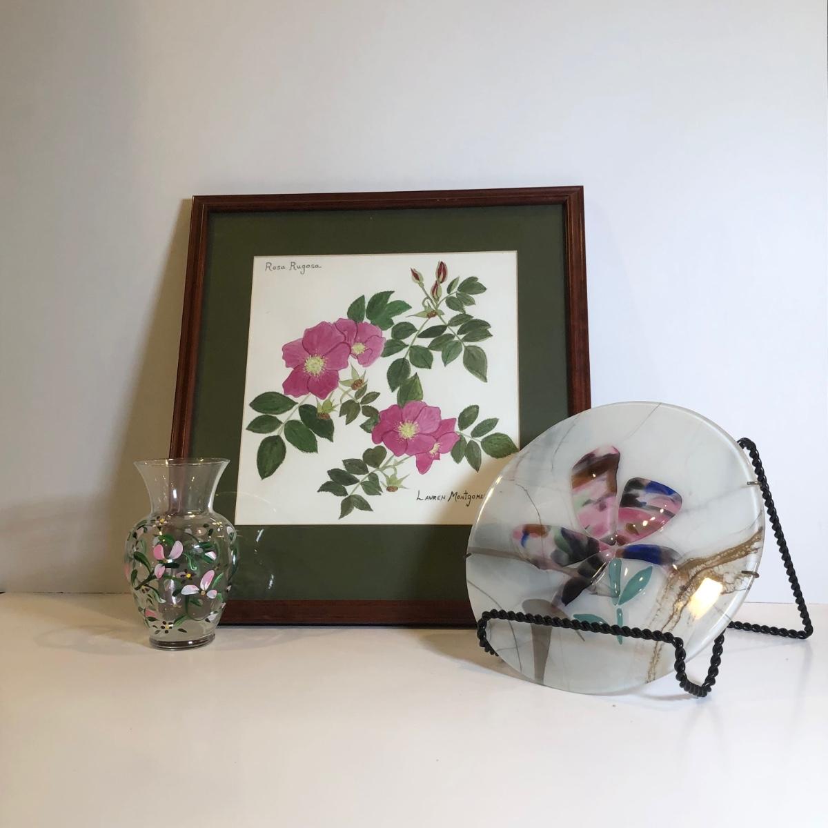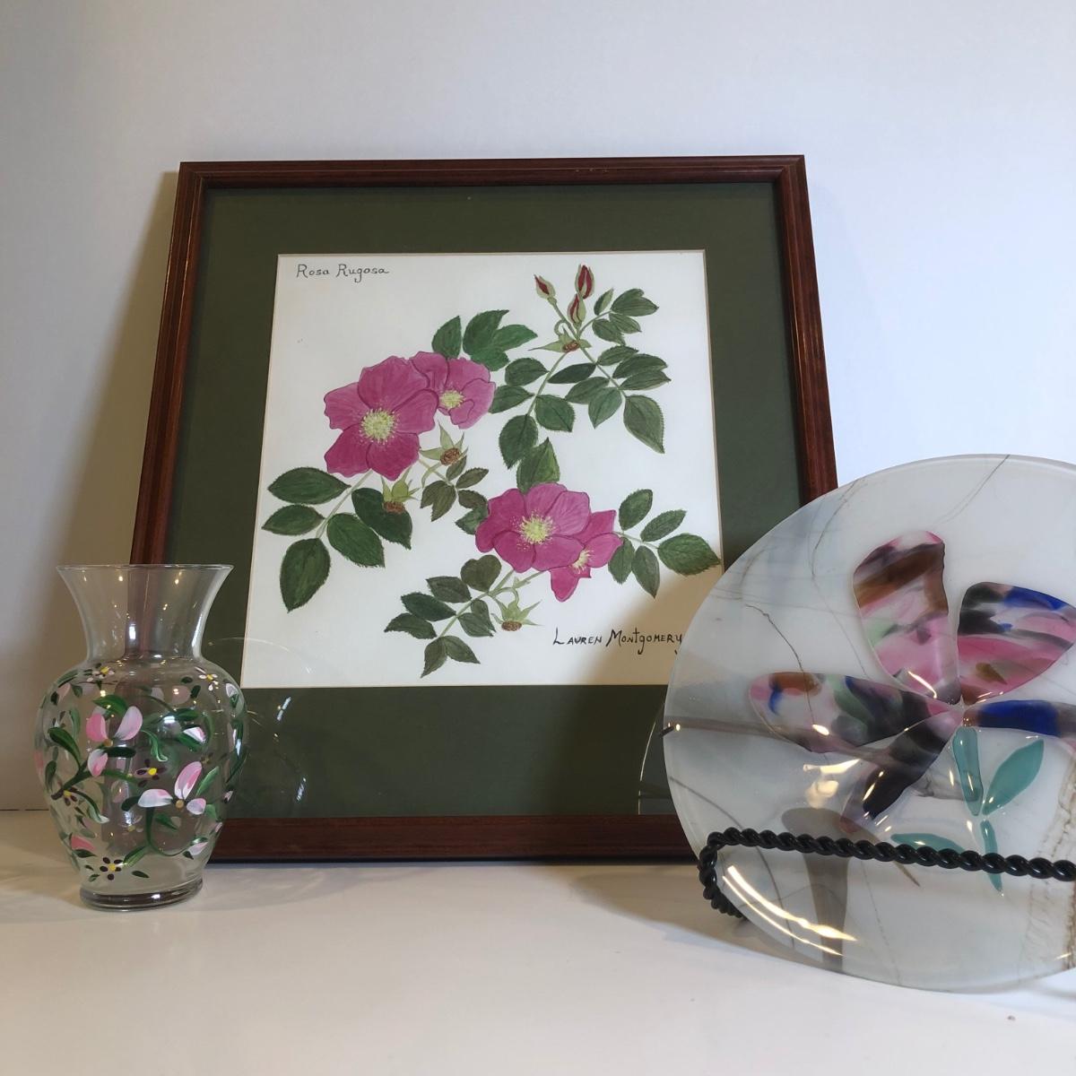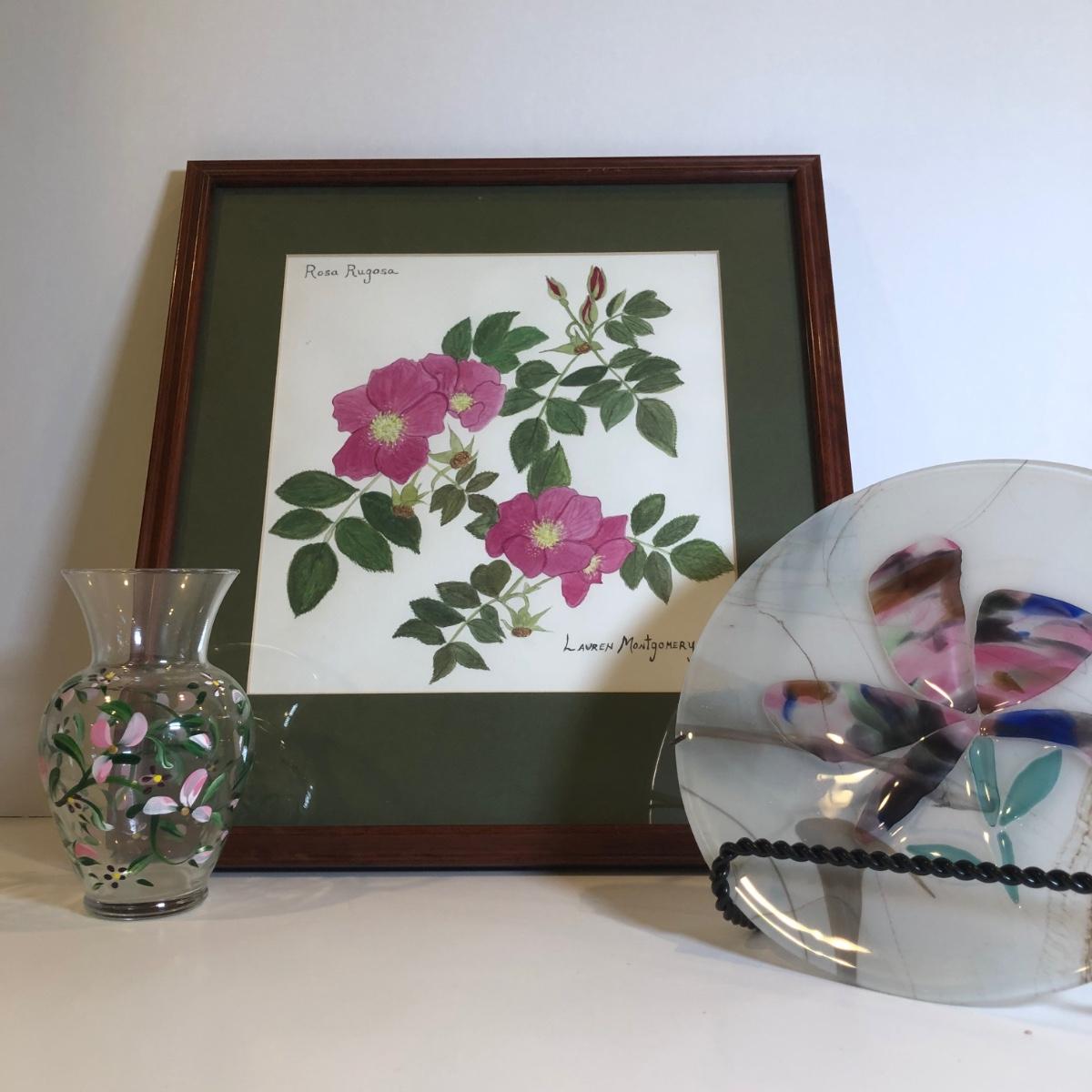 LOT 297F: Signed Lauren Montgomery "Rosa Rugosa" Artwork, Stained Art Glass Plate & Hand Painted Floral Bud Vase