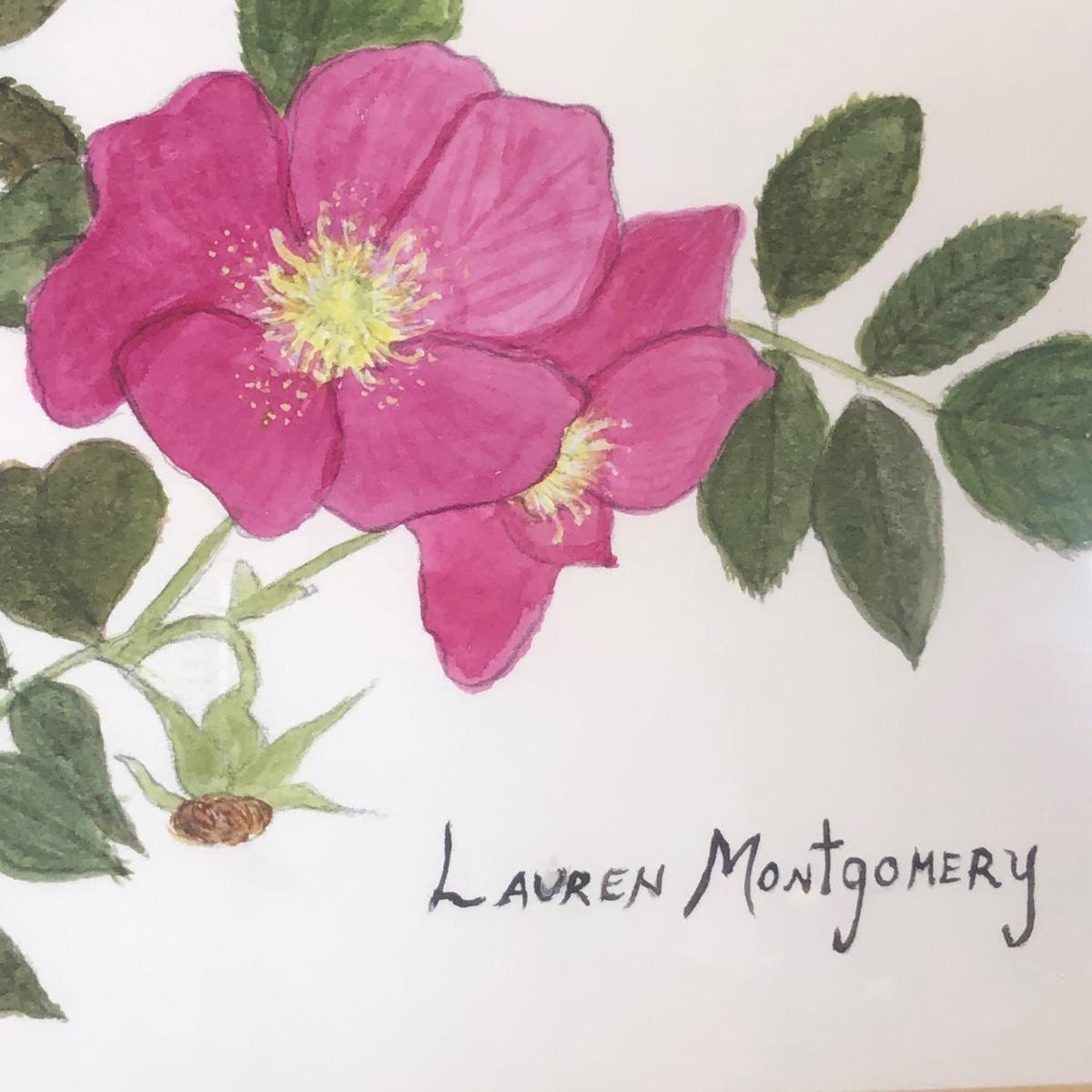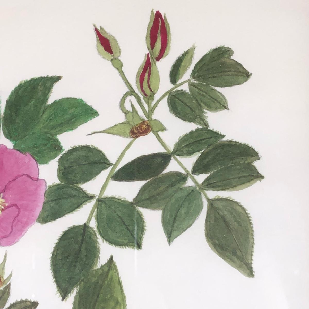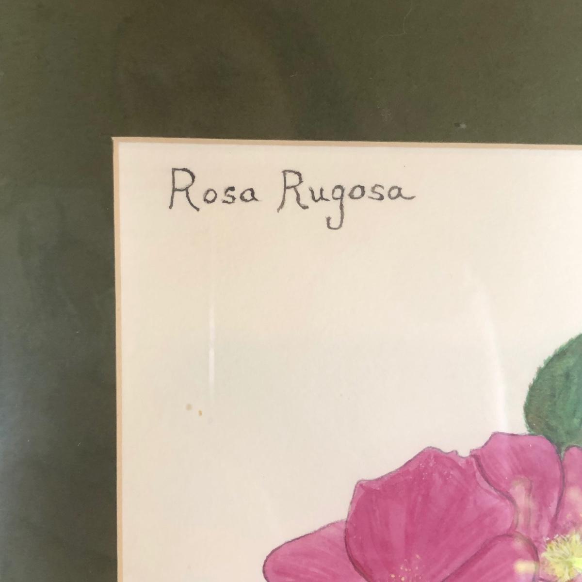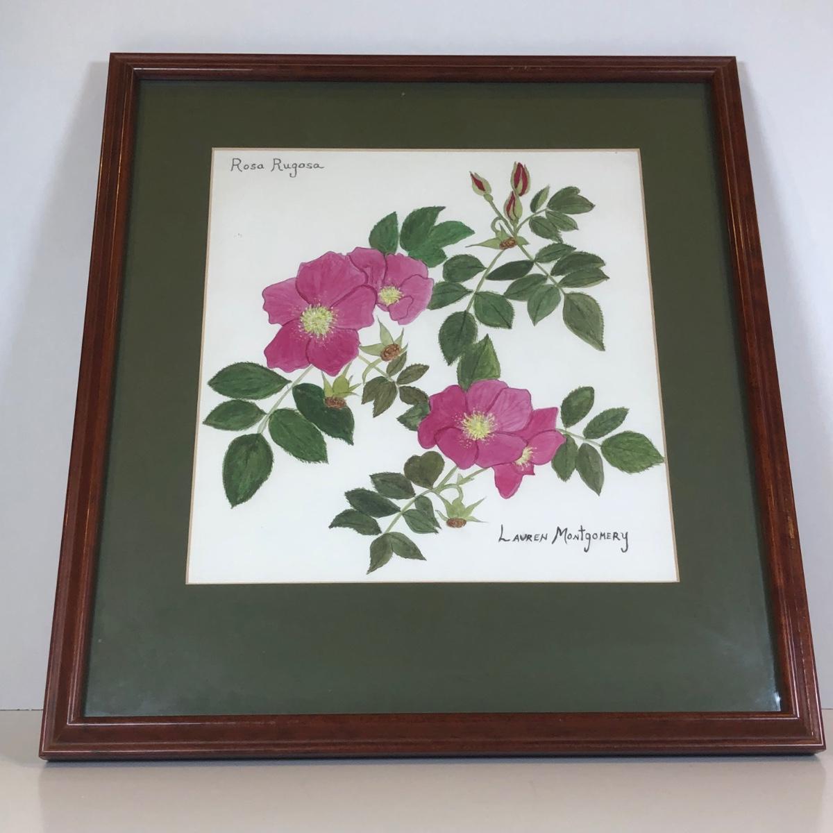 LOT 297F: Signed Lauren Montgomery "Rosa Rugosa" Artwork, Stained Art Glass Plate & Hand Painted Floral Bud Vase