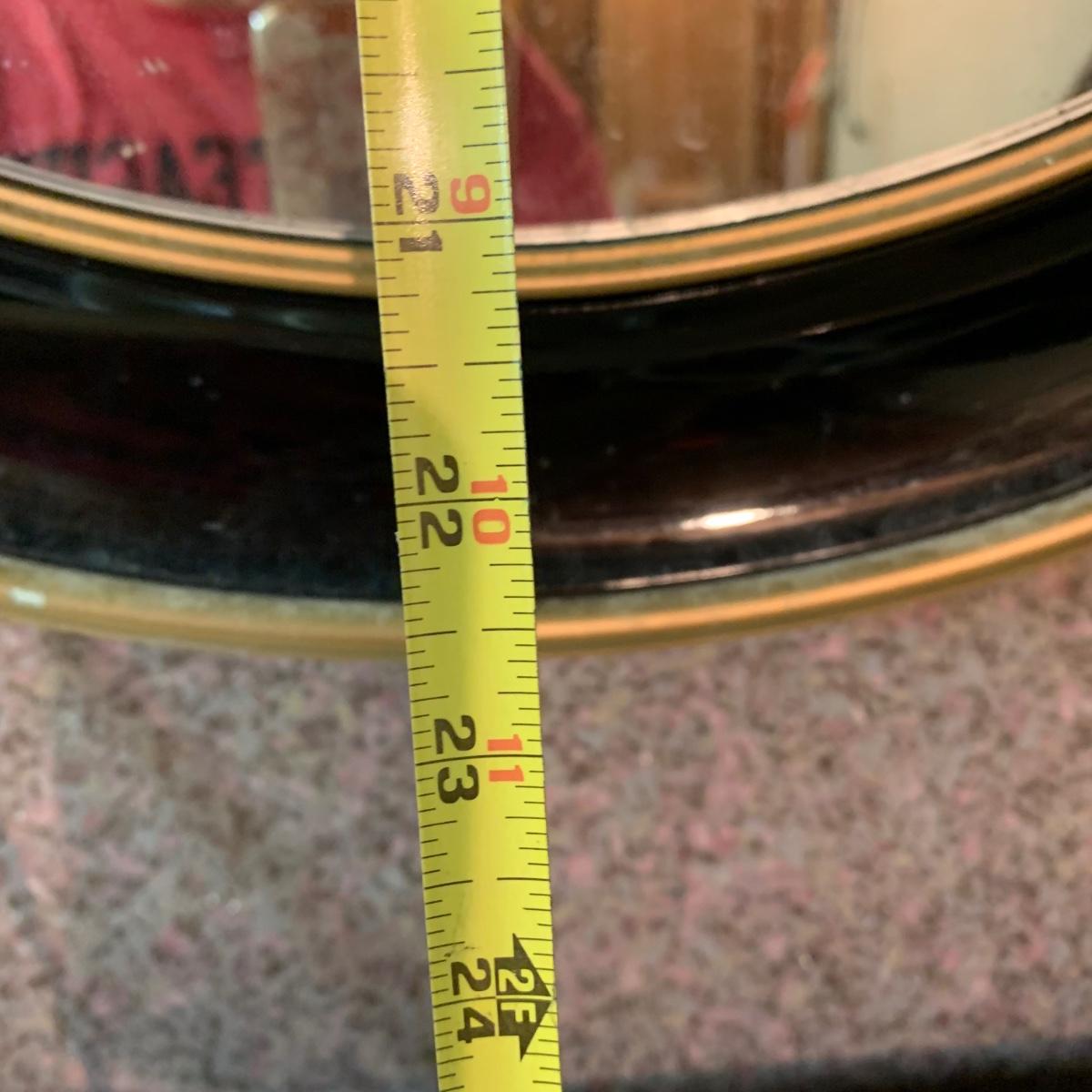 Wooden mirror measures 22.5 inches in diameter.