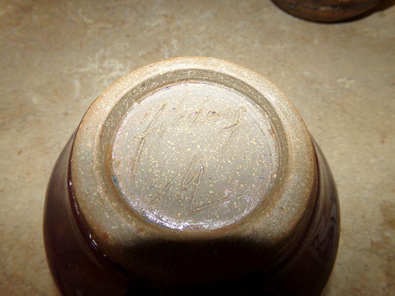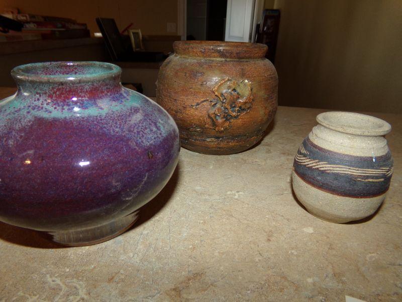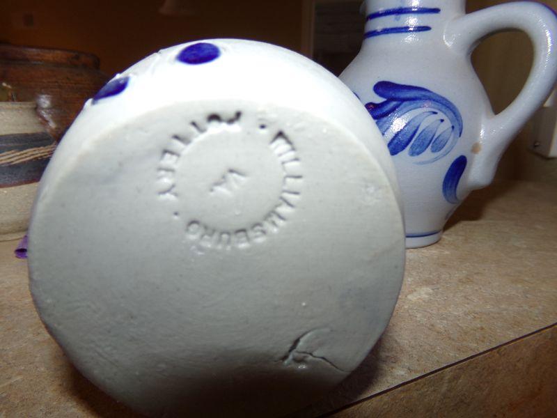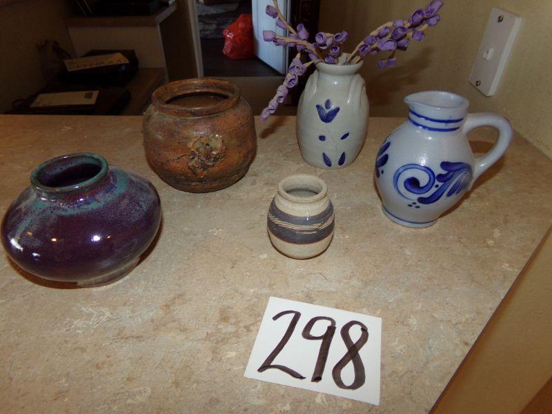 5 DIFFERENT CLAY POTS. THE BLUE AND GRAY CREAMER IS BY WILLIAMSBURG POTTERY AND DOES HAVE A SMALL CRACK IN THE BOTTOM. THE BROWN ONE IS SIGNED.