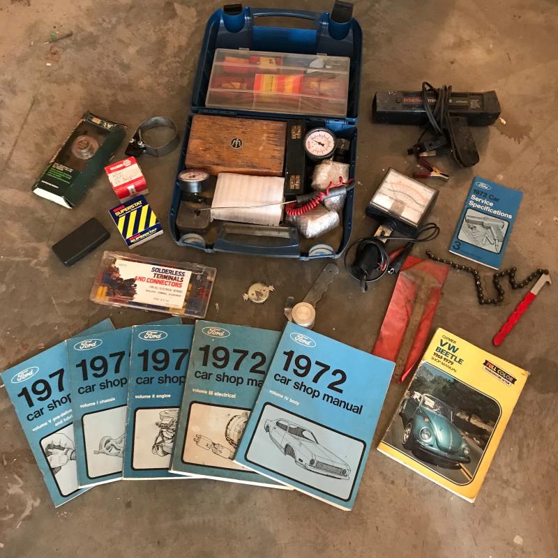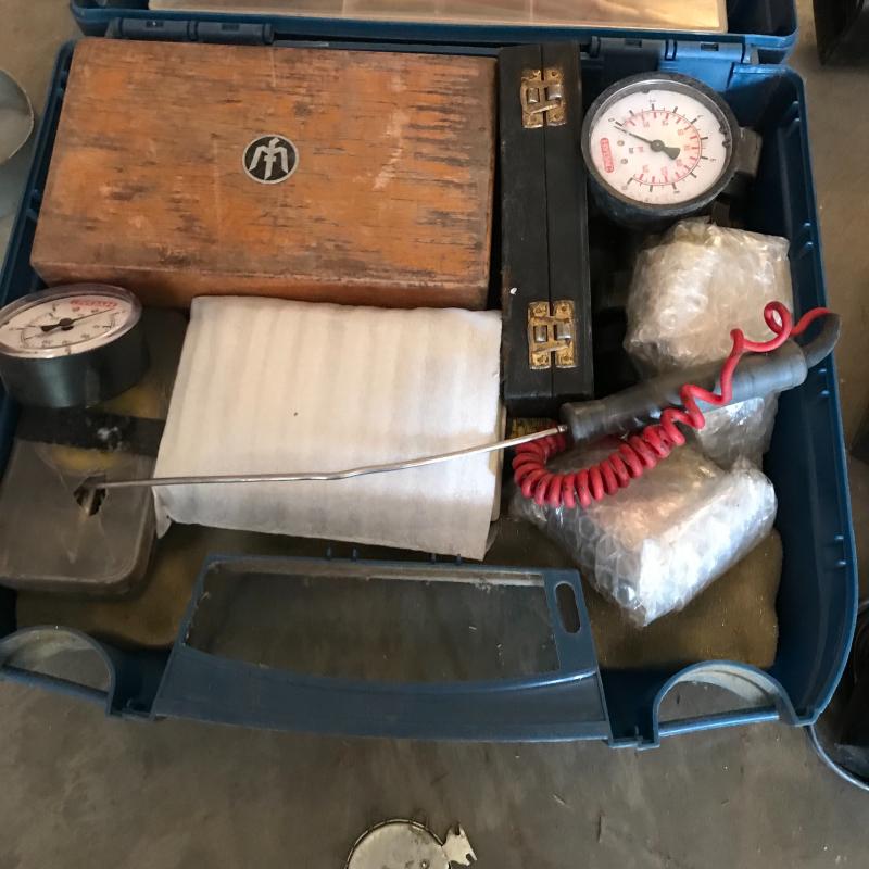 Lot contains many items for your auto repair tool box. Timing light, swell meter, gauges, manuals, former tools, thermostats and more. See pics. Local pickup only.