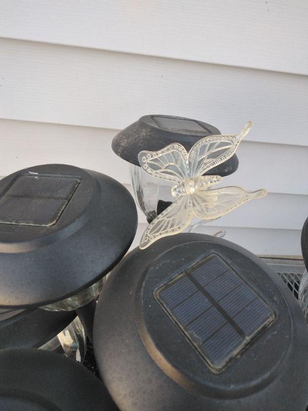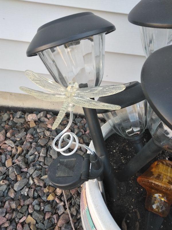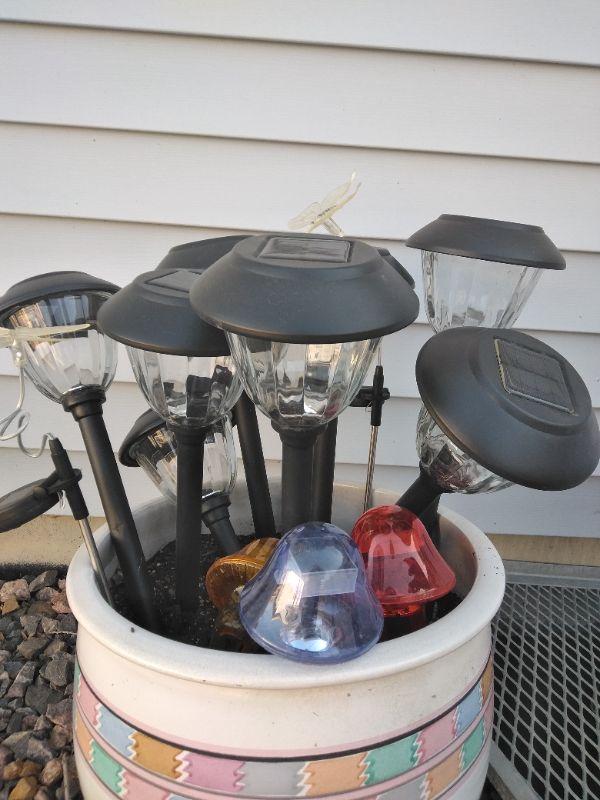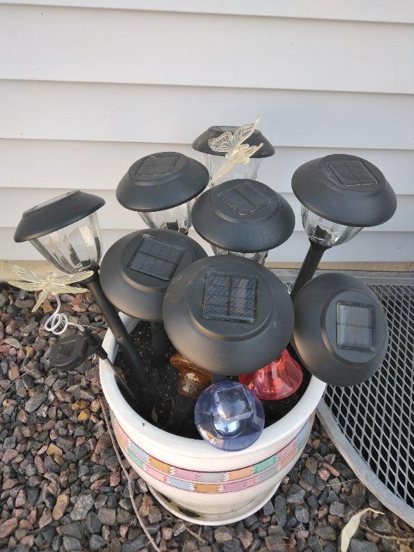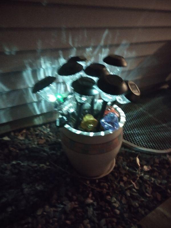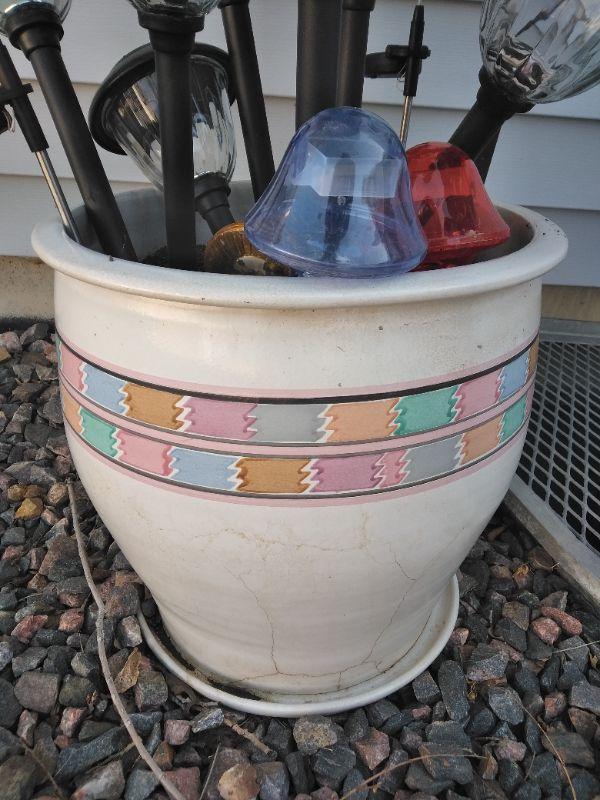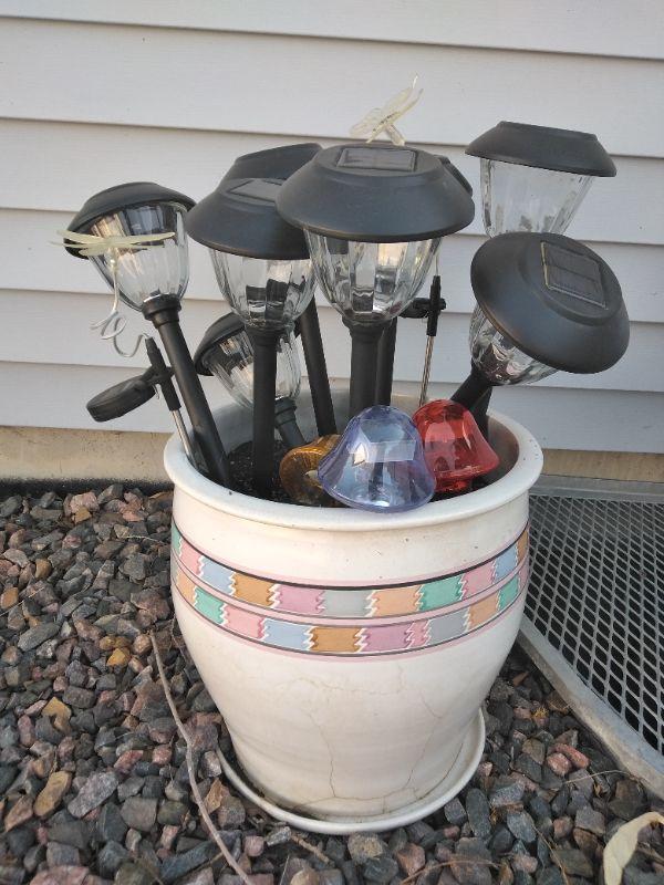 LARGE FLOWER POT WITH SOLAR YARD LIGHTS.