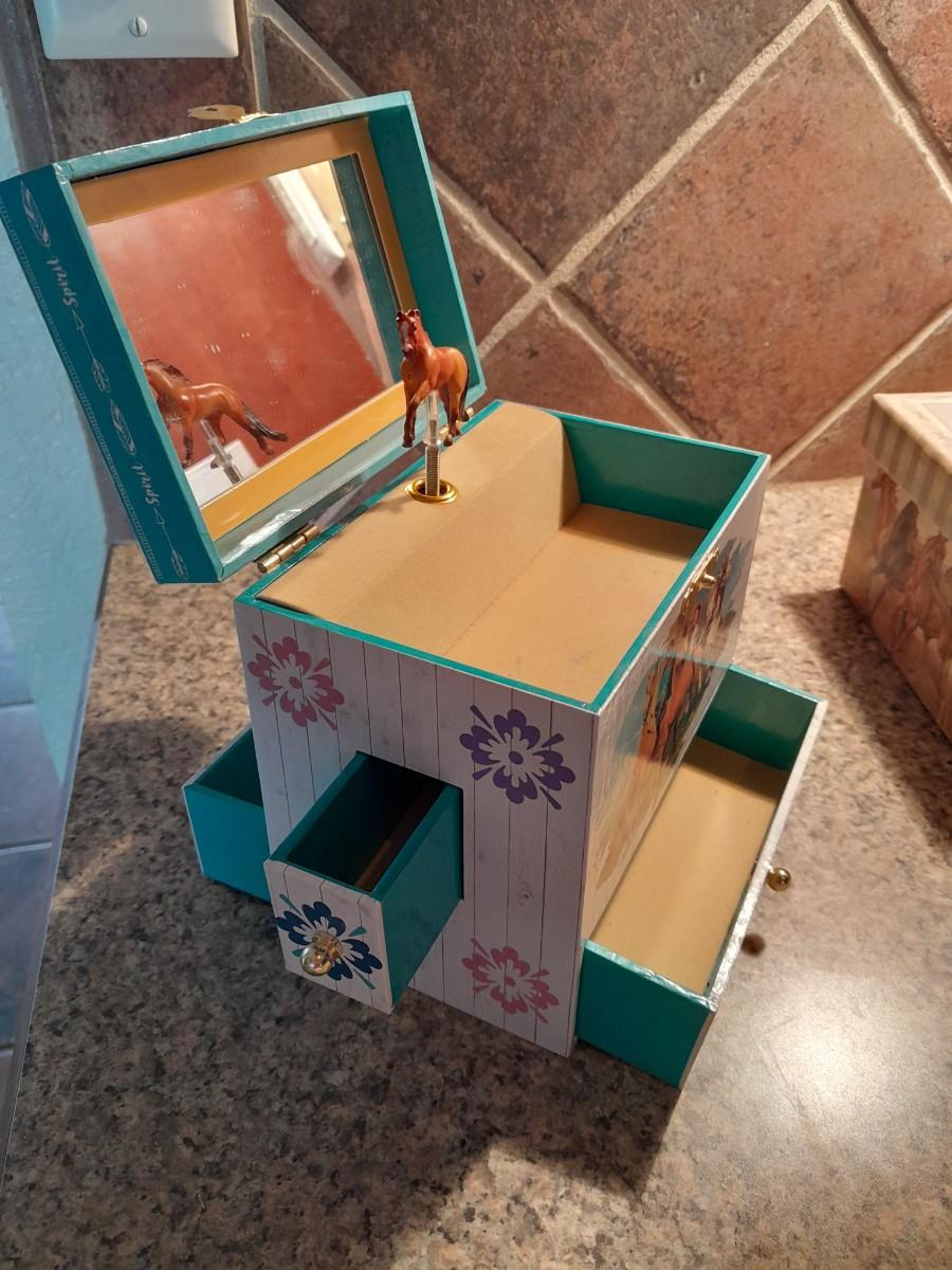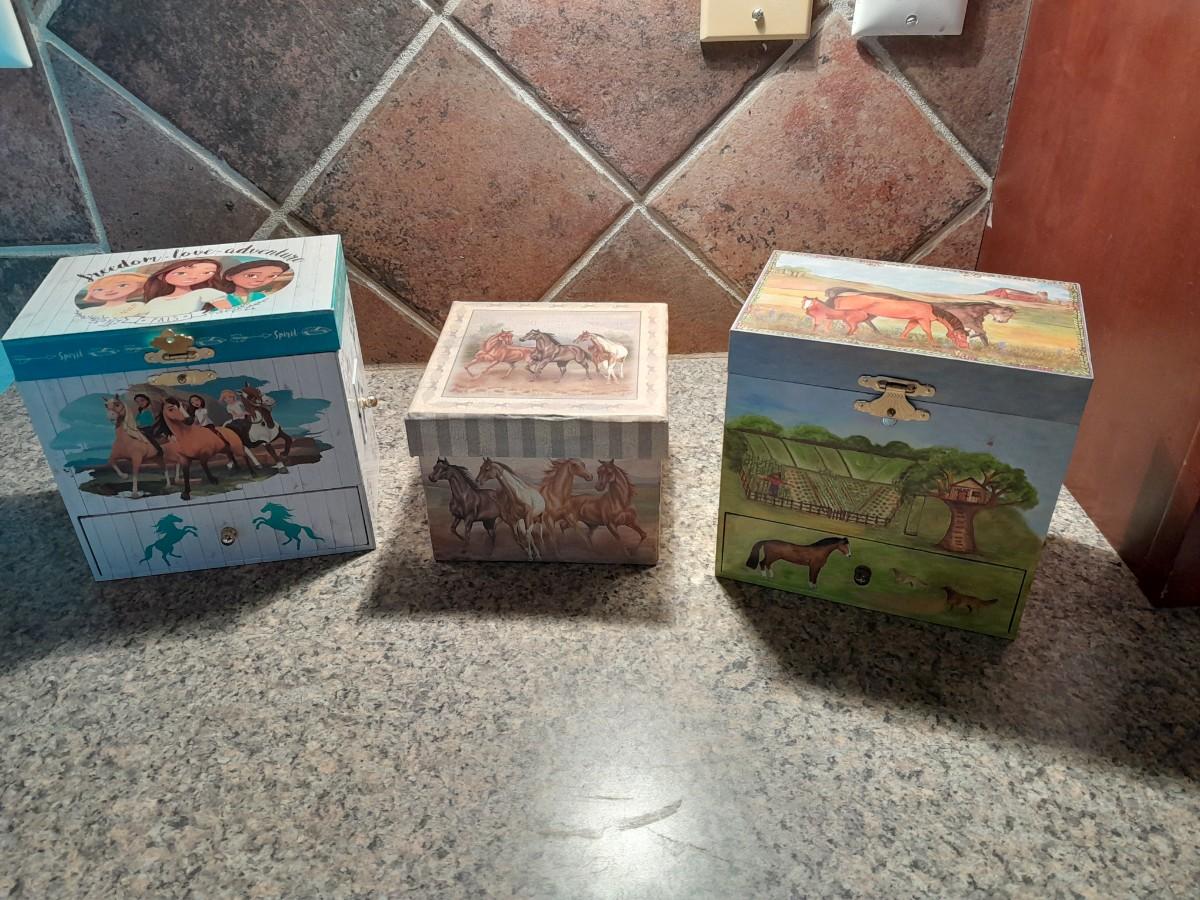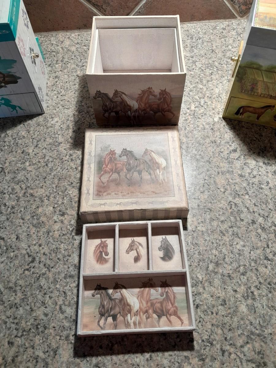 THREE HORSE THEMED JEWELRY BOXES. TWO WIND UP MUSICAL WITH SPINNING HORSE INSIDE. (One is over-wound)
