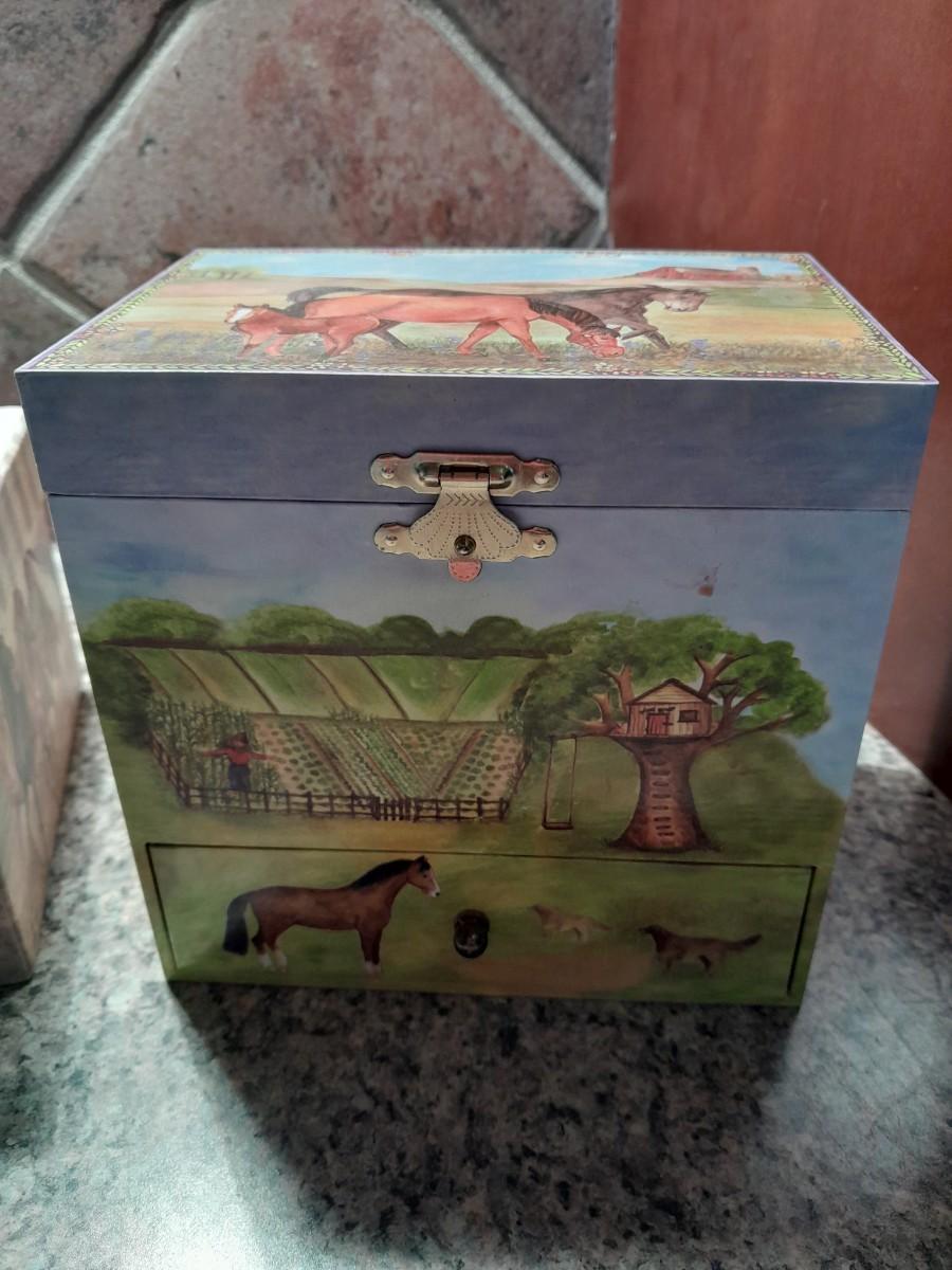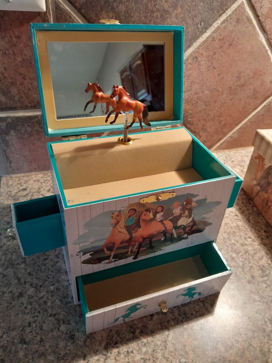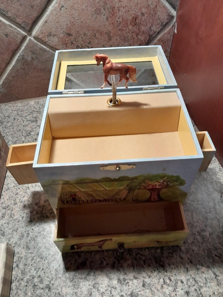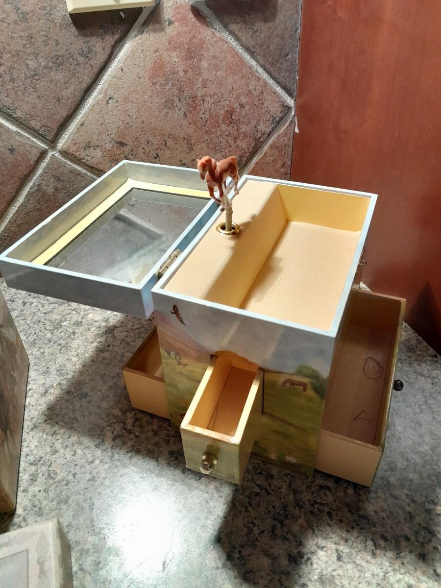 THREE HORSE THEMED JEWELRY BOXES. TWO WIND UP MUSICAL WITH SPINNING HORSE INSIDE. (One is over-wound)