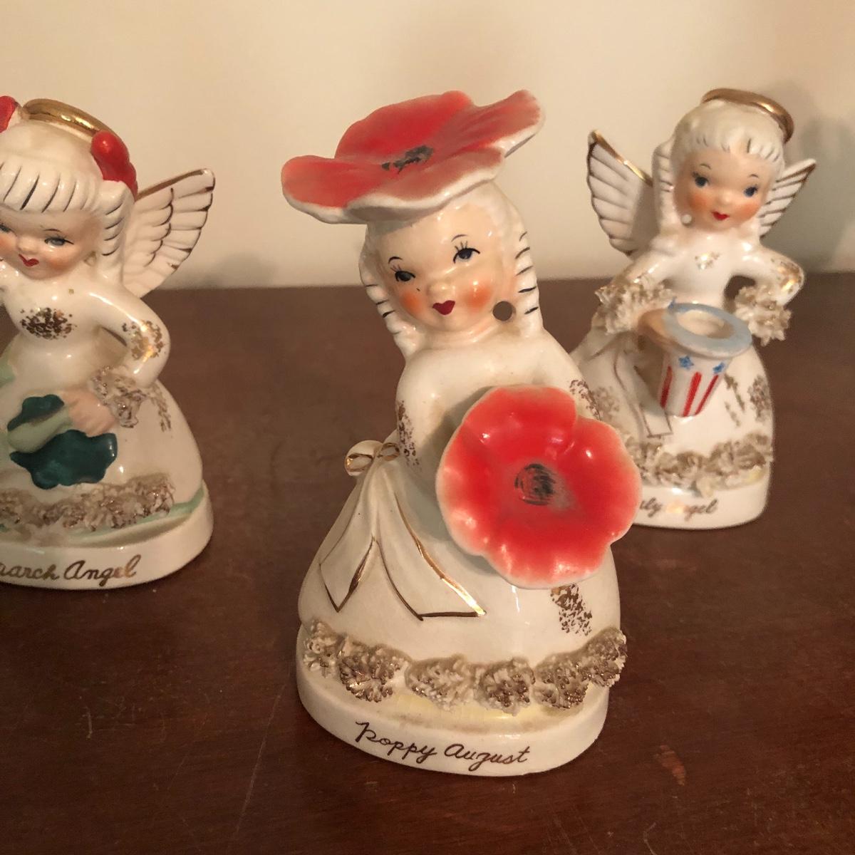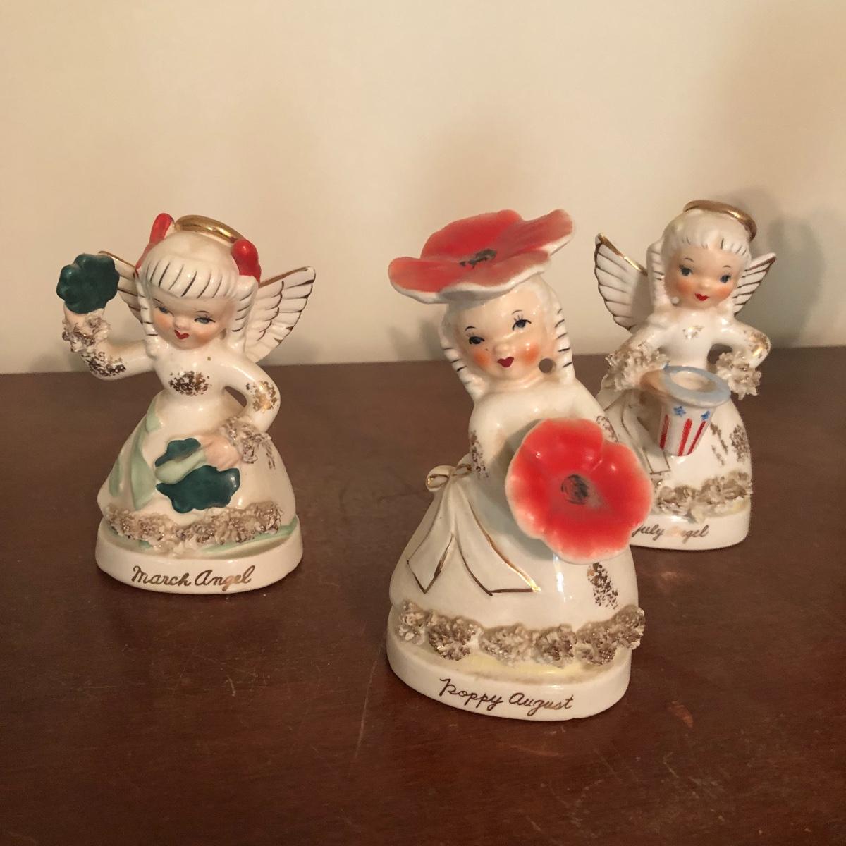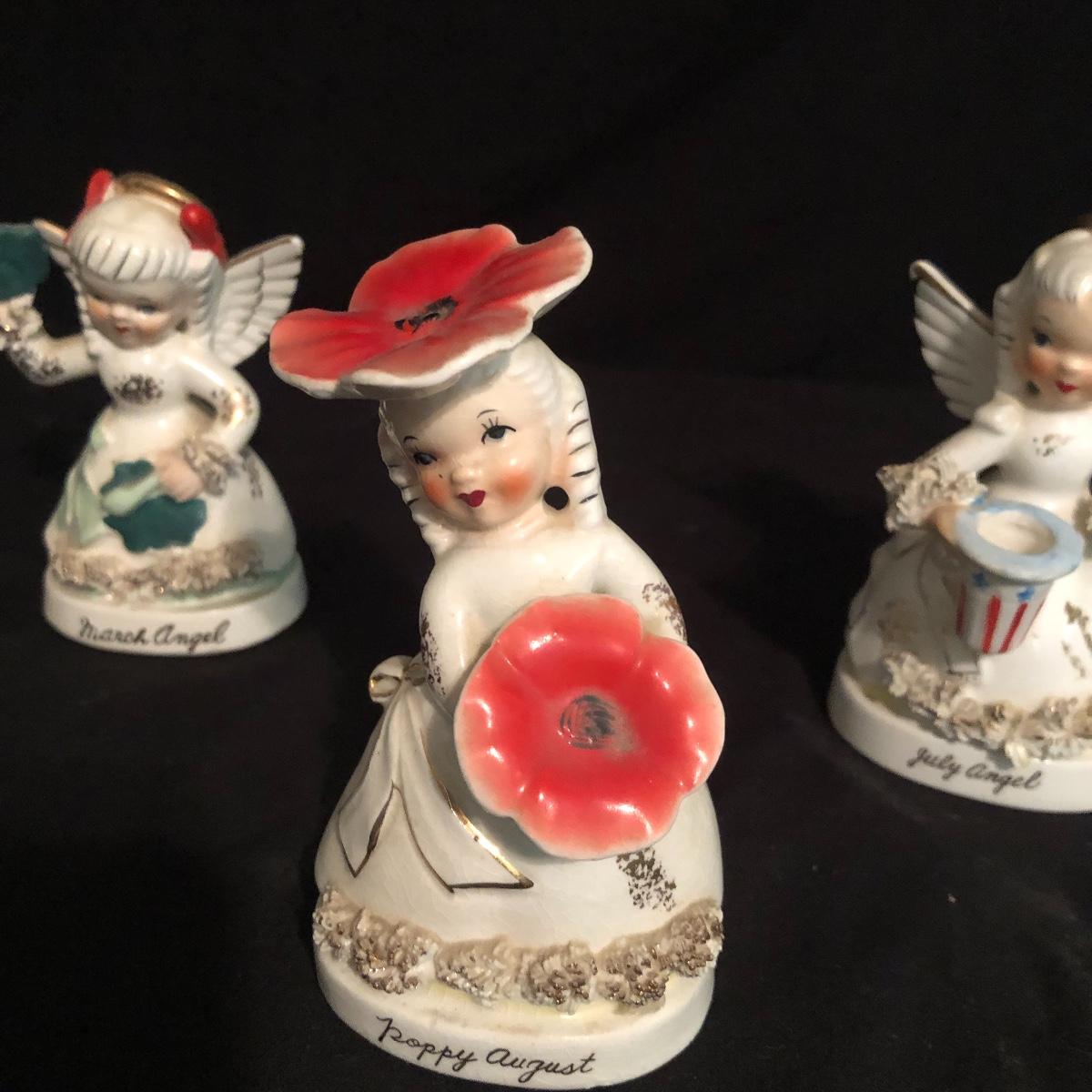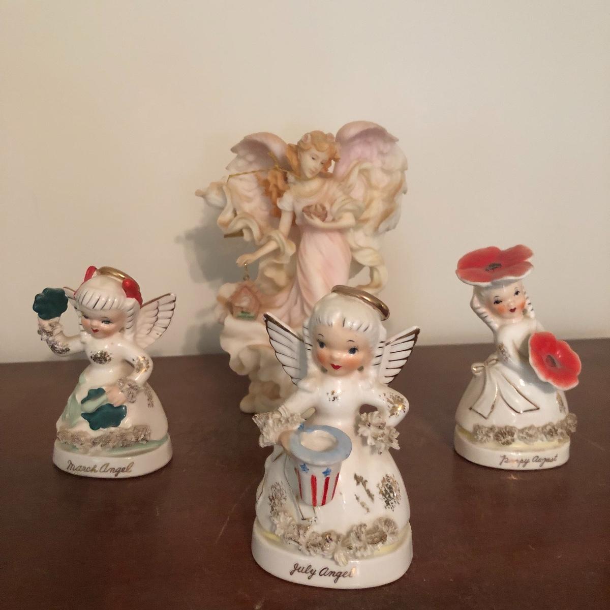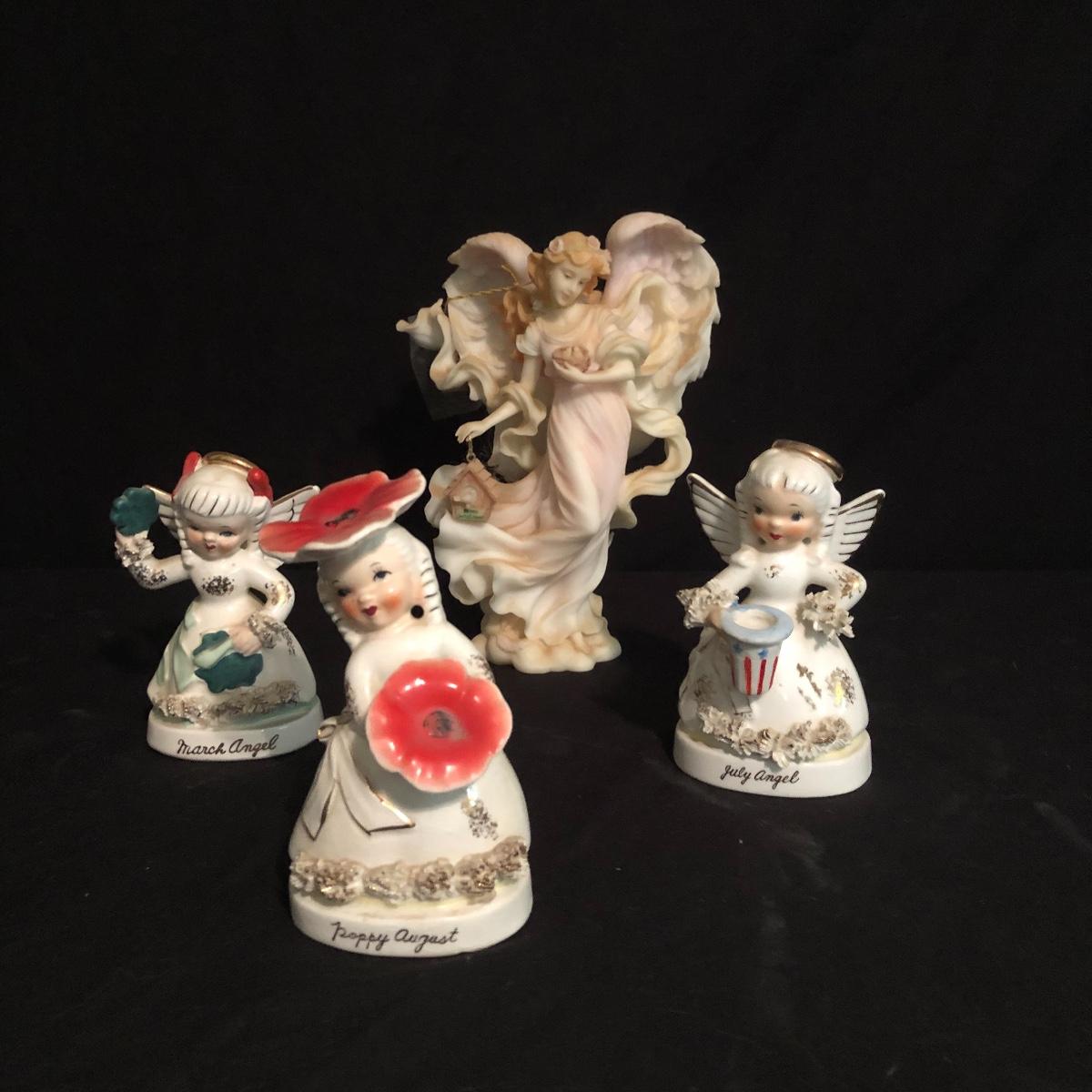 Celebrate three months of the year with these vintage angels: March, July and August. They all are about 4” tall. The fourth angel is a Seraphim Classic standing 7” tall. Shipping Available.