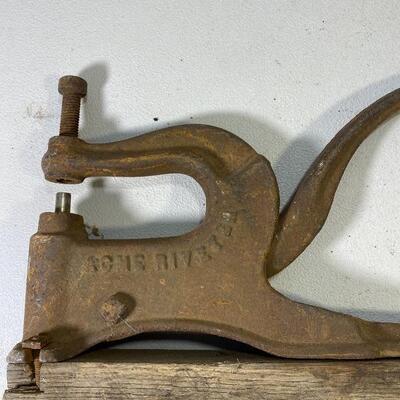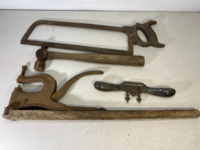 Acme Riveter cast iron Marked Ball peen Hammer-can’t read Draw knife frame from England Unmarked wood Handle Hacksaw