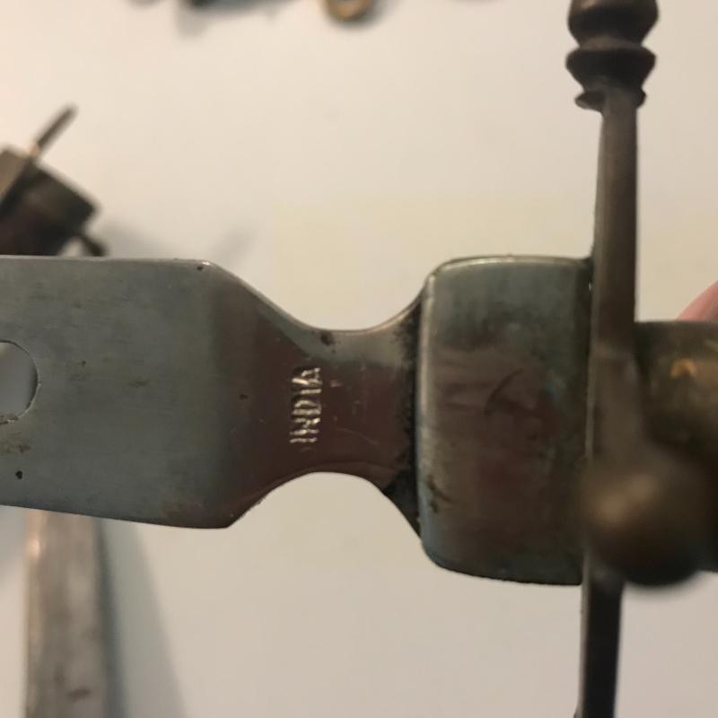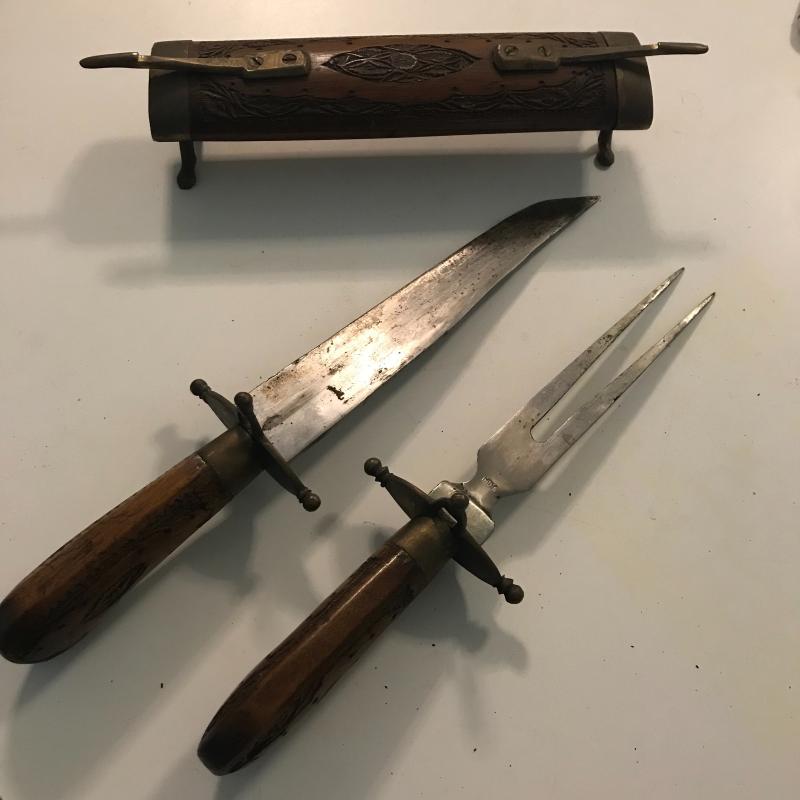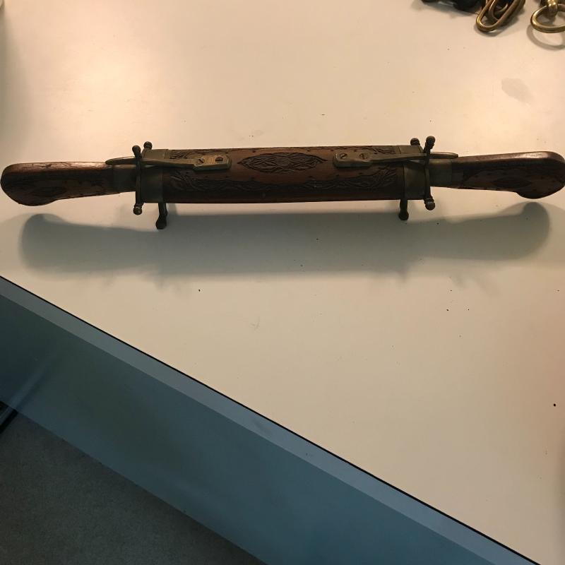 Antique flare gun has 1917 on it and is in working order but likely just a collectible, small pocket knife has no markings. Indian rosewood hold cutlery pieces and makes a nice conversation piece and display. Local pick up only.