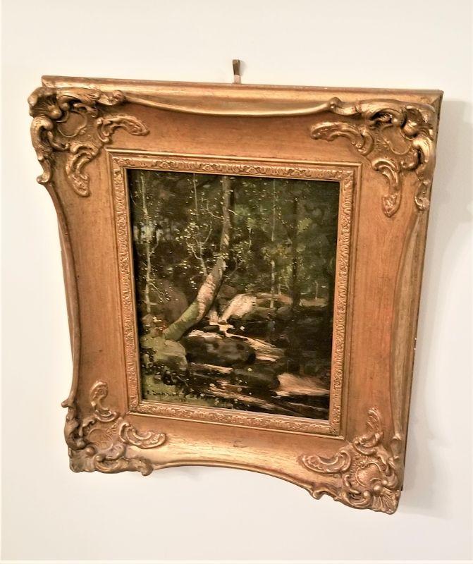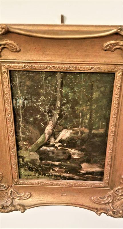 This lovely little oil - woodland scene - is signed indistinctly, dated "75 (1875). We are doing more research. Period frame. Info on reverse says the canvas was restretched in 1975. Measures 13" across and 15.5" tall.