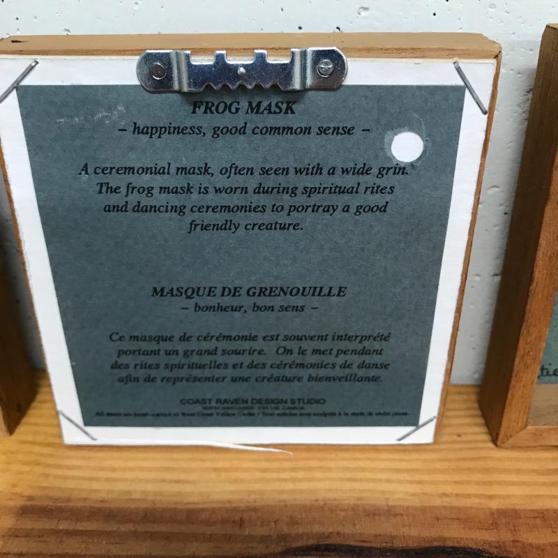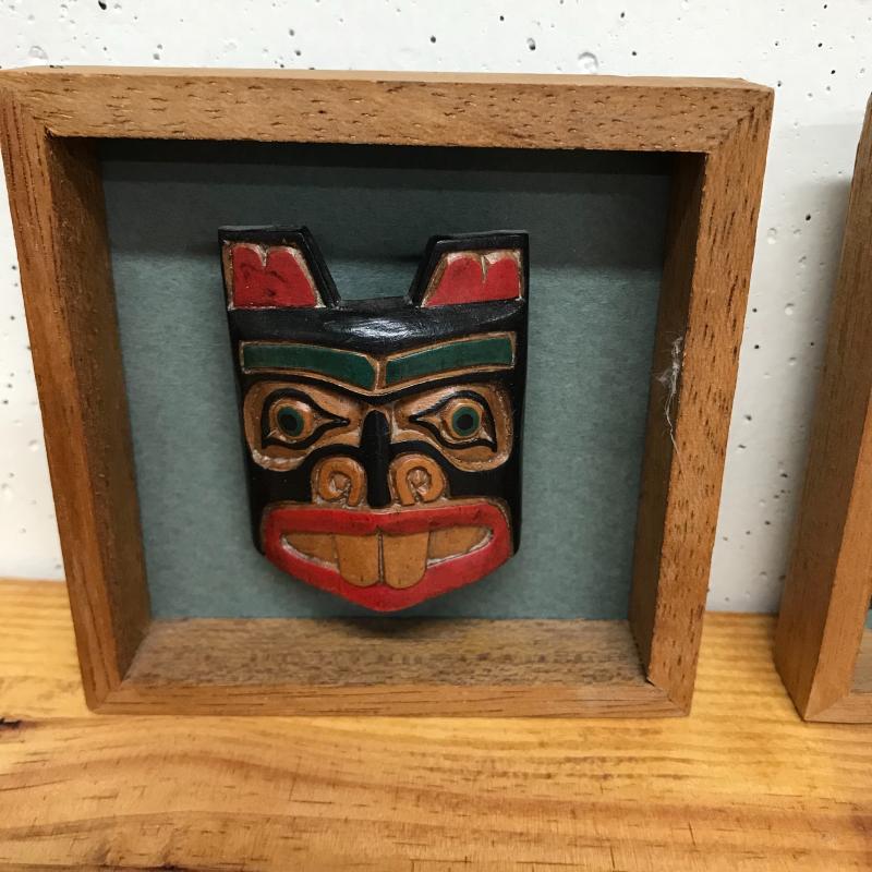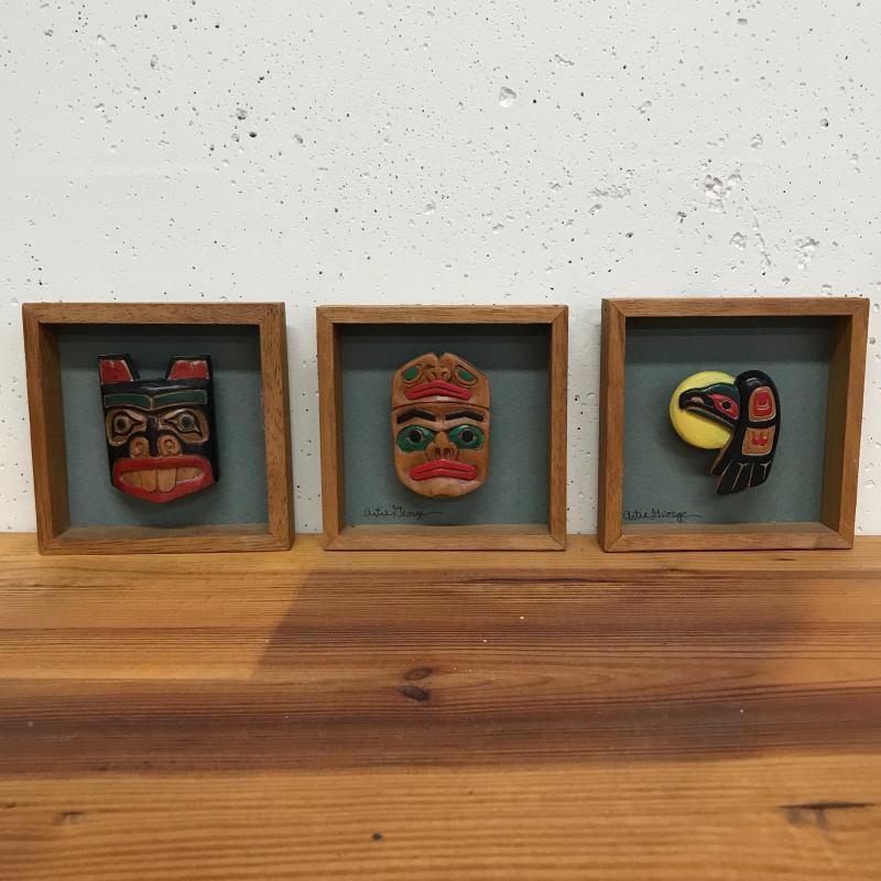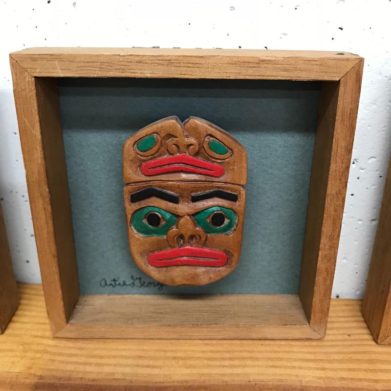 Three framed masks, two of which are signed by the artist, “Auntie George.” Each approx. 4” square. Descriptions on the backs. Shipping available or local pickup in Asheville, NC.