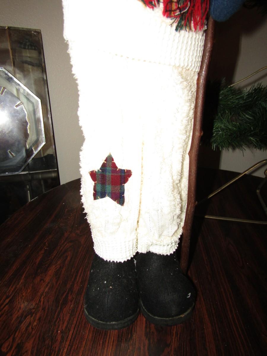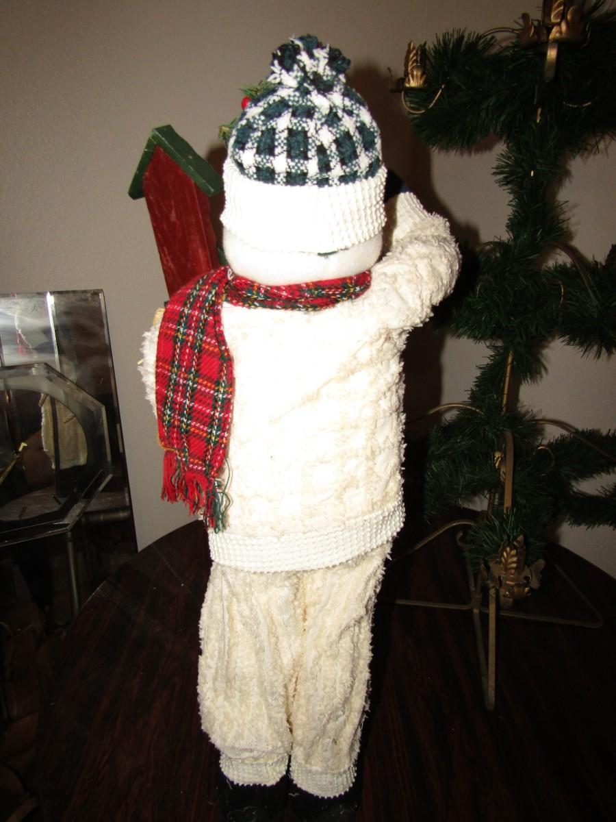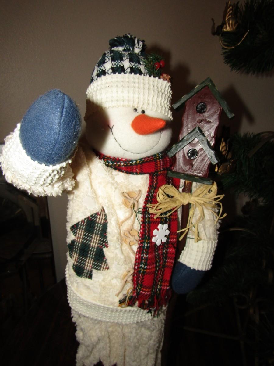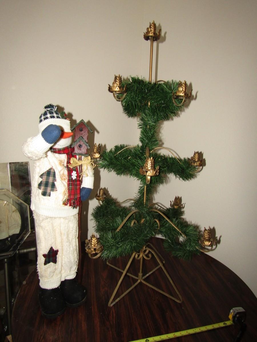 METAL CHRISTMAS TREE WITH WREATH AND CANDLE HOLDERS APPROX 3 1/2 FEET TALL. ALSO A FREESTANDING SNOWMAN WITH BIRDHOUSE