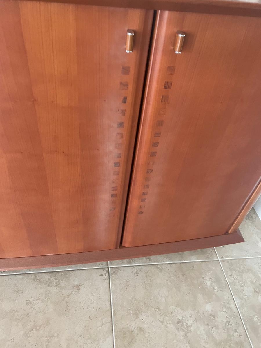 81" x 21" x 36" tall. Teak buffet with inlaid pattern on the doors. Slight discoloring on the front of one door. Can deliver for a fee