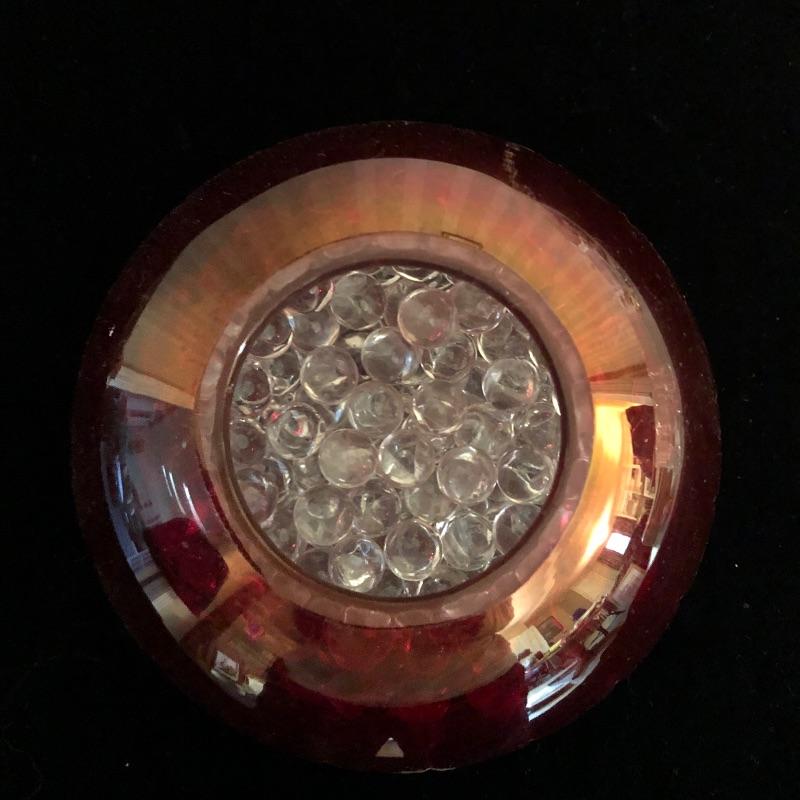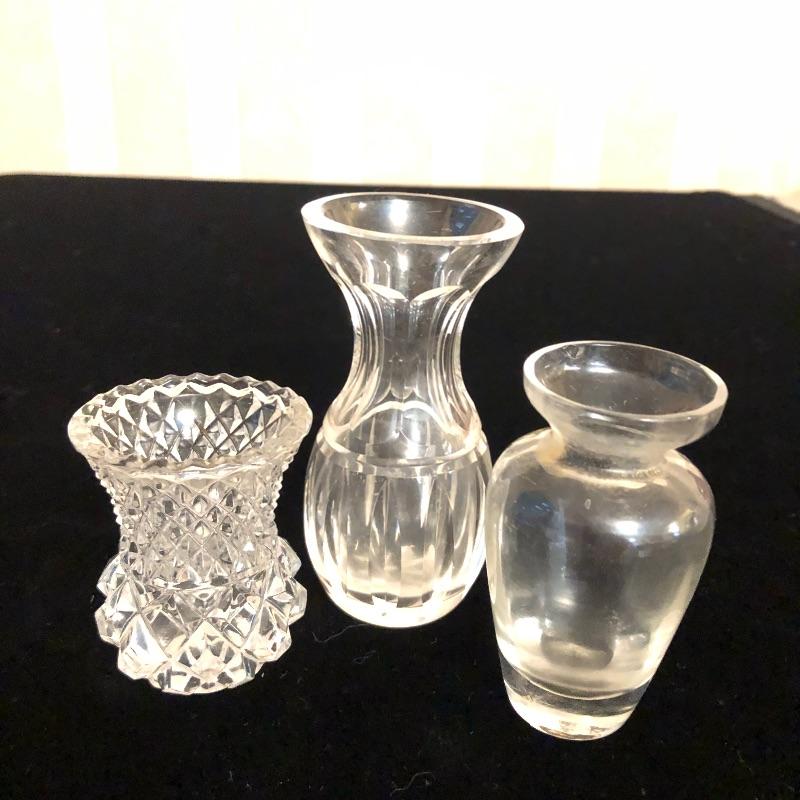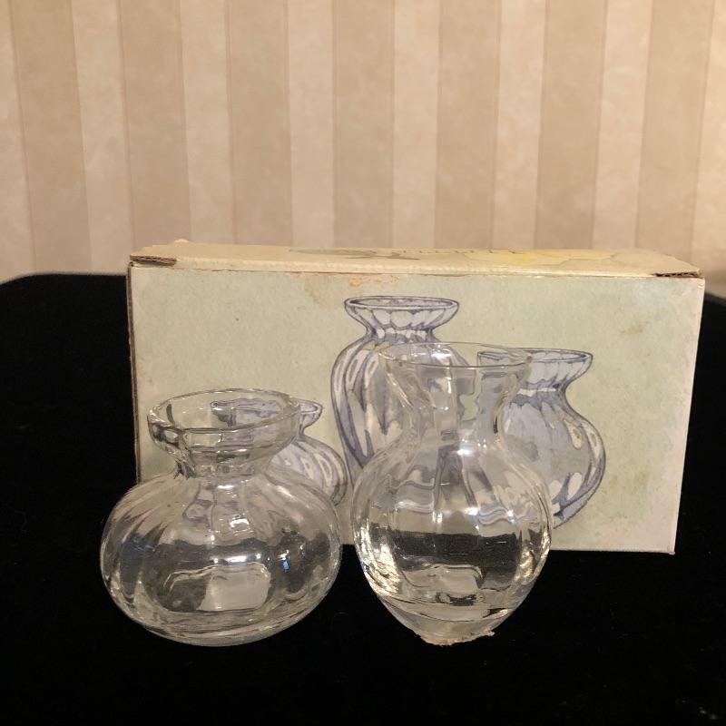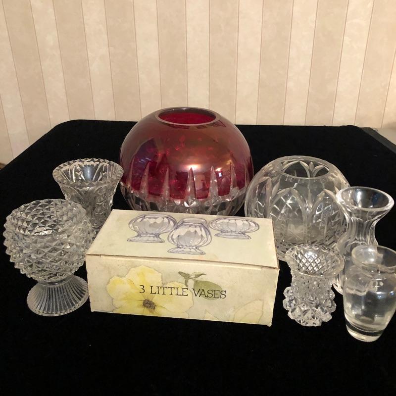 Pretty array of small glass vases and decorative bowls. The box comes with the two vases pictured in front of it and not the third that is pictured on the box. The red decorative bowl measures 7" D x 6" H. Local pickup only.