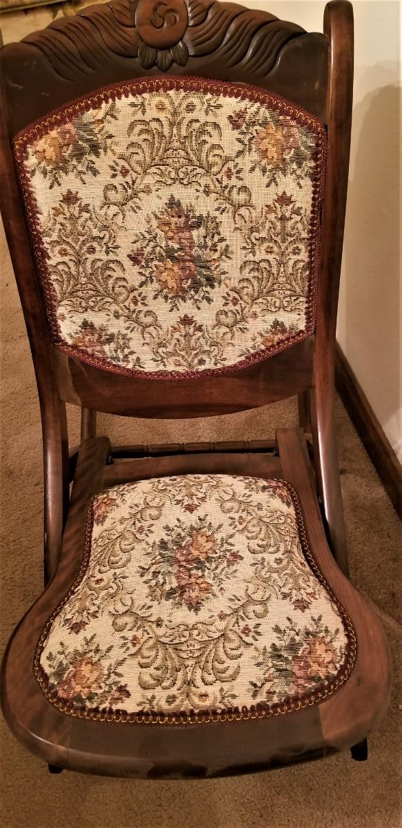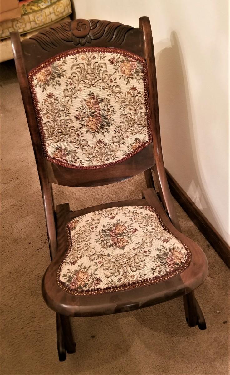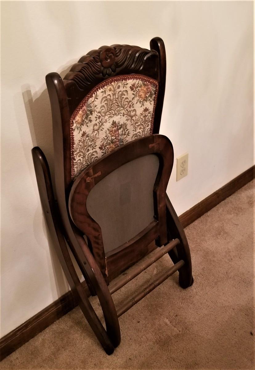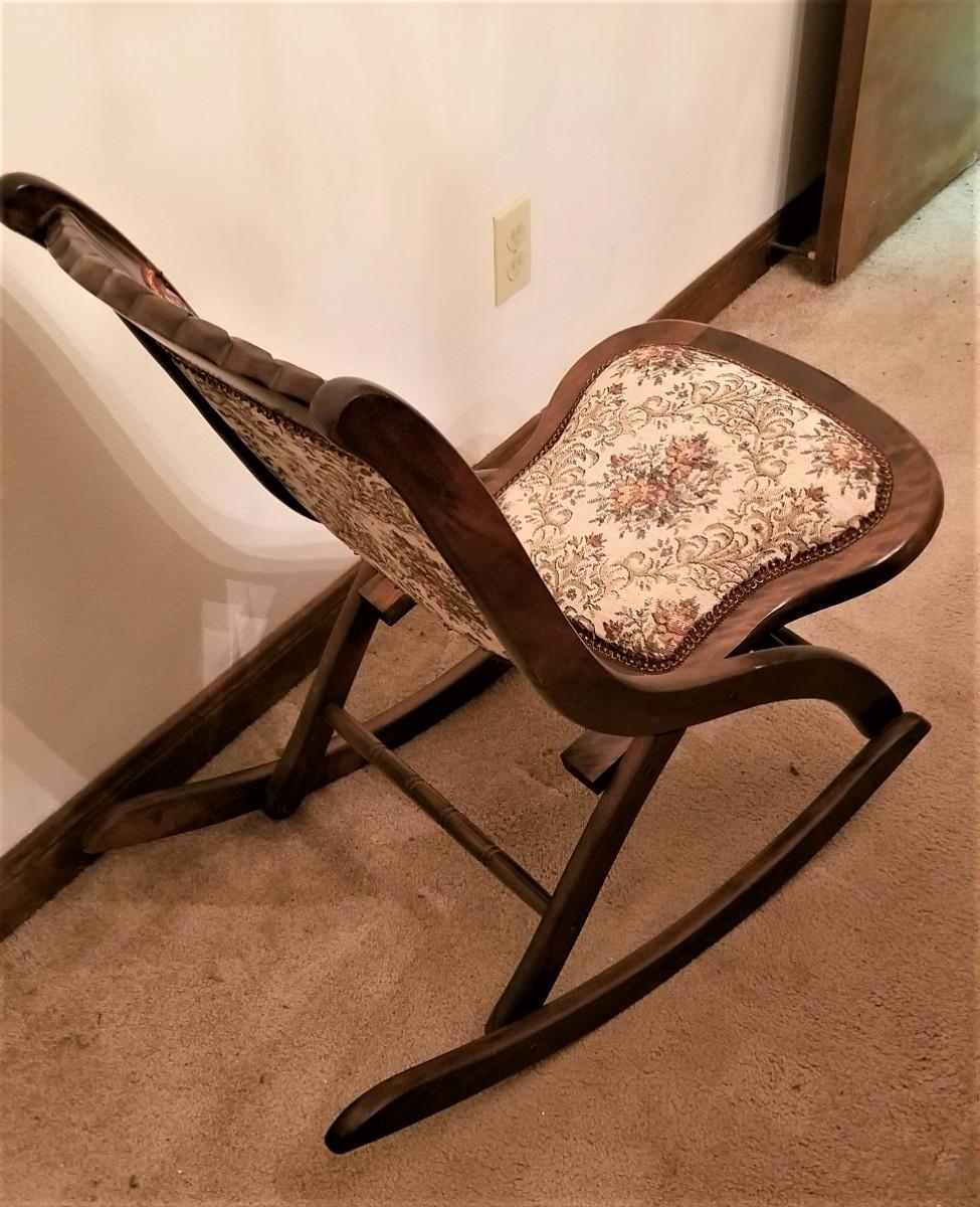 1980's folding rocking chair - good used condition - 30" tall, 31" deep. When folded, is 38" tall.