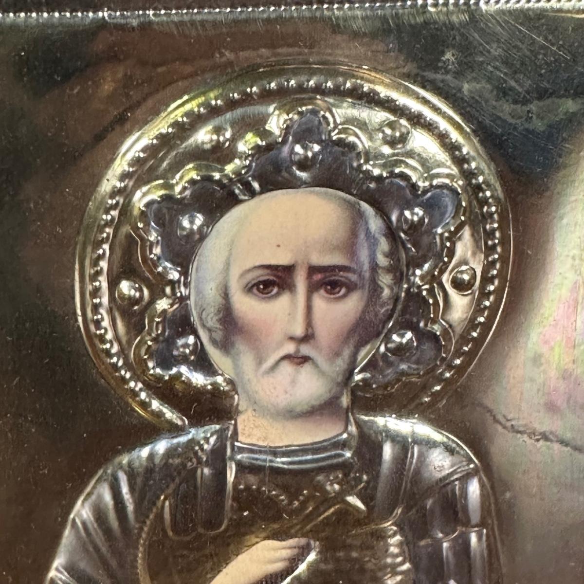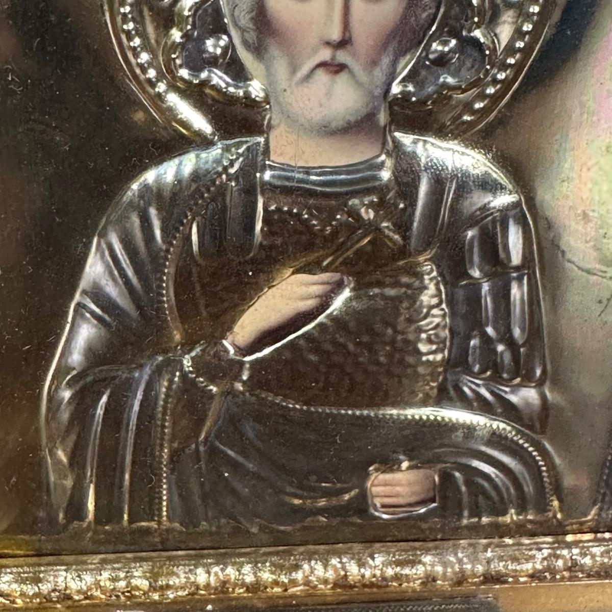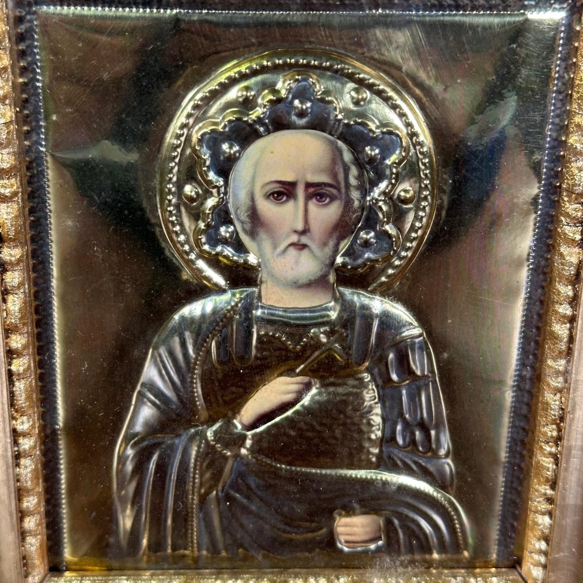 LOT 29B: Antique Russian Orthodox Icon Saint Nicholas Brass/Gilt