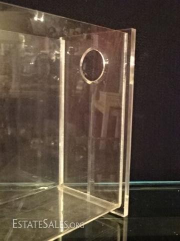 LOT 29C: MID CENTURY MODERN CLEAR LUCITE BIN, VERY GOOD CONDITION WITH NO YELLOWING OR CRAZING, LIGHT SURFACE SCRATCHES WE HAVE NOT RE-POLISHED, 11" X 10" X 6", SKU364.32