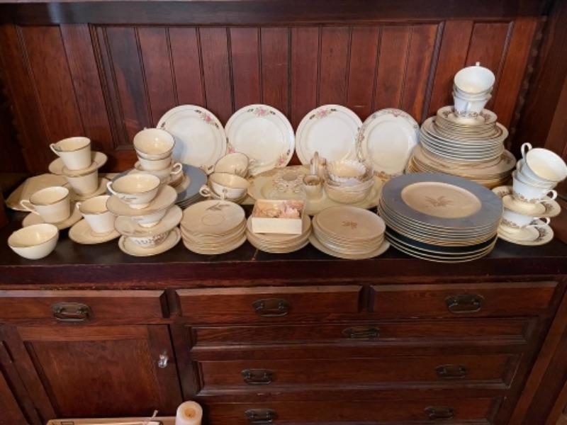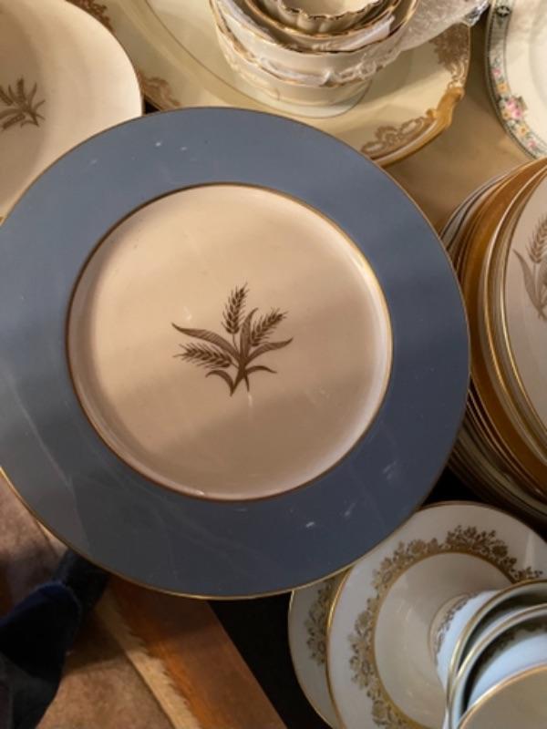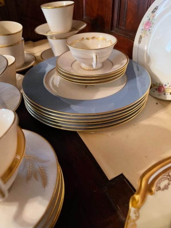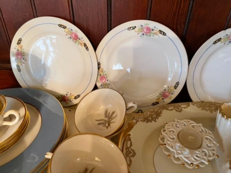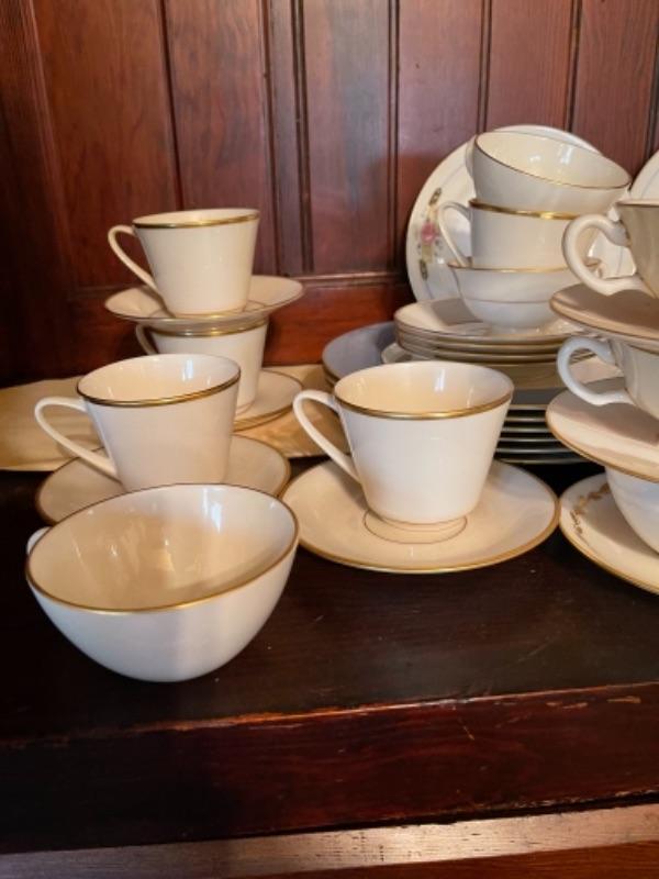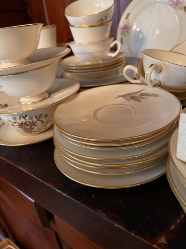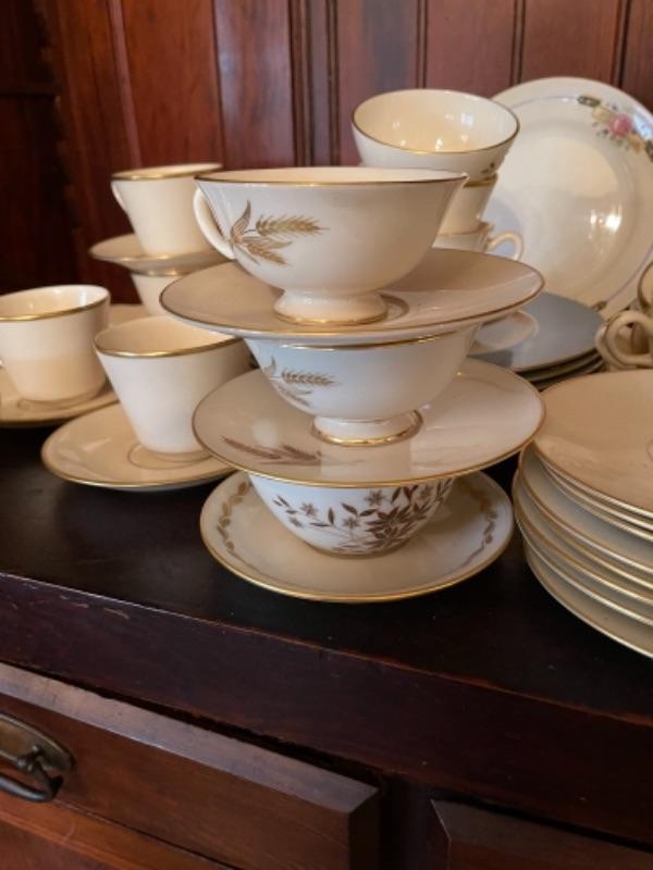 Lot 29DR. Set of Lenox china (Harvest Wheat Starlight), Oxford Golden Dawn cups and saucers, tray, candle holders, serving dish (Rose Blossom)--$85