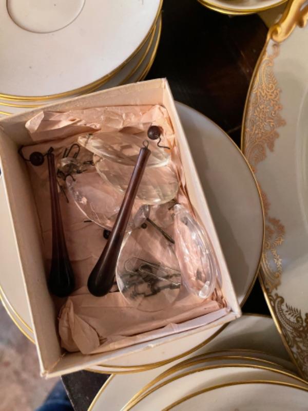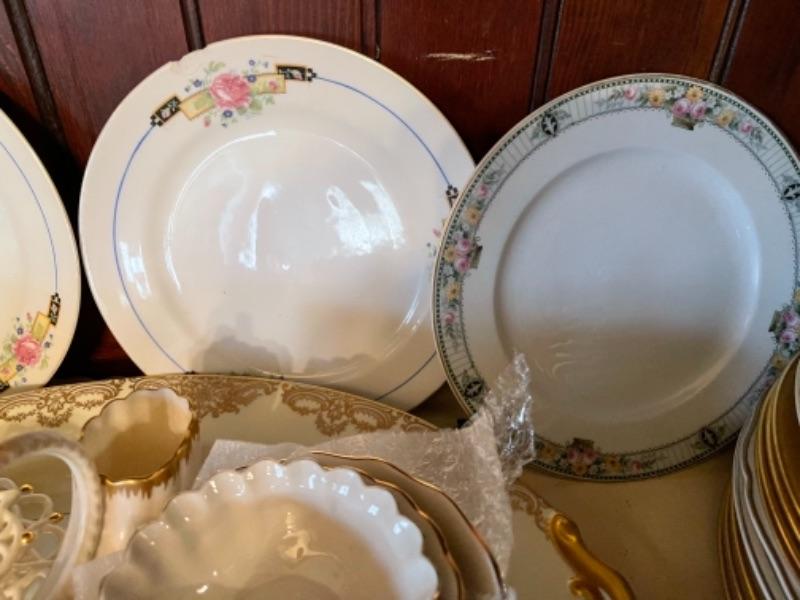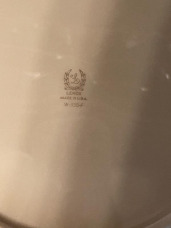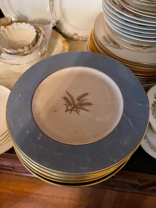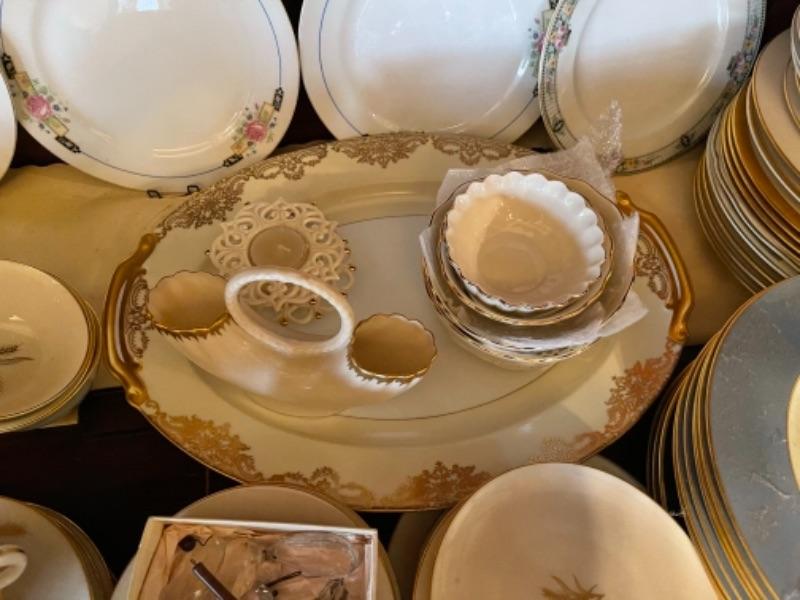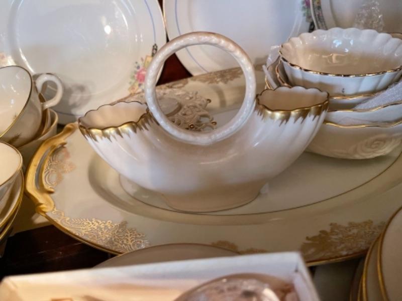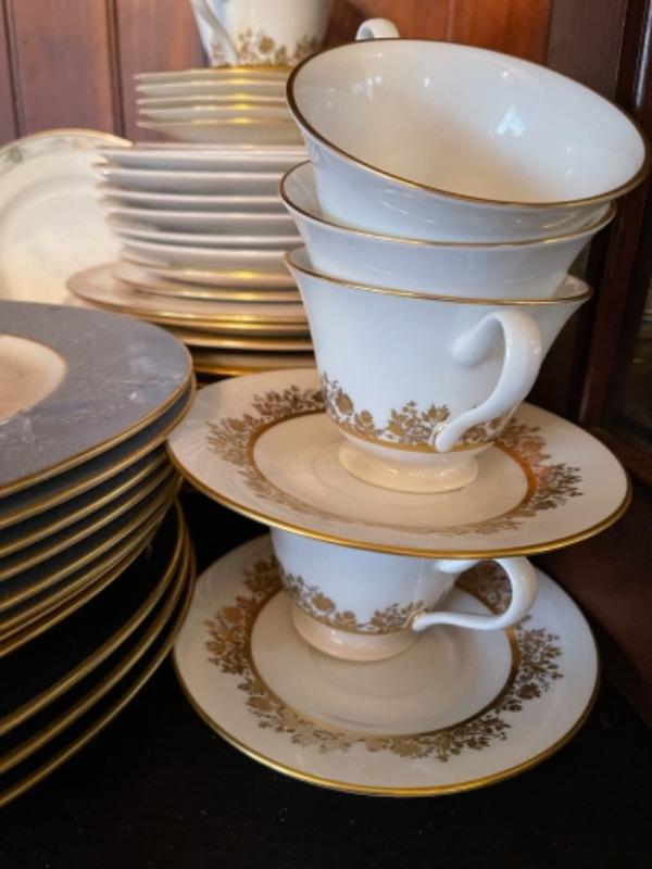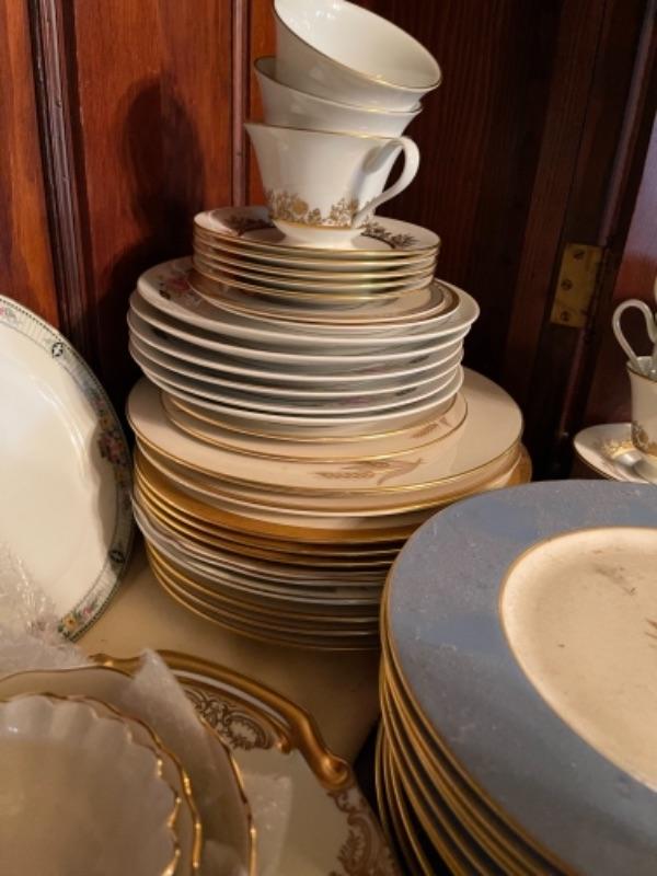 Lot 29DR. Set of Lenox china (Harvest Wheat Starlight), Oxford Golden Dawn cups and saucers, tray, candle holders, serving dish (Rose Blossom)--$85