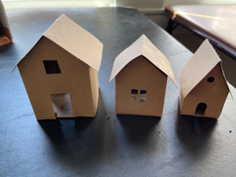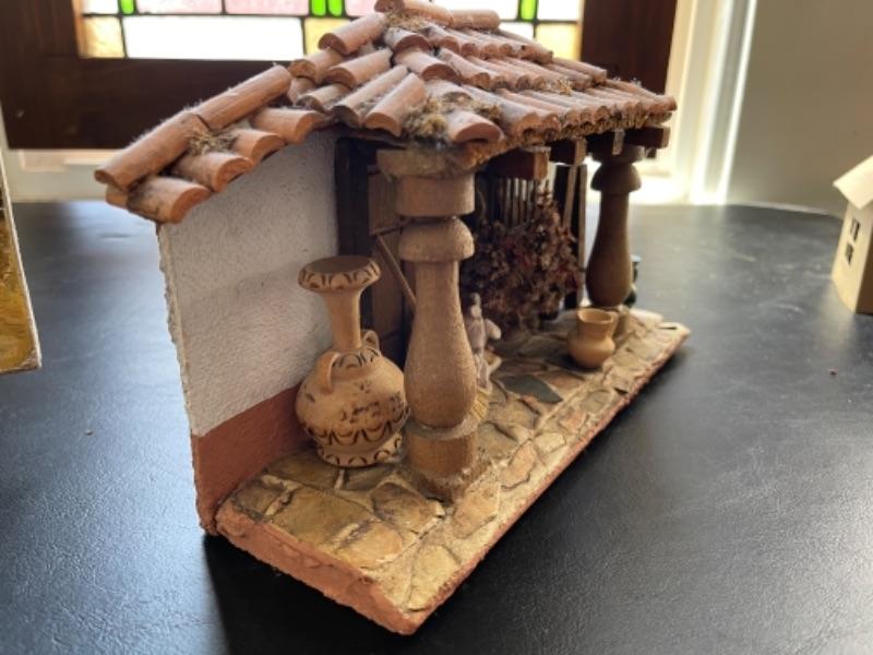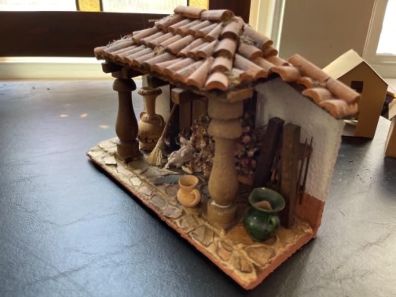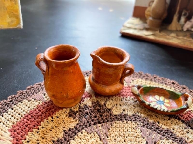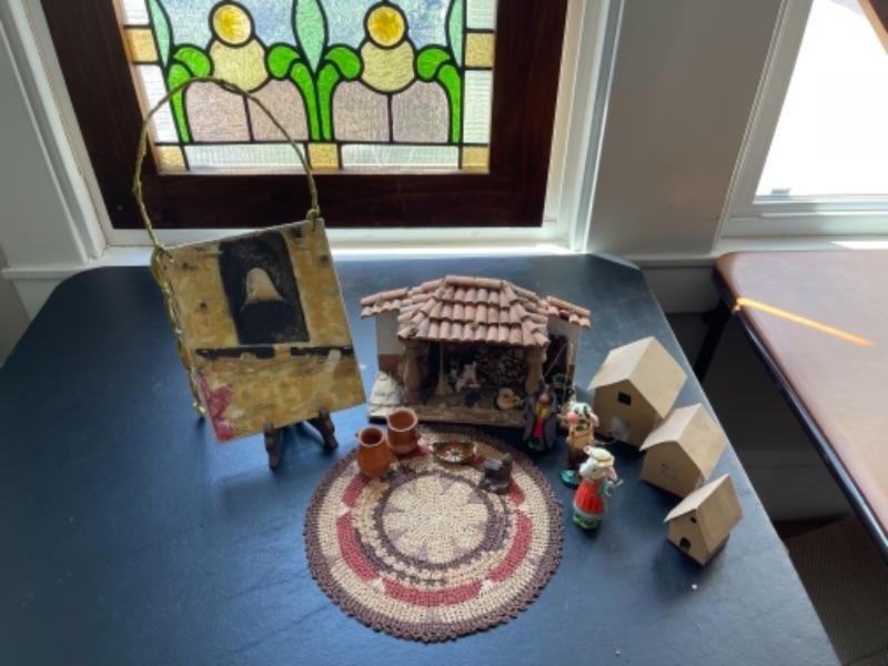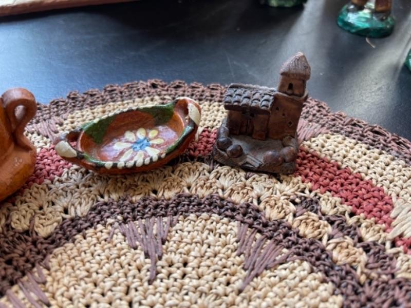 Lot 29LD. Doily, miniature Tlaquepaque redware ceramics, 3 animal ceramic ornaments, 3 paper houses, diorama--$25