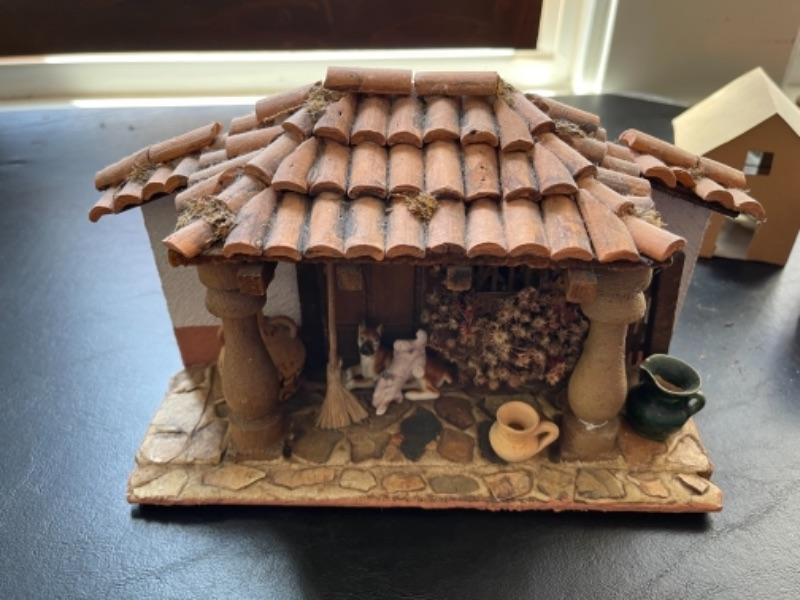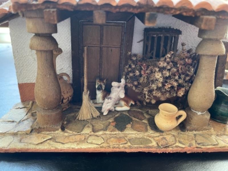 Lot 29LD. Doily, miniature Tlaquepaque redware ceramics, 3 animal ceramic ornaments, 3 paper houses, diorama--$12.50
