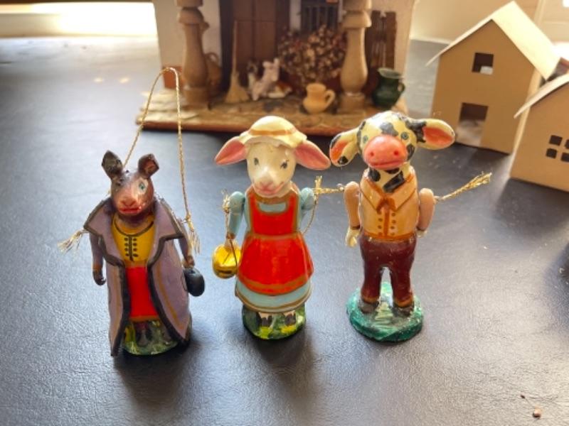 Lot 29LD. Doily, miniature Tlaquepaque redware ceramics, 3 animal ceramic ornaments, 3 paper houses, diorama