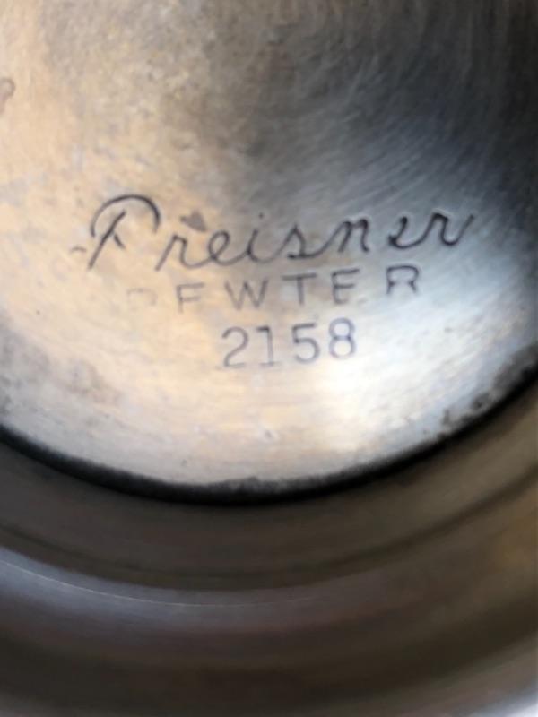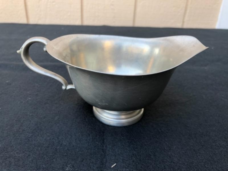 Lot 29P 1 Pewter gravy boat, Preisner Pewter 2158; Pewter candle stick holder with glass hurricane “” $6.25