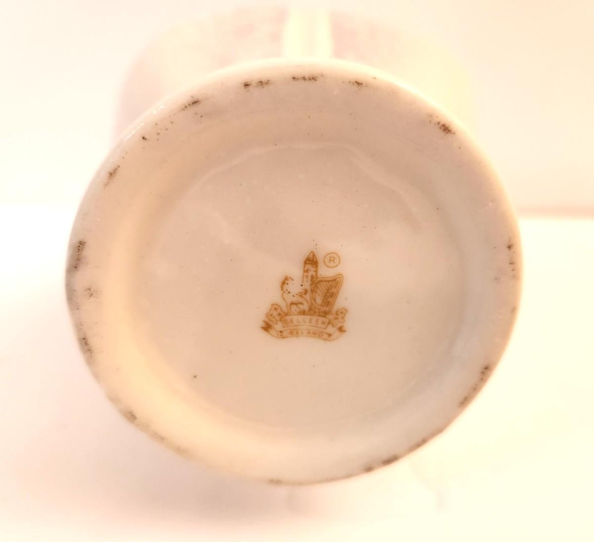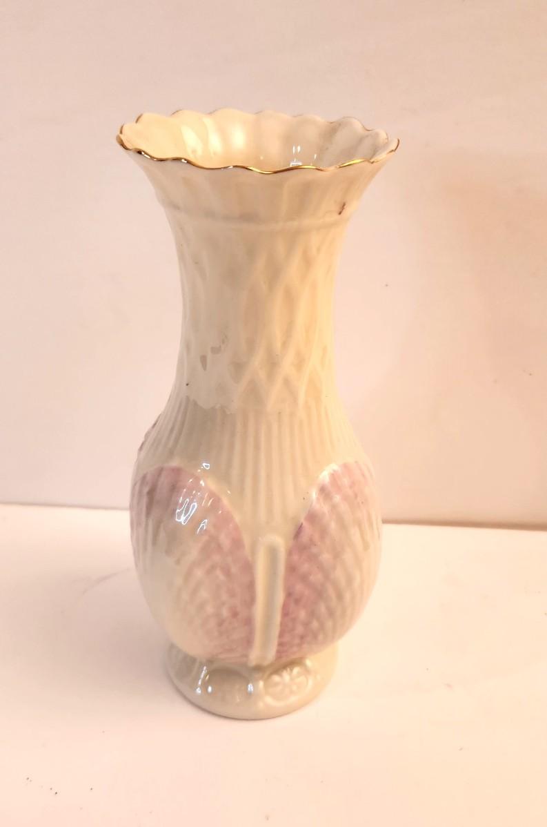 Pretty Irish porcelain Belleek Shell vase - Gold mark on bottom. Shells are a delicate shade of pink. No chips. 7.5" tall.