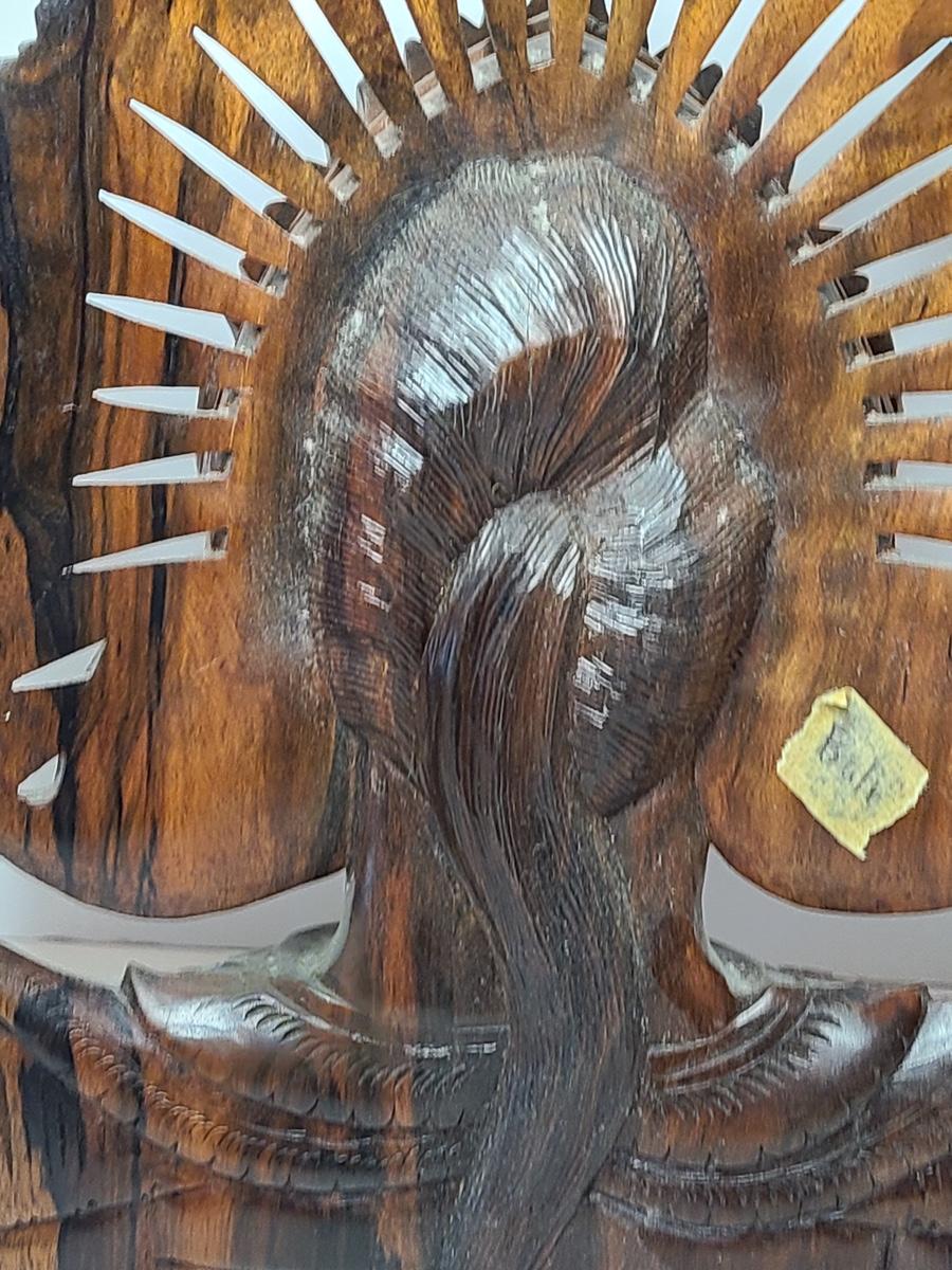 This is solid wood, and is large in size. Incredible detail! The only imperfection noted that may be wear, or a sculpture imperfection is the point on shoulder is blunt and the other is sharp!