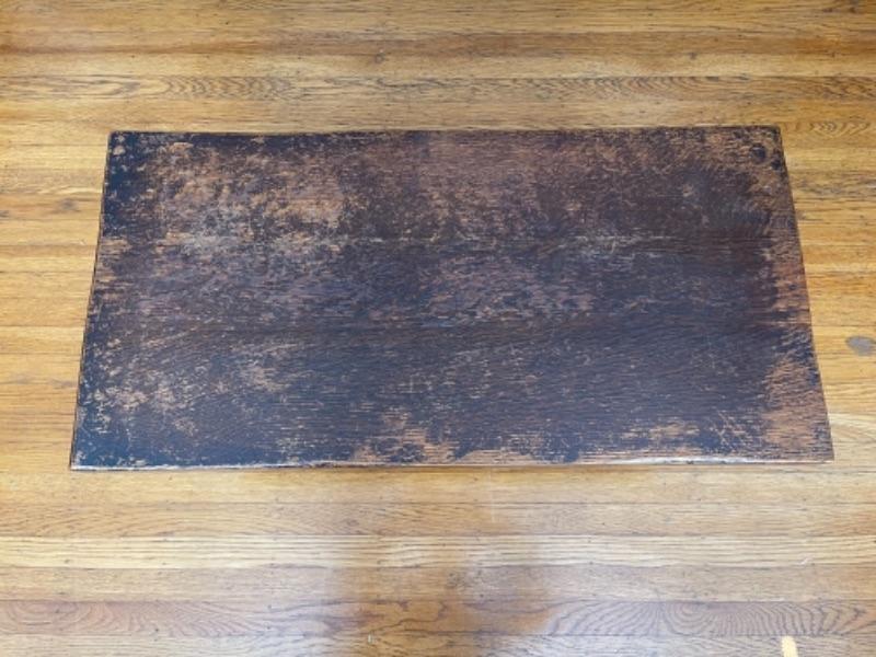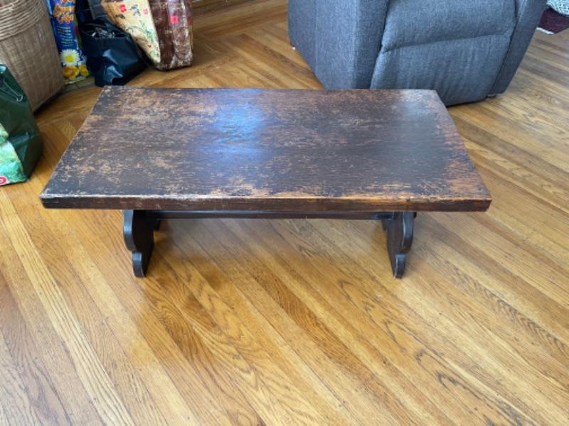 Lot 2LP. Dark oak Craftsman style coffee table with carved legs and keyed tenons (36”L x 18”D x 15”H)--$95