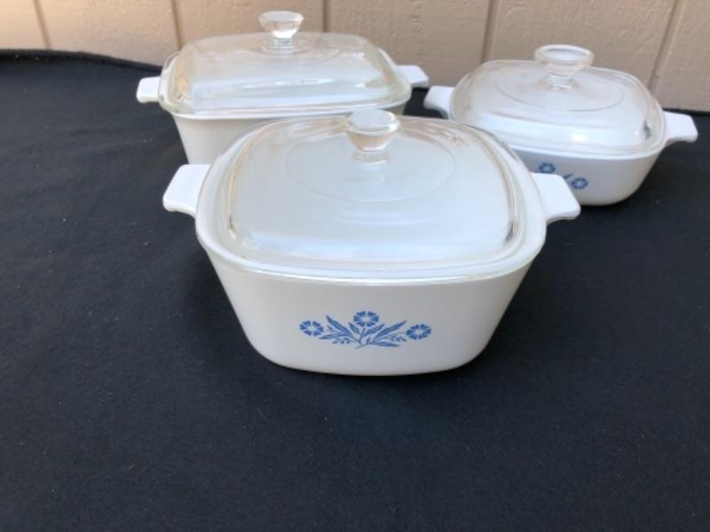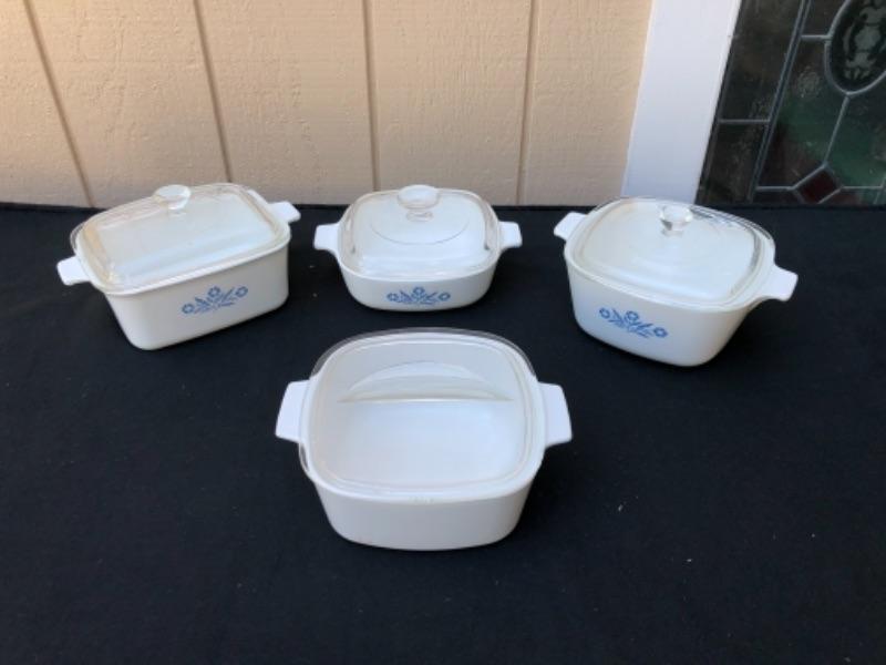 Lot 2S. 4 Assorted Vintage Glass Baking Dishes with lids (Corning, Cordon Bleu)--$37.50