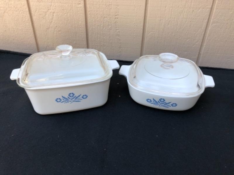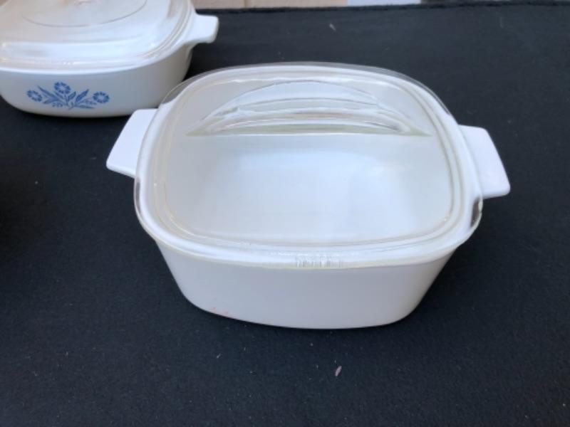 Lot 2S.  4 Assorted Vintage Glass Baking Dishes with lids (Corning, Cordon Bleu)--$37.50