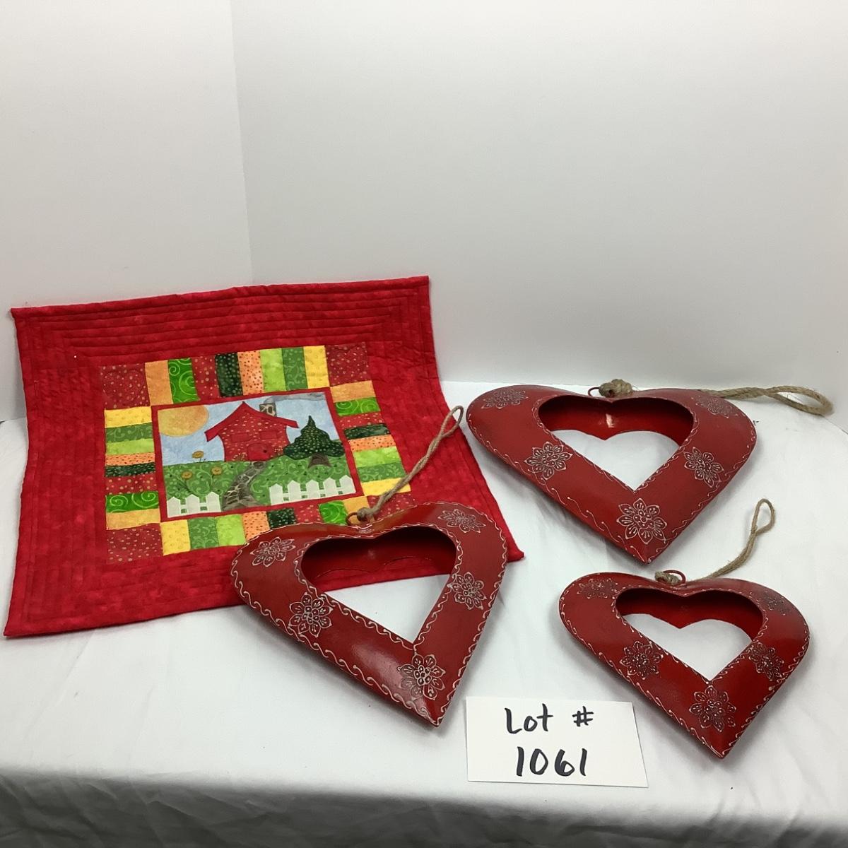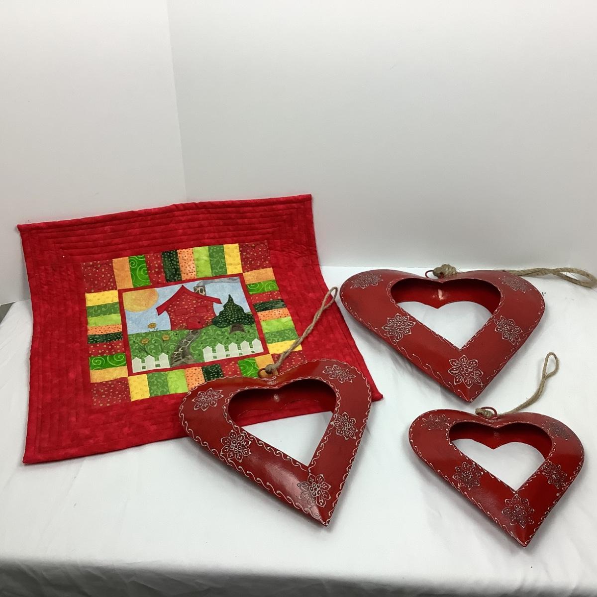 Lot 3 1061. Lot of Three Handing Metal Hearts & Hanging Tapestry
