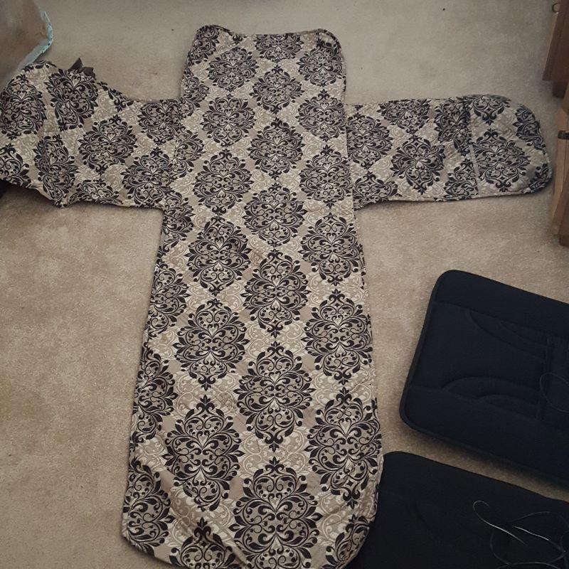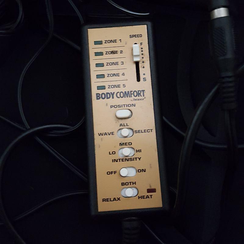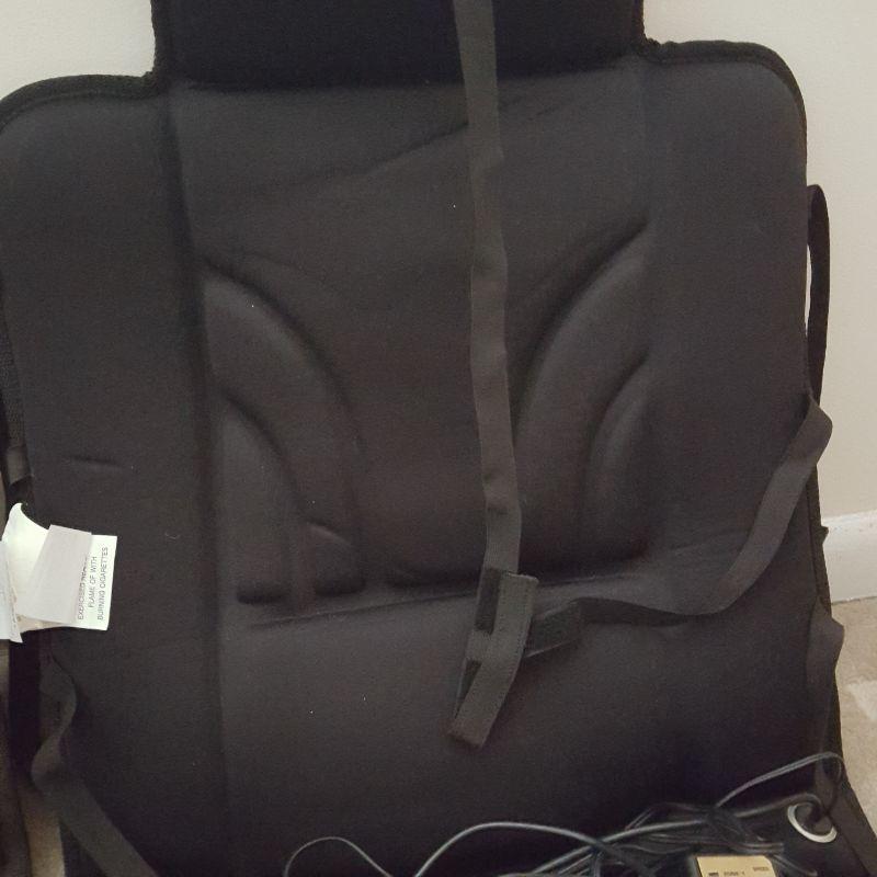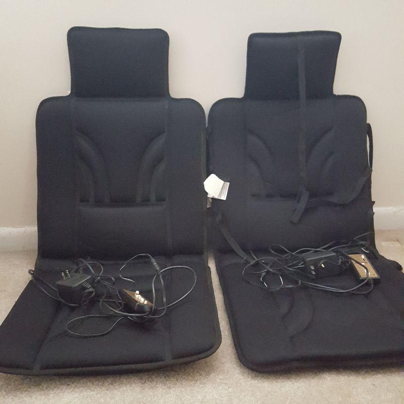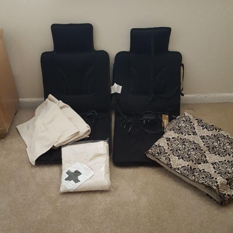 Plug in and relax! This lot contains two Relaxer brand vibrating and heating chairs. Chairs appear to be in working order when plugged in, as they both vibrated and heated! The chairs measure 18x18x46 inches. Both chairs have Velcro attachments so that they adhere to a chair for set up. This lot also includes three chair covers- two identical tan patterns and one brown styled pattern. The brown cover has one side with two pockets. The tan covers have pockets on both sides as seen in pictures. Shipping available.