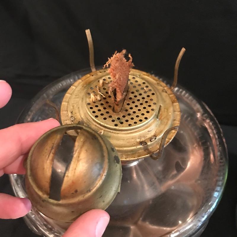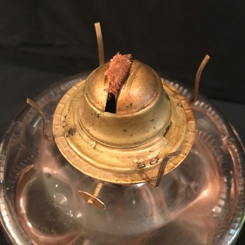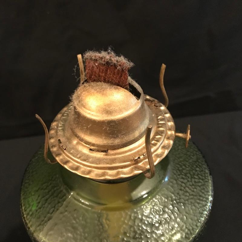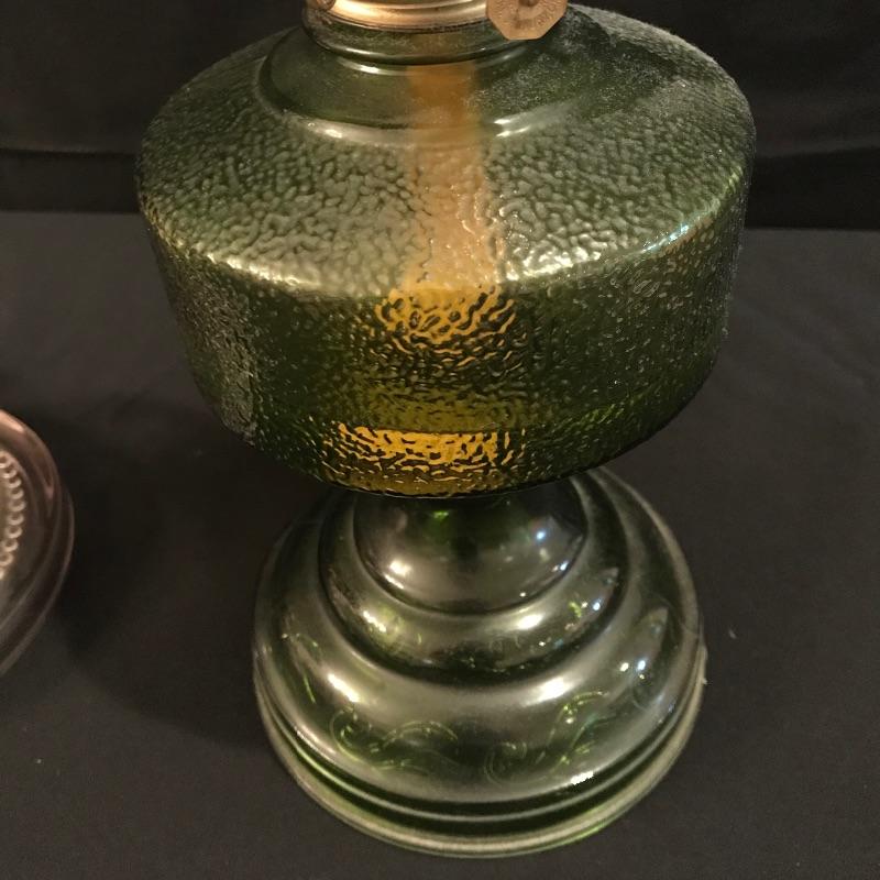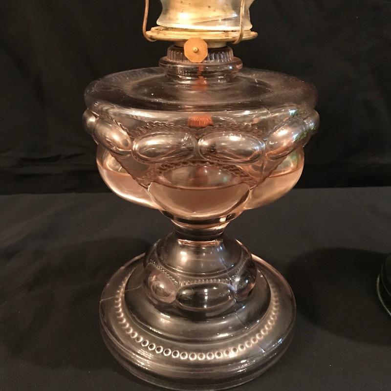 Two beautiful vintage lamps to illuminate your world. Both mild colored glass, one green and one rose. Both come half full of what we are assuming is lamp oil, although it is not verified. Lamps themselves are in wonderful shape, but they both appear to need new wicks. The rose colored lamp’s glass hurricane cover fits a little loose, but it seems as though you may tighten the brass hardware to keep it fitting securely. Both lamps are approximately 11.5” tall without their hurricane glass covers. The green lamp as photographed measures approximately 6”d x 18.25”. See photos. Local pick up only.