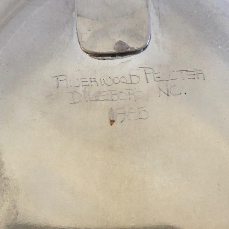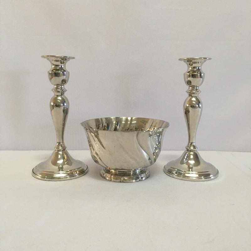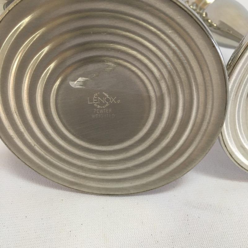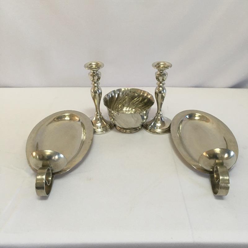 Lovely array of nice pewter includes pair of candlesticks made by Lenox, two wall sconces by Riverwood Pewter out of Dillsboro, NC and a Stieff Pewter bowl. All pieces are marked with brand and pewter. Local got up your home with these lovely pewter pieces. Bowl has scratches inside, see pictures. Sconces measure 7” x 15” x 4”.