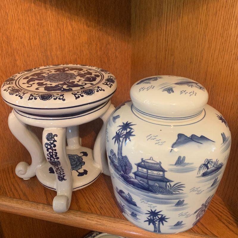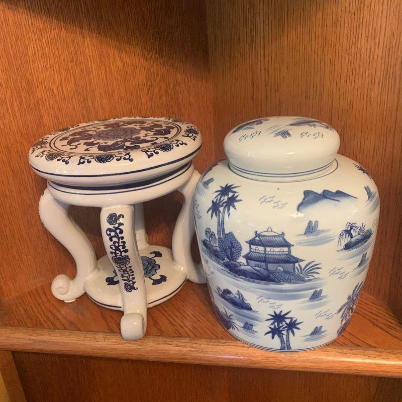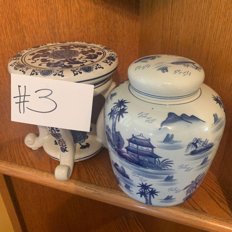 LOT 3 GINGER JAR AND PORCELAIN STAND