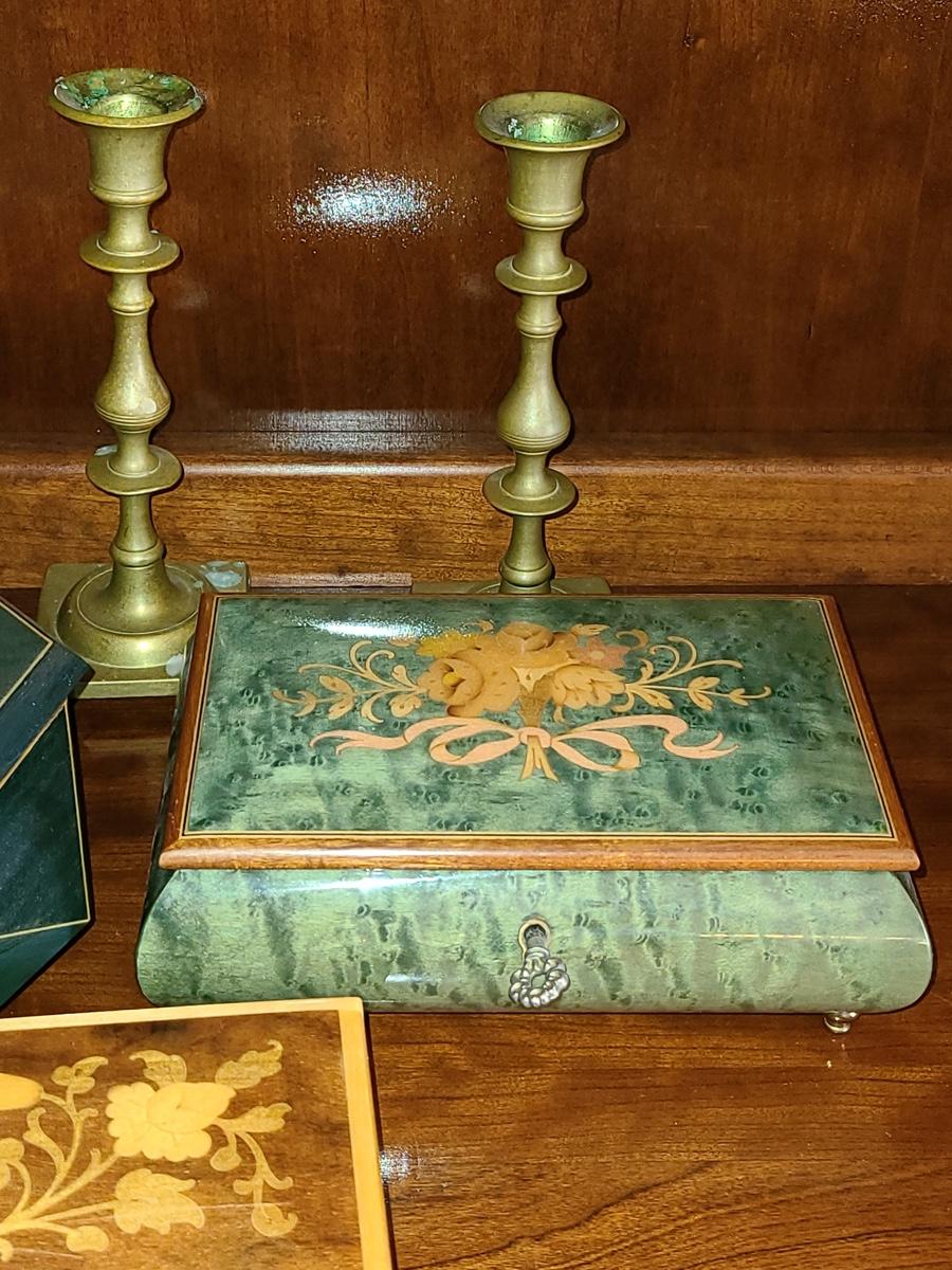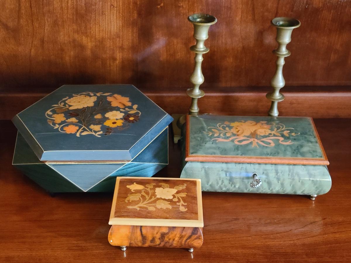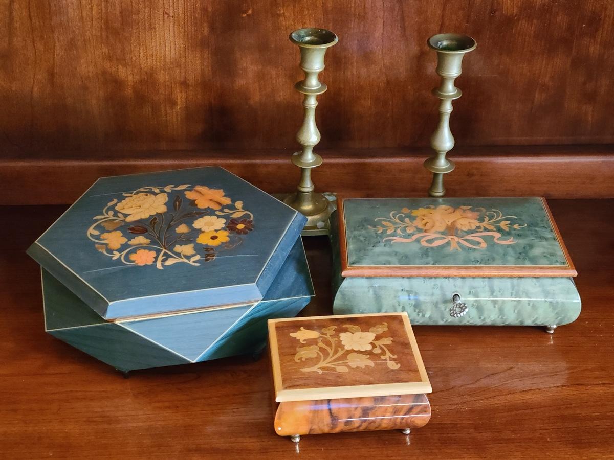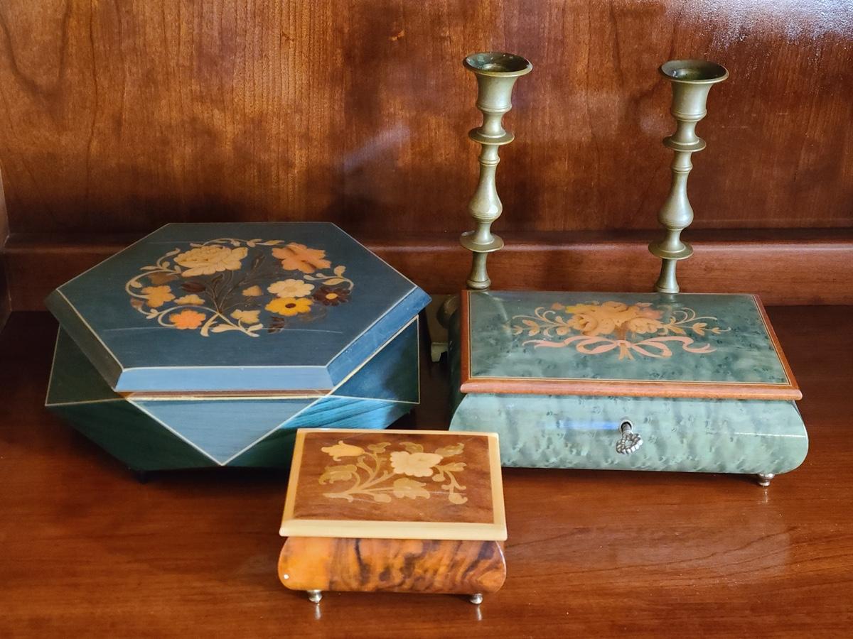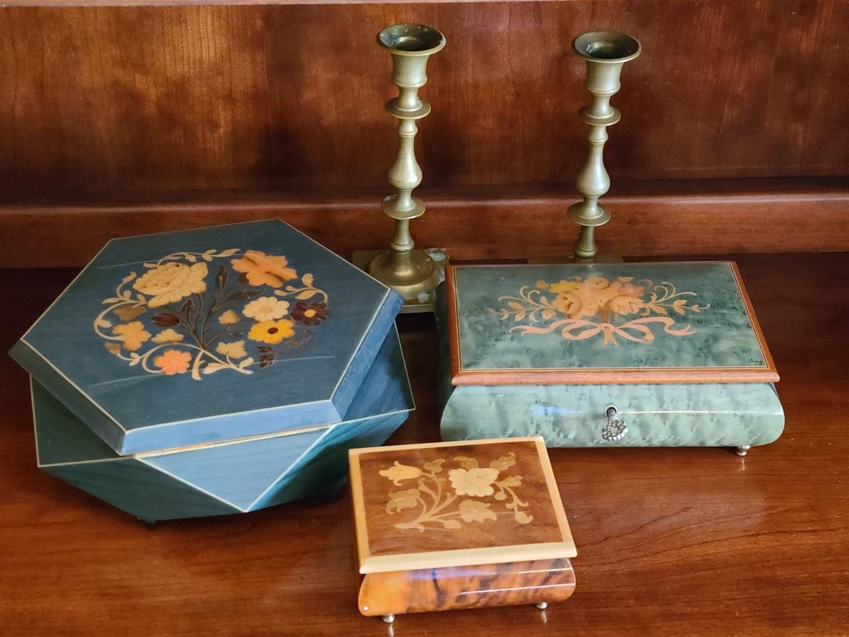 Three different music boxes, all work. The largest has age cracks on the topped the hinge needs a repair. Comes with a pair of brass candlesticks. Lovely and functional.