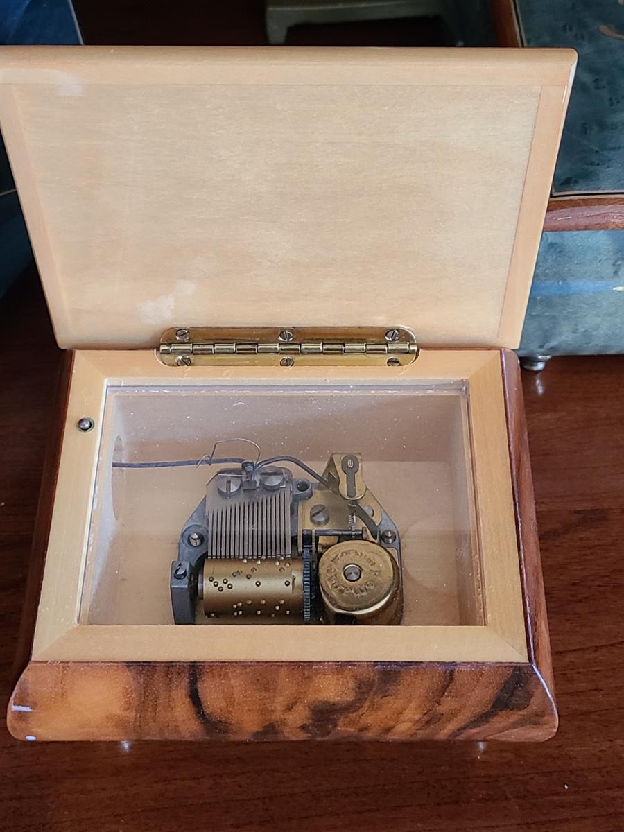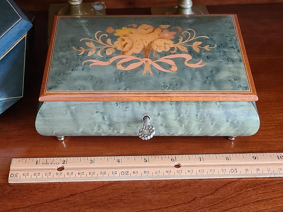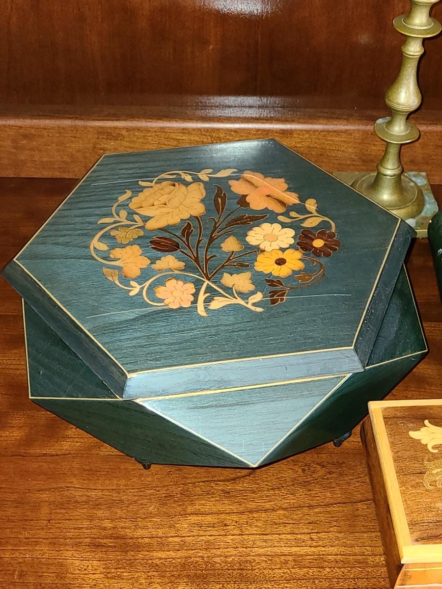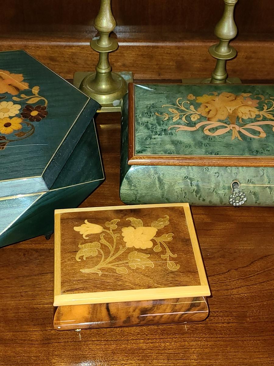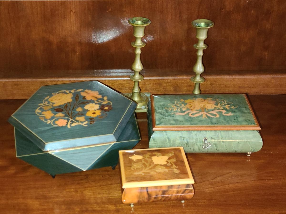 Three different music boxes, all work. The largest has age cracks on the topped the hinge needs a repair. Comes with a pair of brass candlesticks. Lovely and functional.