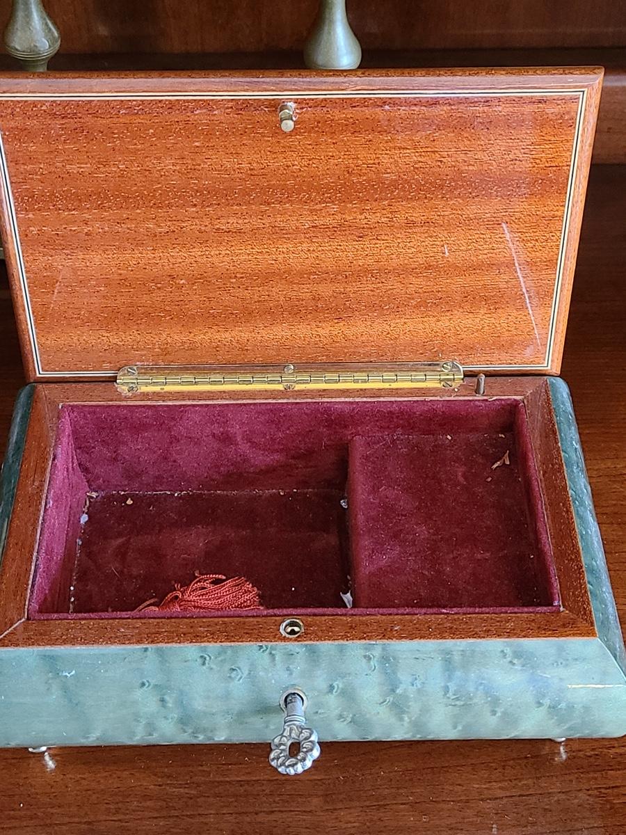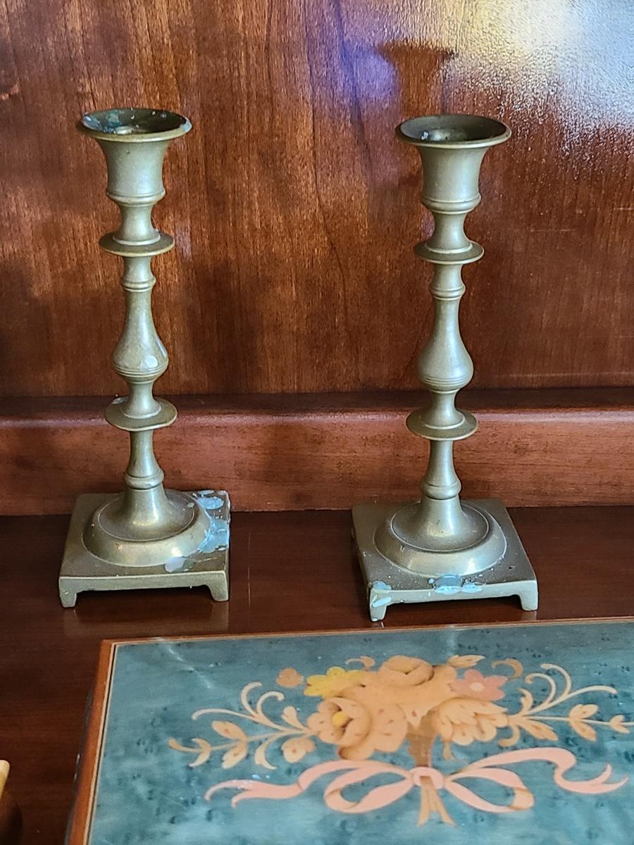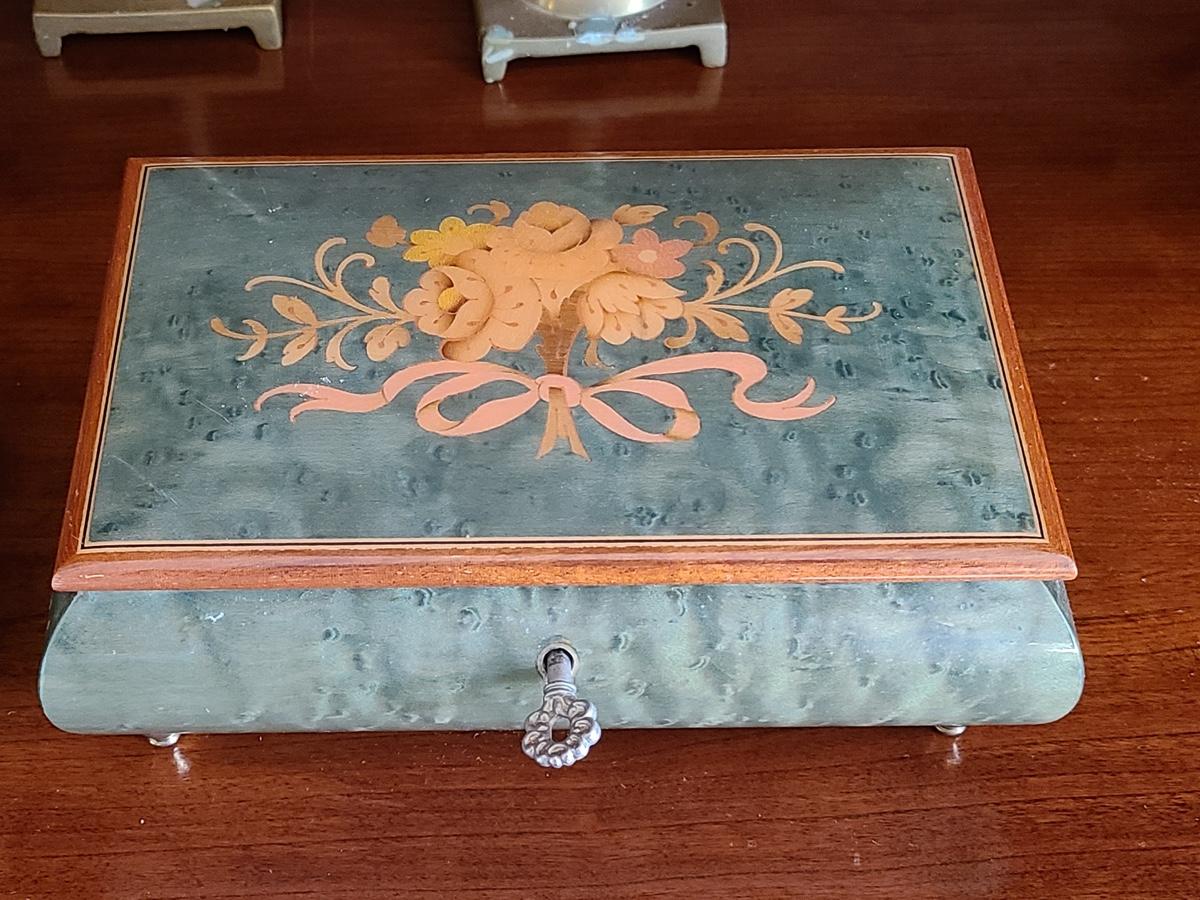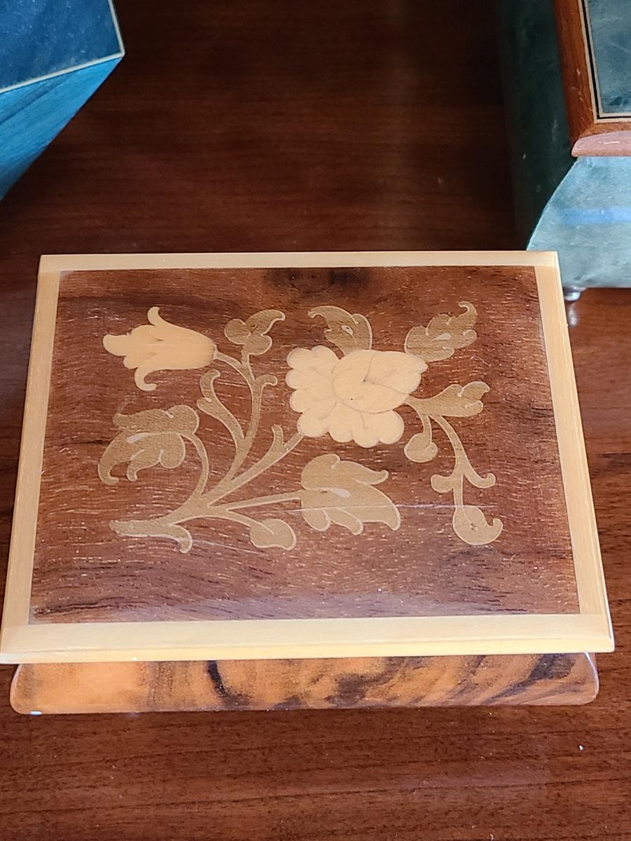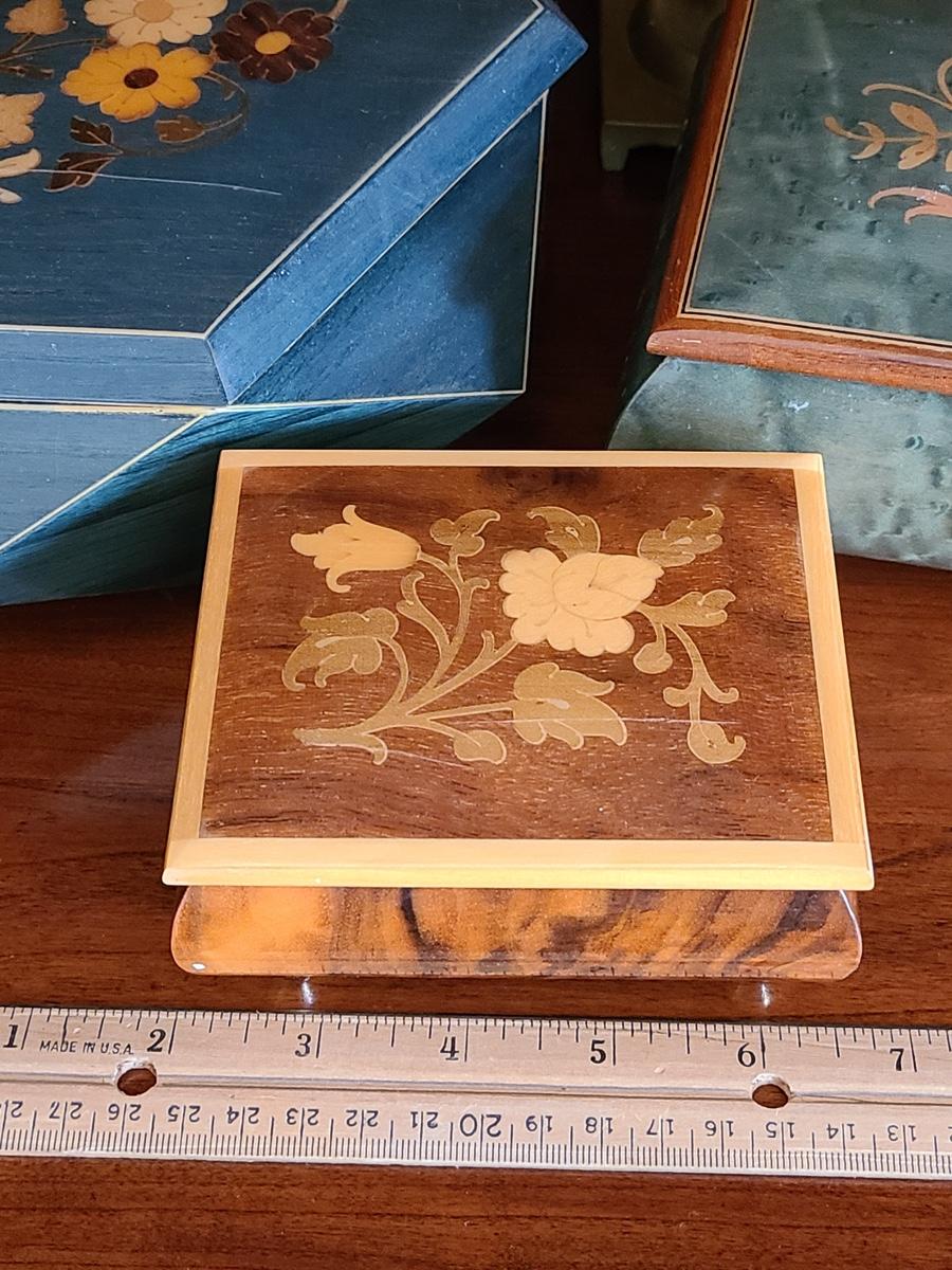 Three different music boxes, all work. The largest has age cracks on the topped the hinge needs a repair. Comes with a pair of brass candlesticks. Lovely and functional.