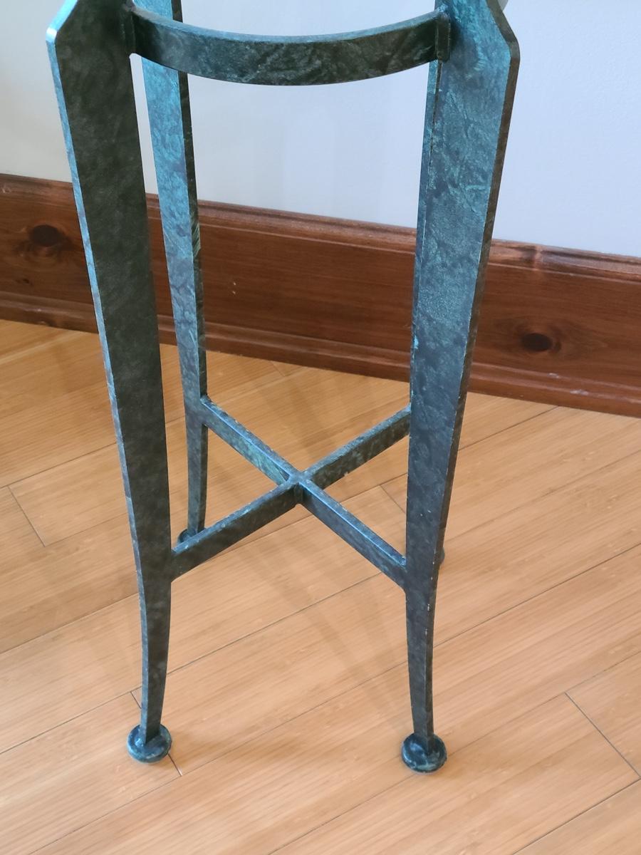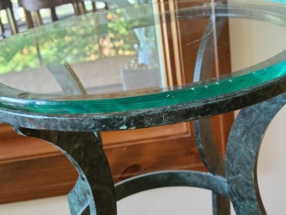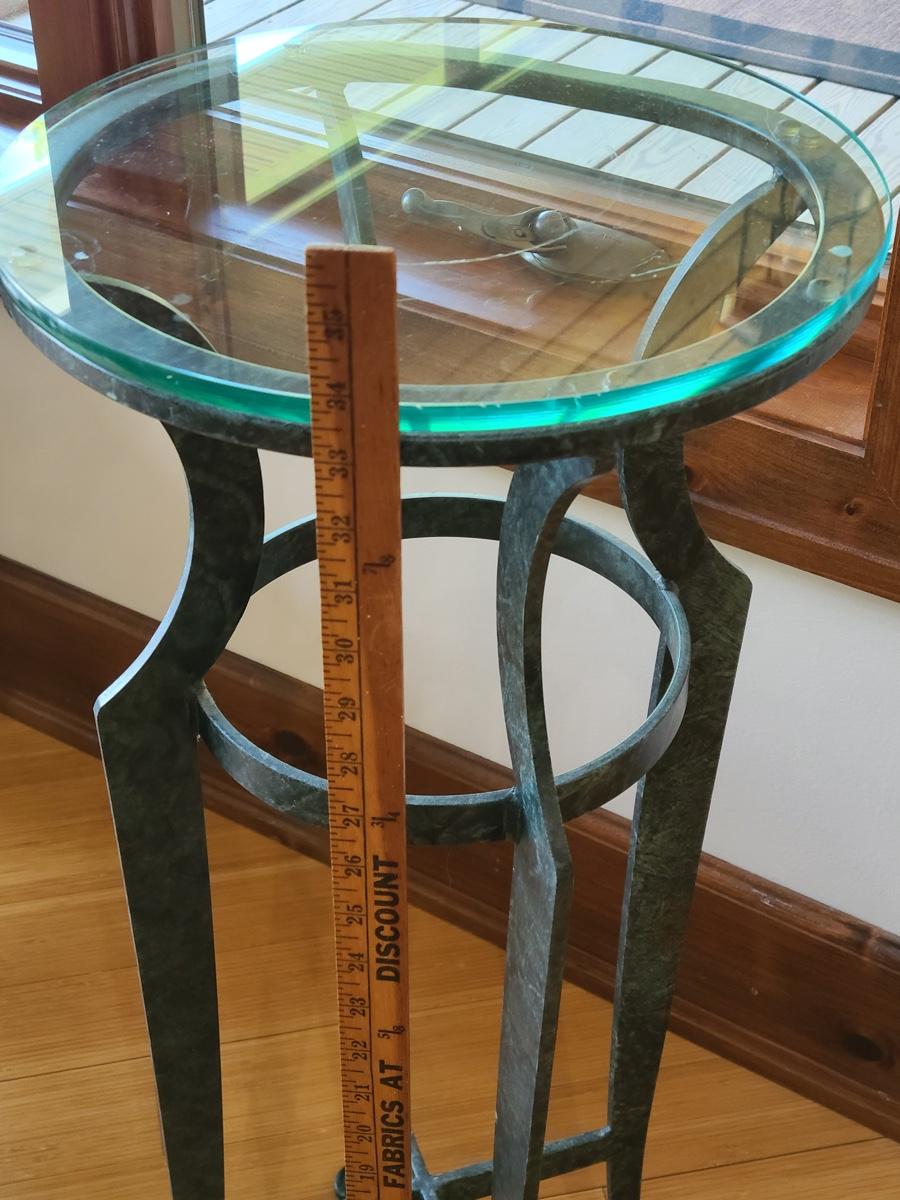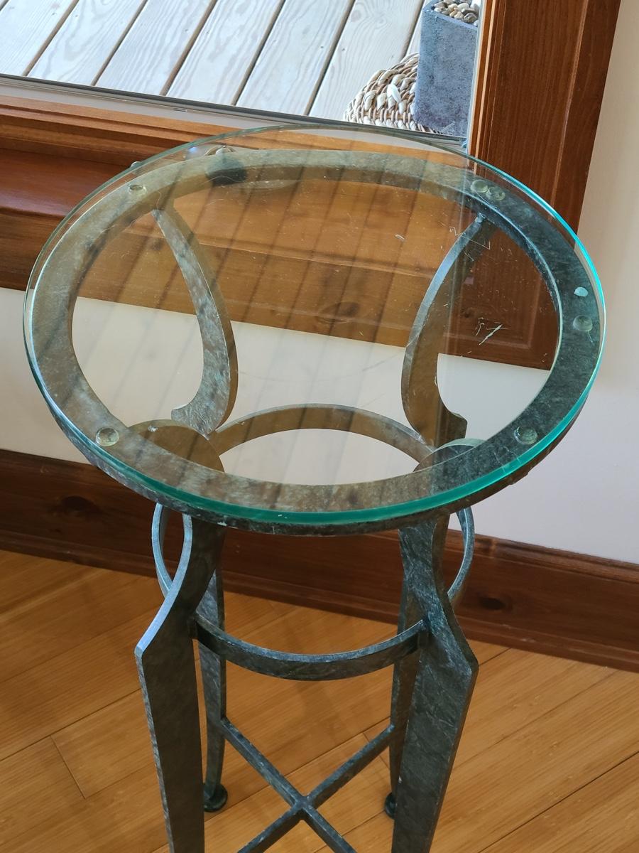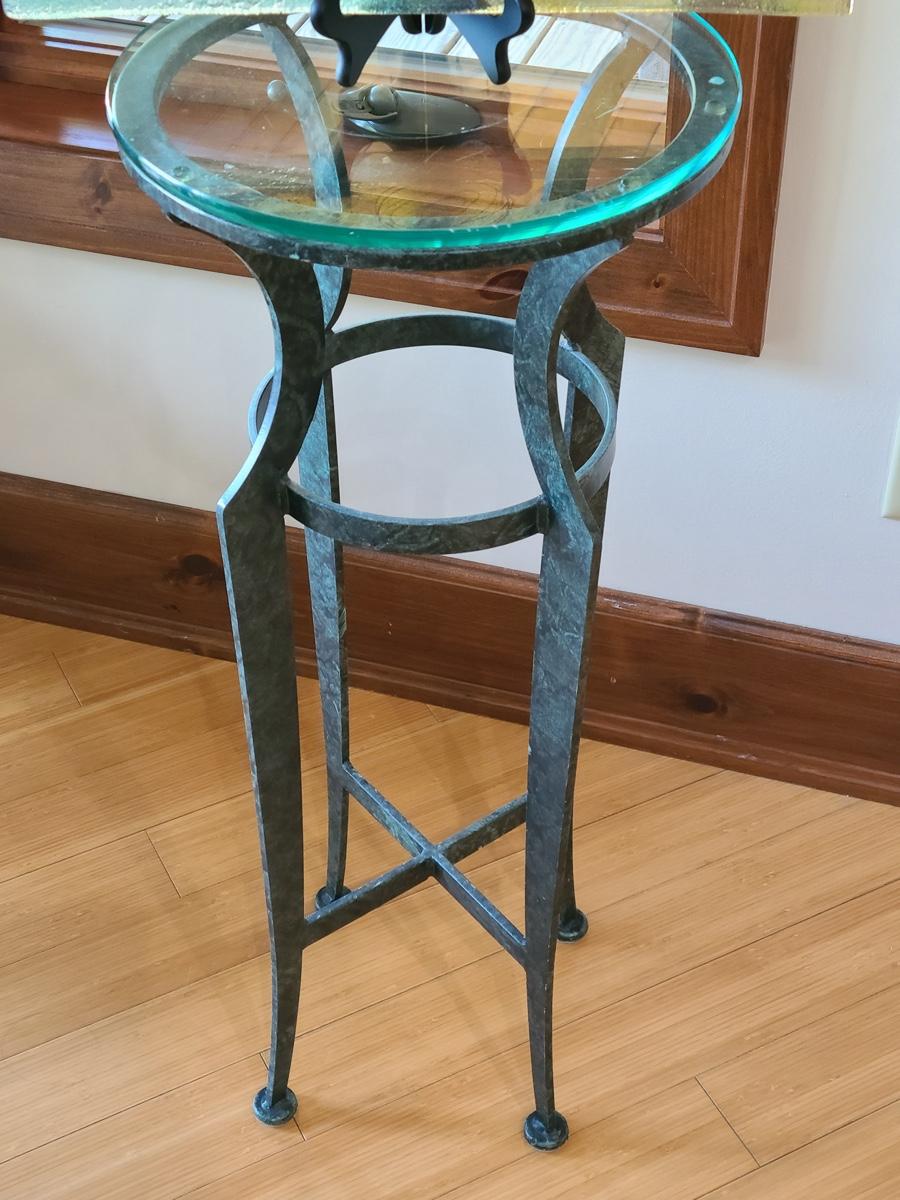 This lot is for a glass top (thick glass) vintage industrial designed table with green accents to the metal. It is heavy duty and is perfect as a plant stand, or vase table. It comes with the art glass tray that can be displayed or used for hors d'oeuvres. Please see all pictures as they are the best representation of the items. The pictures show condition, measurements if taken, and what is included in the lot. Due to the large amount that we photograph and the time frame, we are not always able to take measurements. All items unless noted, are pre-owned and have been used. If you purchased furniture, you must bring help. We do not allow one person to carry large furniture out on their own. Bring help, tools and a truck for the safety of our clients homes, and your personal safety. Company policy. Thank you.