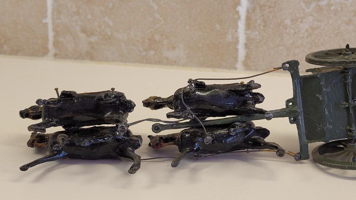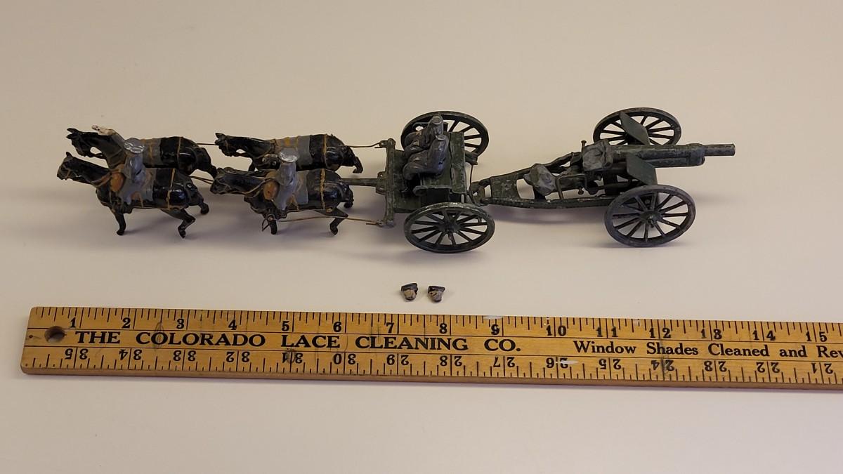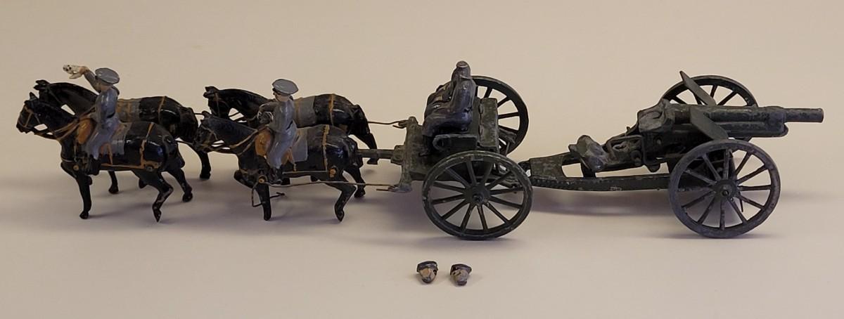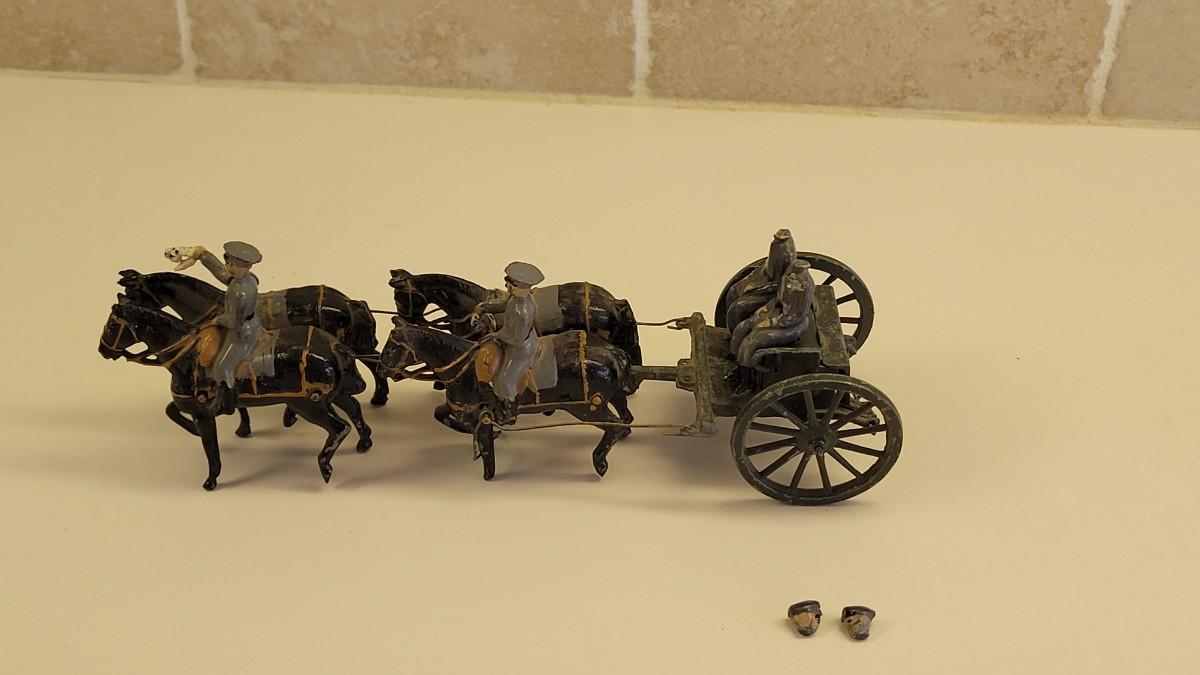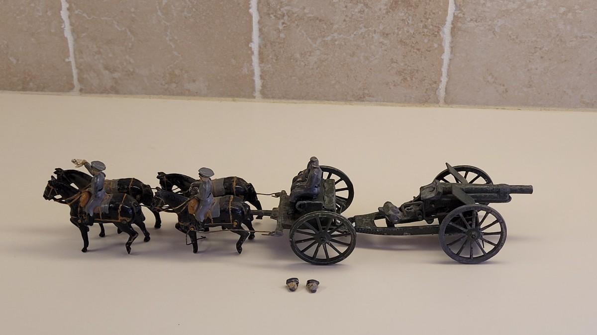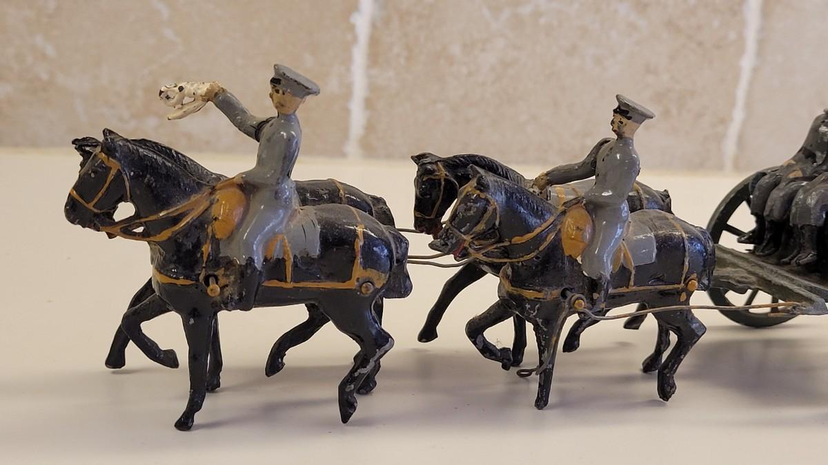 Lot 3: Late 1870's or Early 1880's Child's Cast Iron Cavalry Artillery Set with 4 Horses & 2 Riders, 2 Drivers Driving the Caisson Towing the Artillery Piece