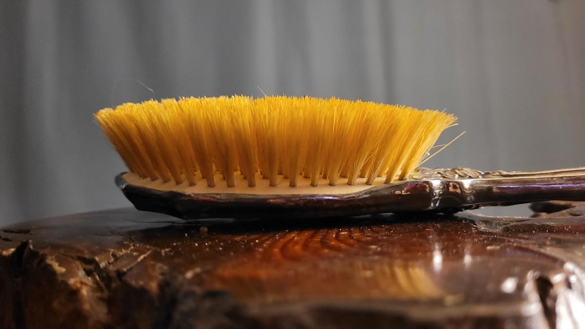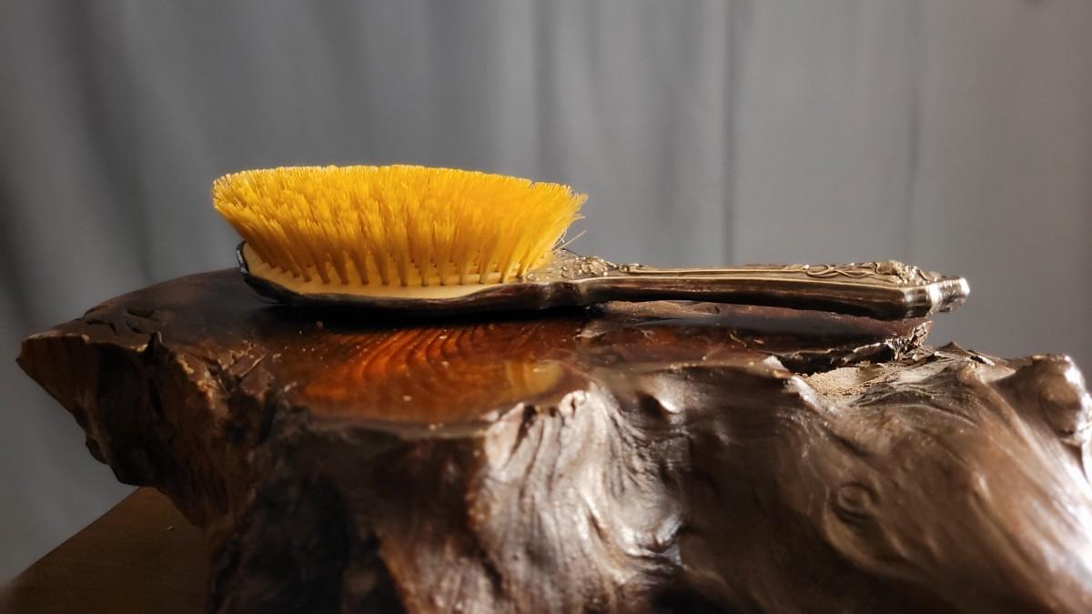 Vintage Silver Plated? Fancy Ladies Hair Brush with most of the original bristles intact. A great example with very little damage to the case and is not showing a monogram in center like many others.