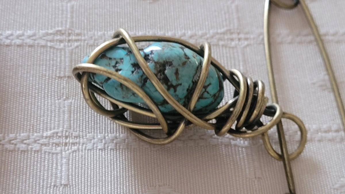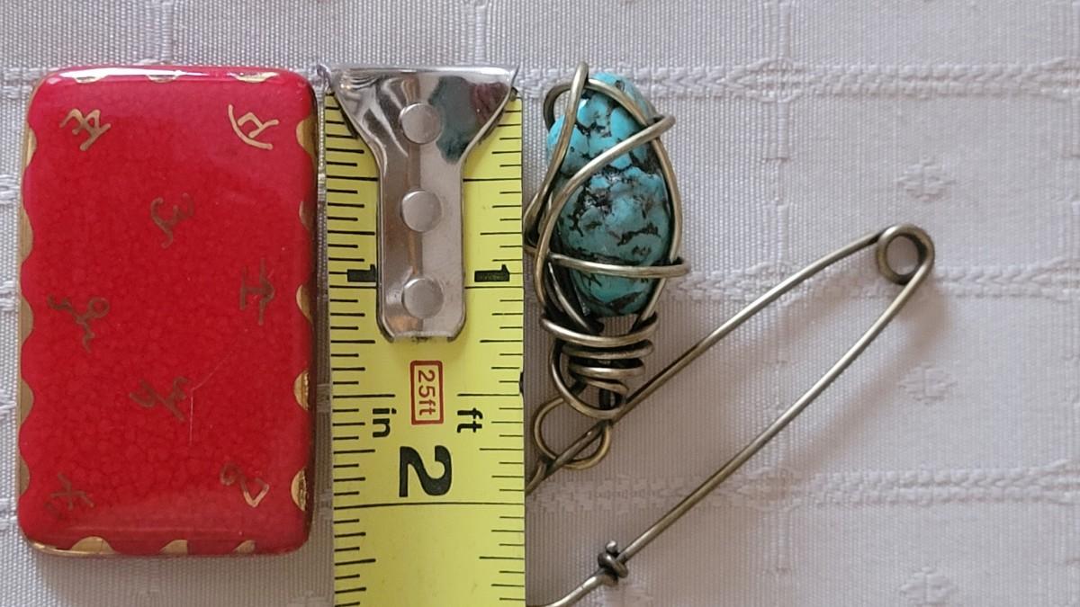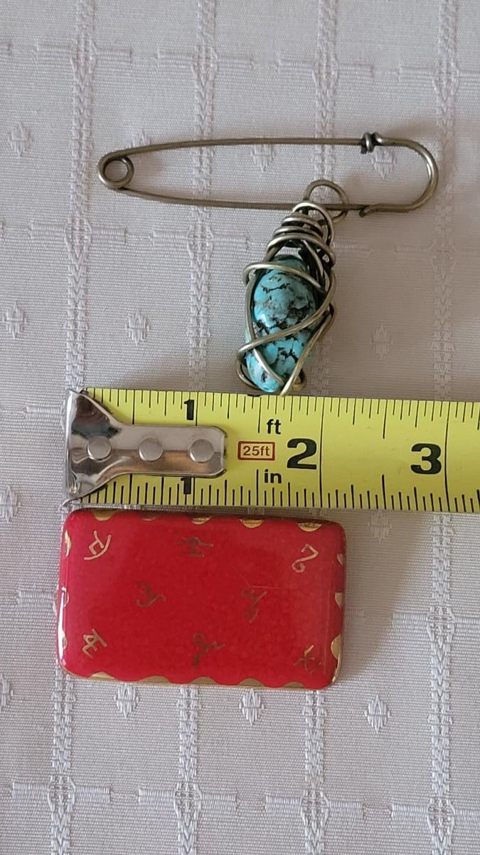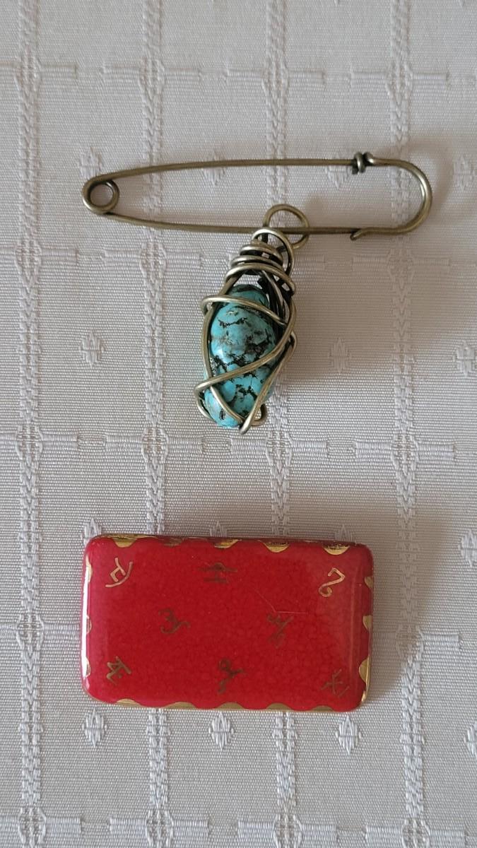 Red glazed ceramic brooch with southwest symbols. Large brass safety pin brooch with brass wire wrapped large raw turquoise stone.
