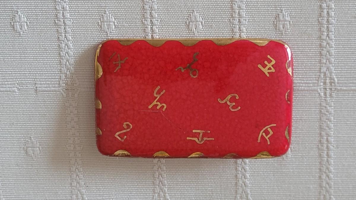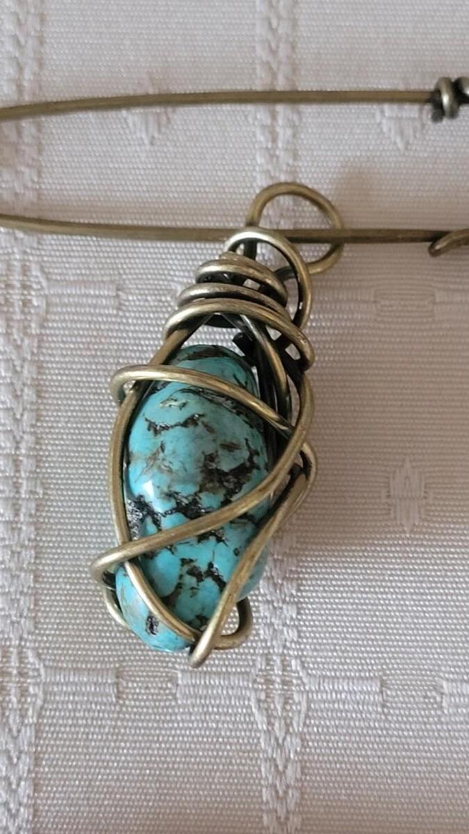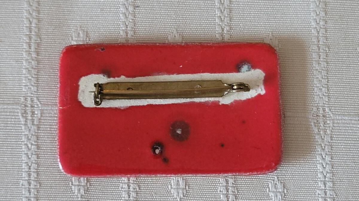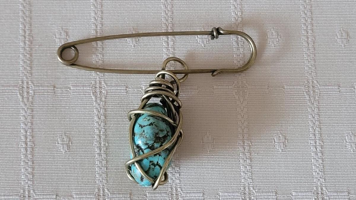 Red glazed ceramic brooch with southwest symbols. Large brass safety pin brooch with brass wire wrapped large raw turquoise stone.