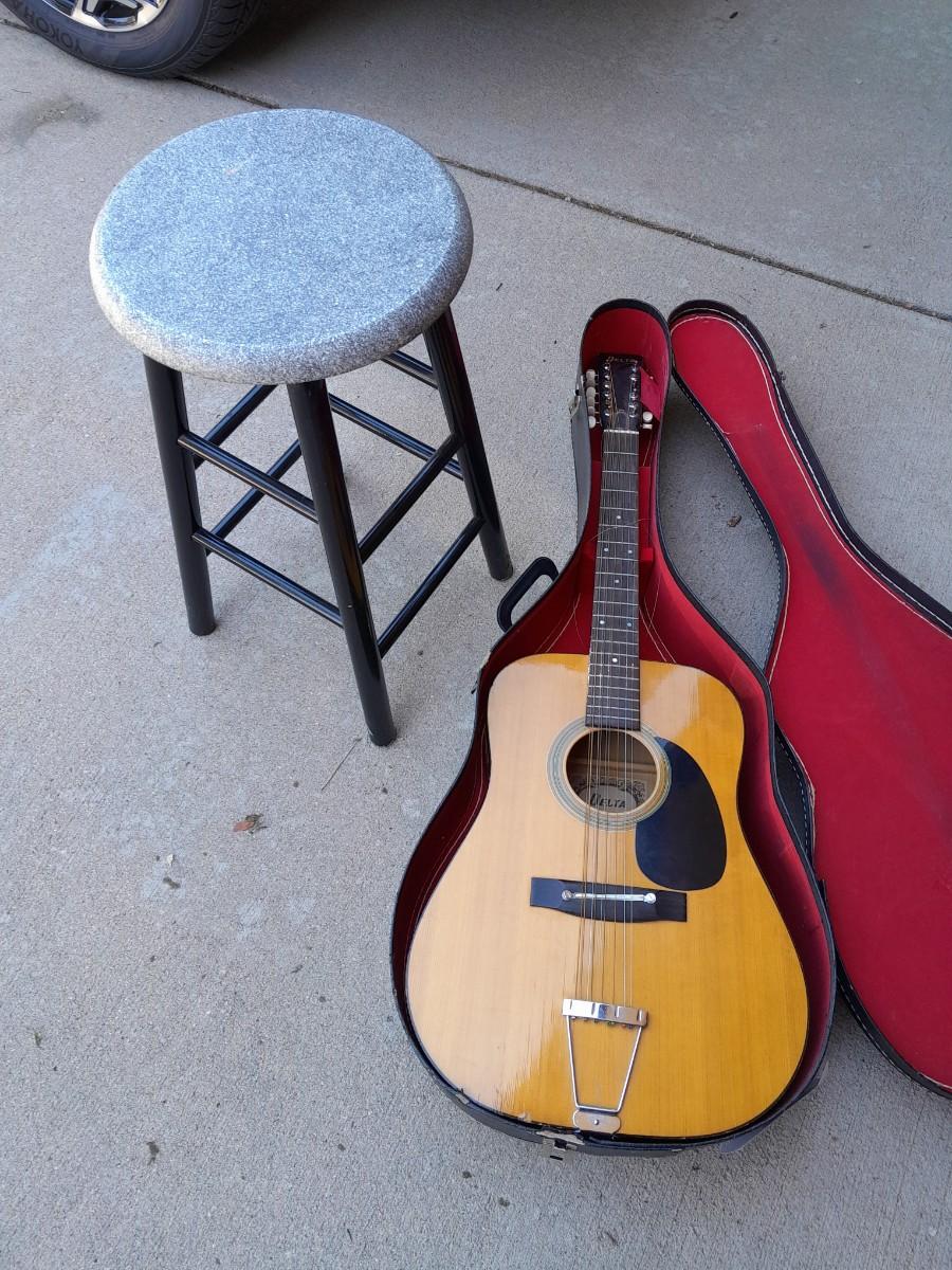 LOT 3  DELTA ACOUSTIC GUITAR WITH HARDSIDED CASE AND STOOL