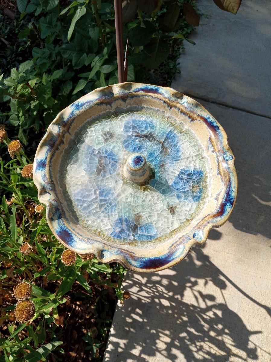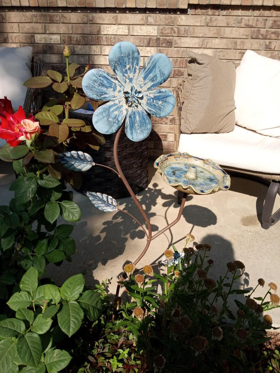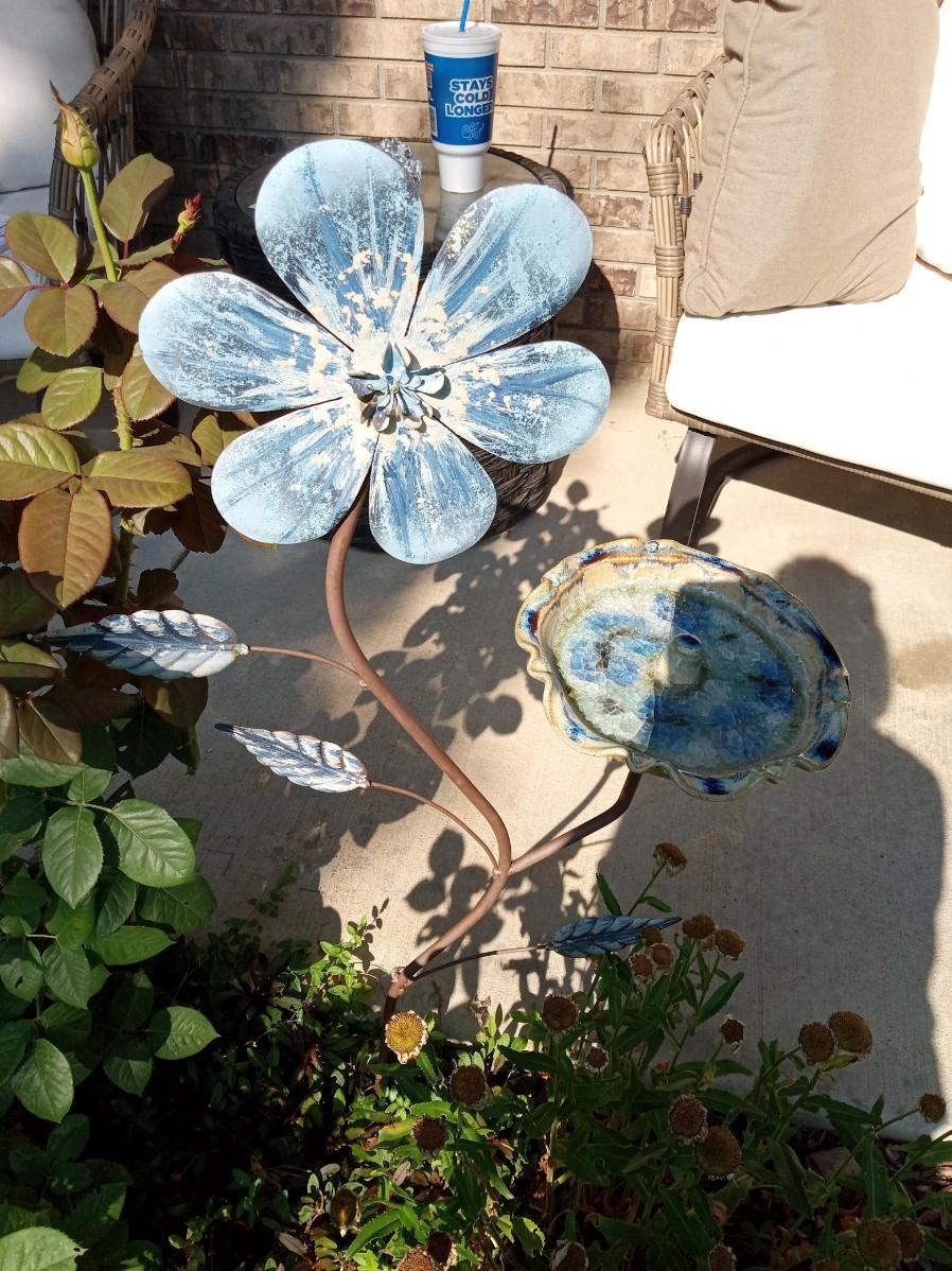 LOT 3  STAKED METAL FLOWER WITH A BLUE GLAZE